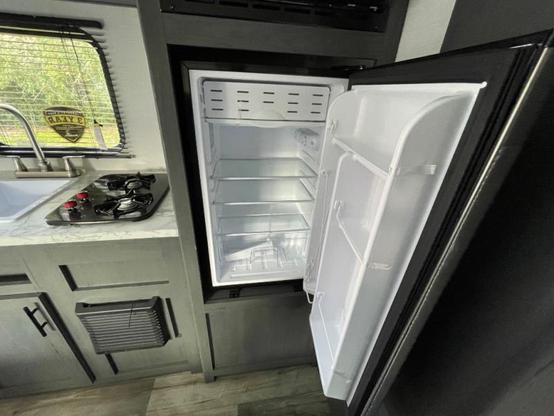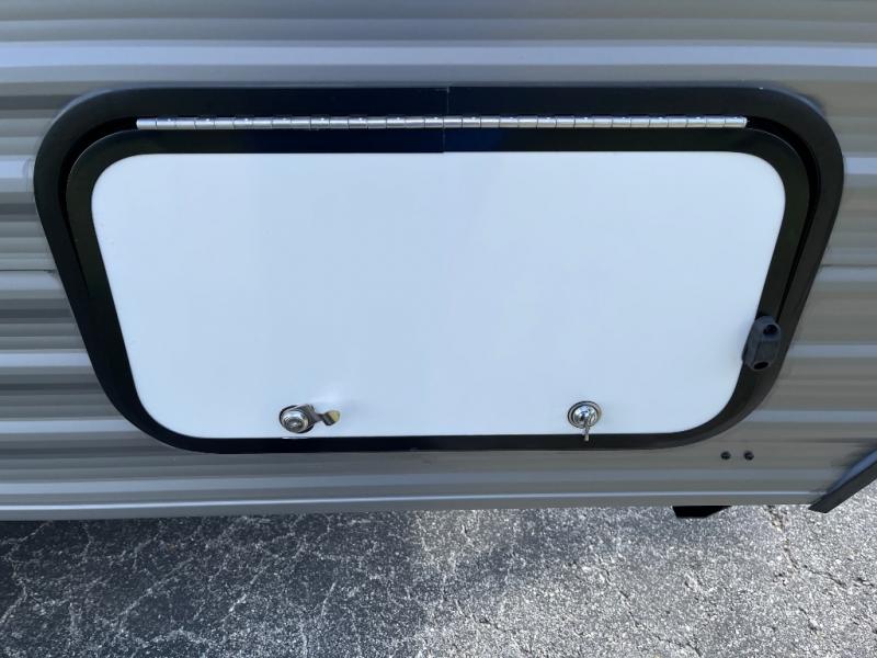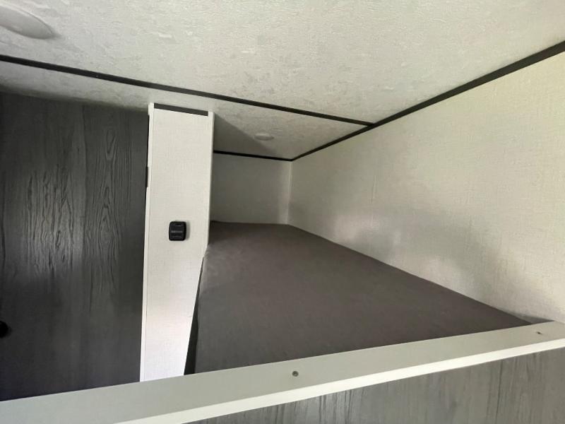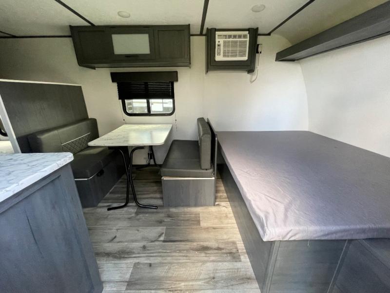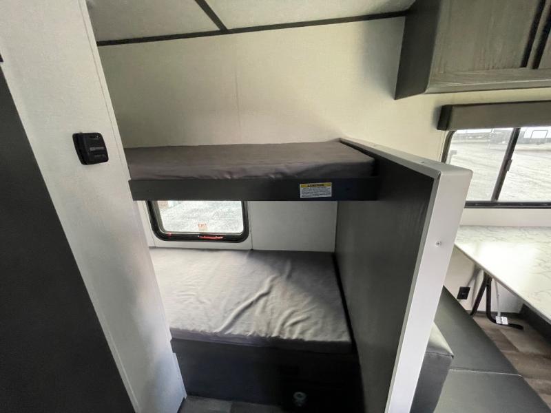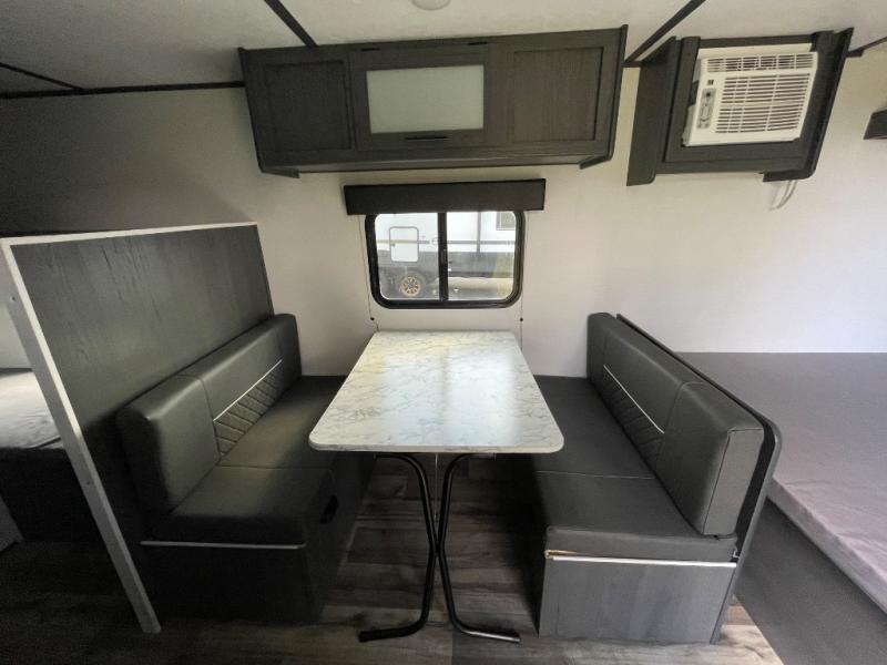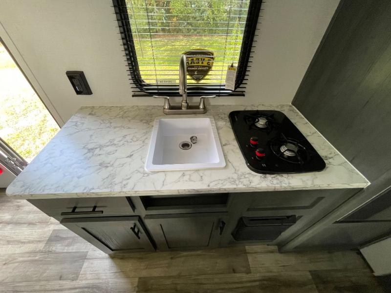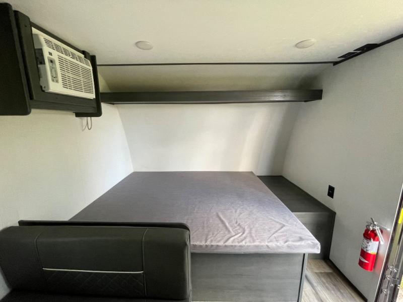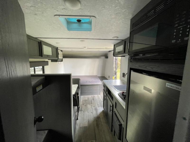 A perfect trailer for your family of 3-5 featuring a set of bunk beds for the kids, a queen bed up front for you, and the booth dinette that can be converted to sleep one or two more depending on size. This unit is cozy and convenient providing you just what you need to enjoy a little adventure away from home. For meals, there is a two burner cooktop and sink, plus a 3.3 cu. ft. refrigerator for your perishables. Overhead cabinetry can be found along both sides for your dishes and things. You will all appreciate the convenience of having your own private shower and toilet so that you don't need to use the campground facilities at night. There is also a skylight over the shower for added head room and natural lighting as well. If you enjoy spending time outside, an 8' awning is available to provide even more living space outdoors!