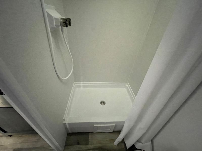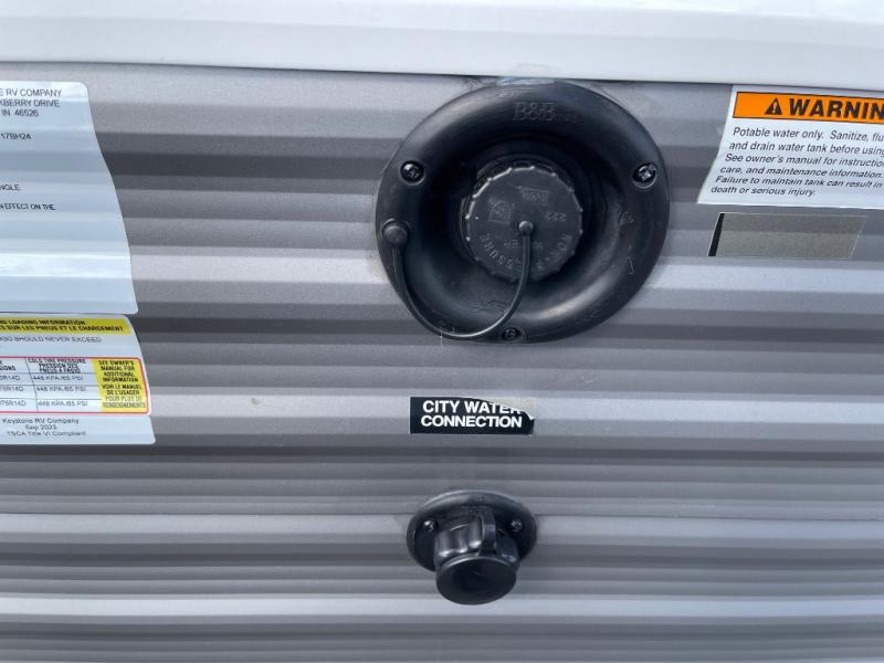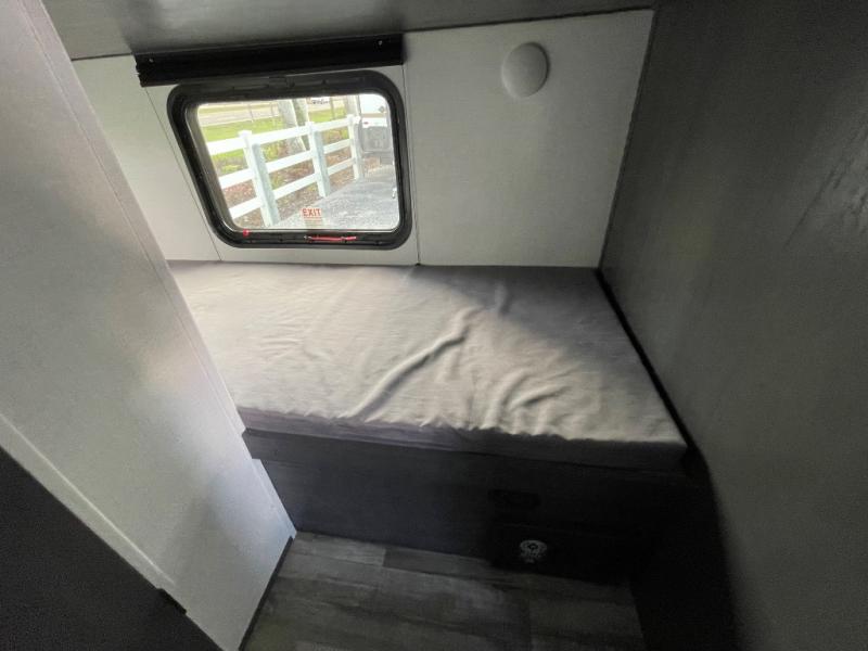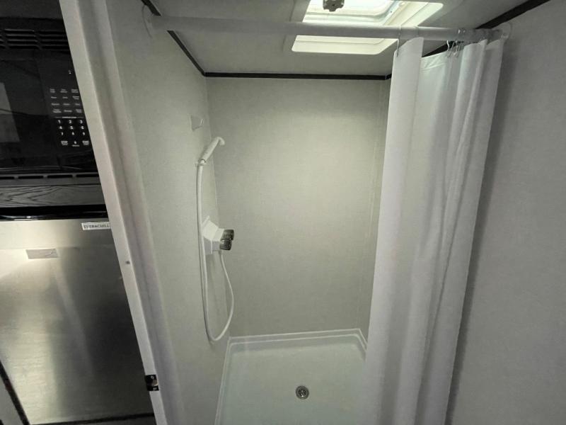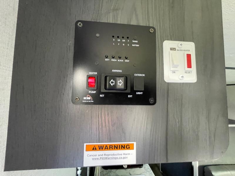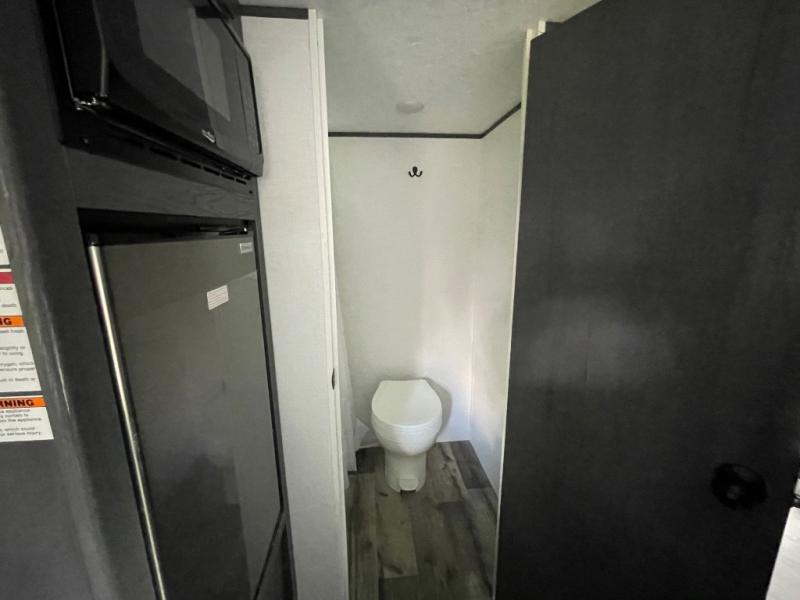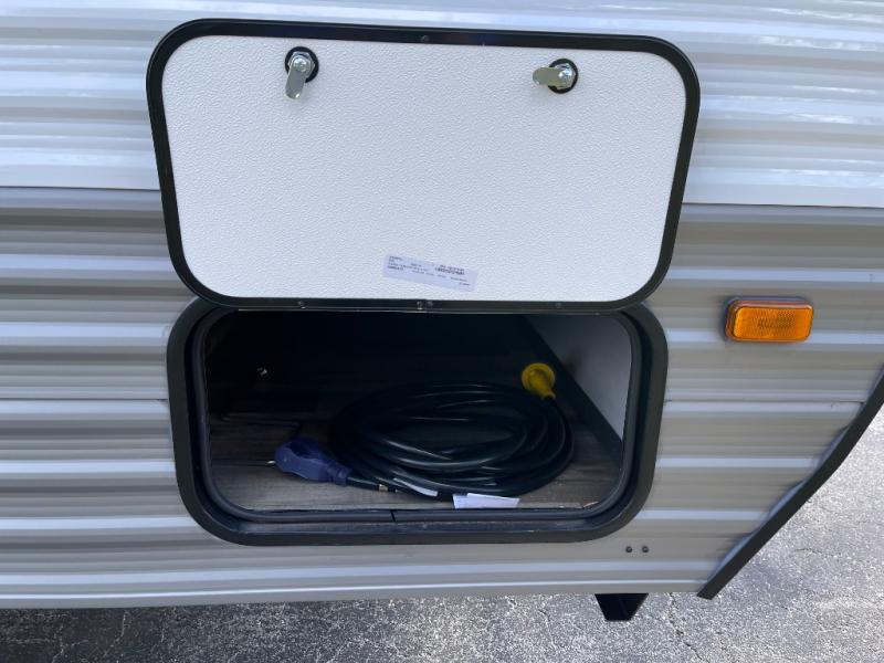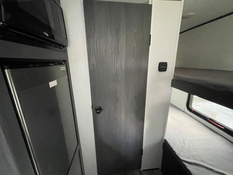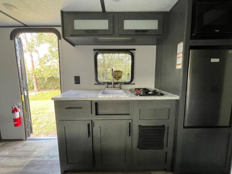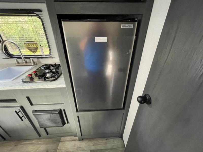 A perfect trailer for your family of 3-5 featuring a set of bunk beds for the kids, a queen bed up front for you, and the booth dinette that can be converted to sleep one or two more depending on size. This unit is cozy and convenient providing you just what you need to enjoy a little adventure away from home. For meals, there is a two burner cooktop and sink, plus a 3.3 cu. ft. refrigerator for your perishables. Overhead cabinetry can be found along both sides for your dishes and things. You will all appreciate the convenience of having your own private shower and toilet so that you don't need to use the campground facilities at night. There is also a skylight over the shower for added head room and natural lighting as well. If you enjoy spending time outside, an 8' awning is available to provide even more living space outdoors!
