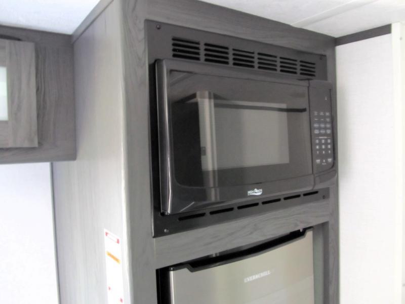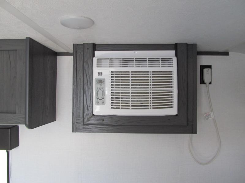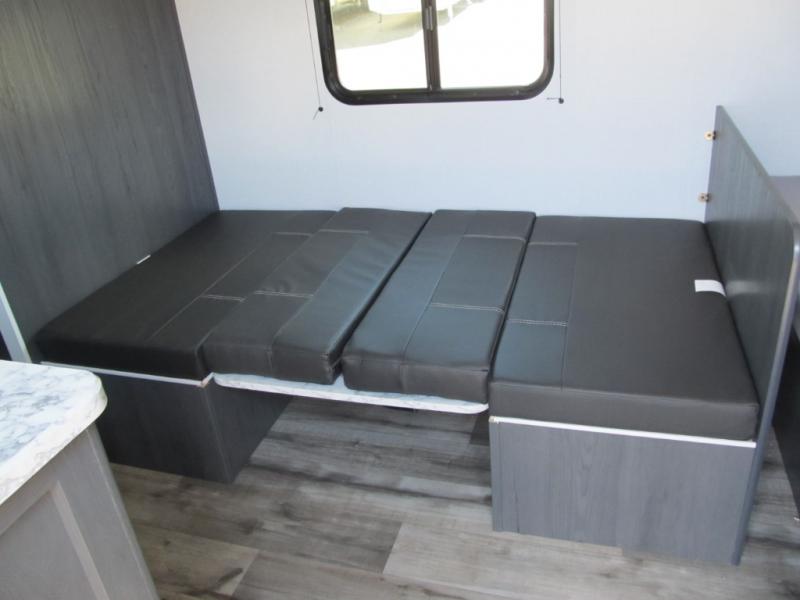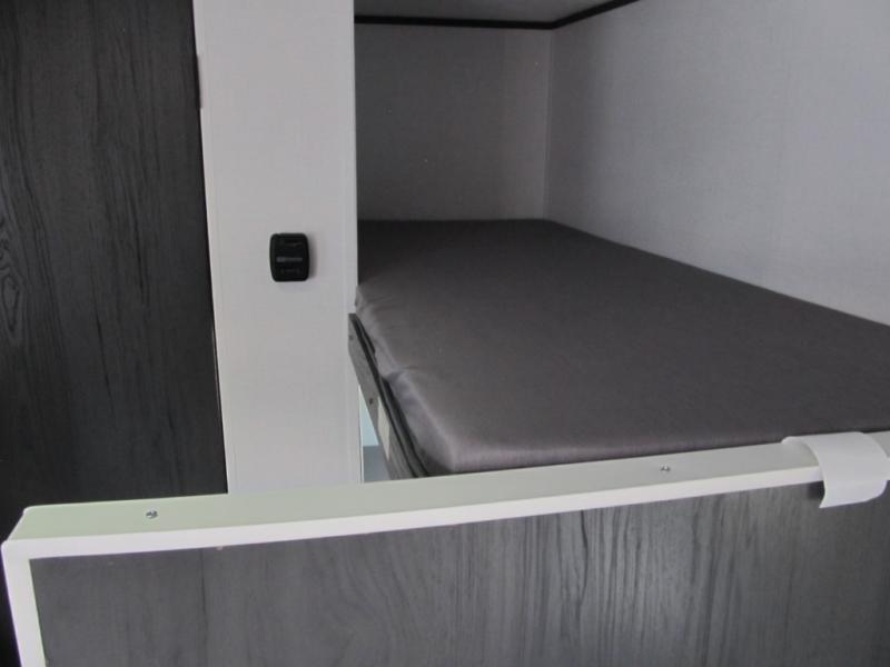 A perfect trailer for your family of 3-5 featuring a set of bunk beds for the kids, a queen bed up front for you, and the booth dinette that can be converted to sleep one or two more depending on size. This unit is cozy and convenient providing you just what you need to enjoy a little adventure away from home. For meals, there is a two burner cooktop and sink, plus a 3.3 cu. ft. refrigerator for your perishables. Overhead cabinetry can be found along both sides for your dishes and things. You will all appreciate the convenience of having your own private shower and toilet so that you don't need to use the campground facilities at night. There is also a skylight over the shower for added head room and natural lighting as well. If you enjoy spending time outside, an 8' awning is available to provide even more living space outdoors!