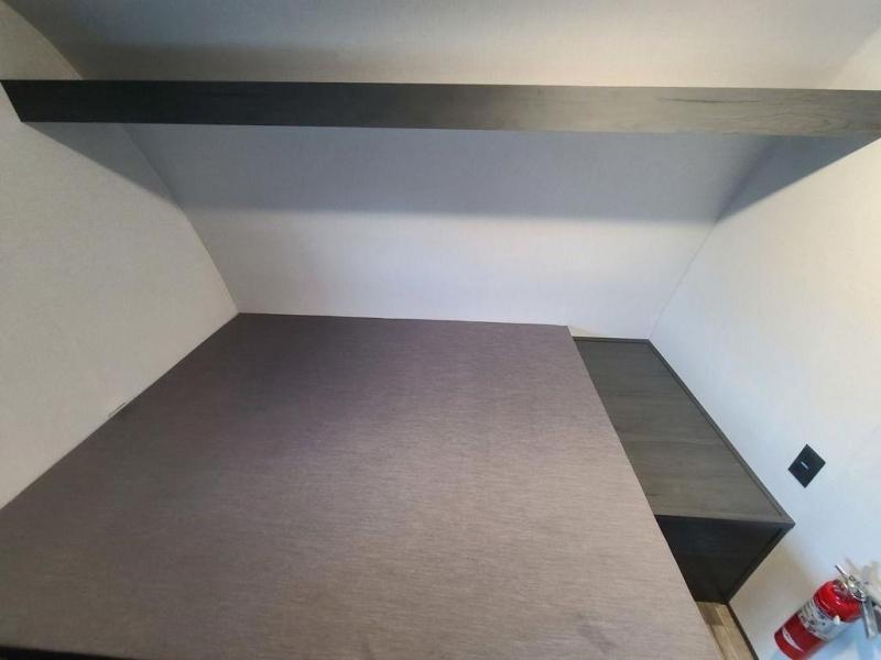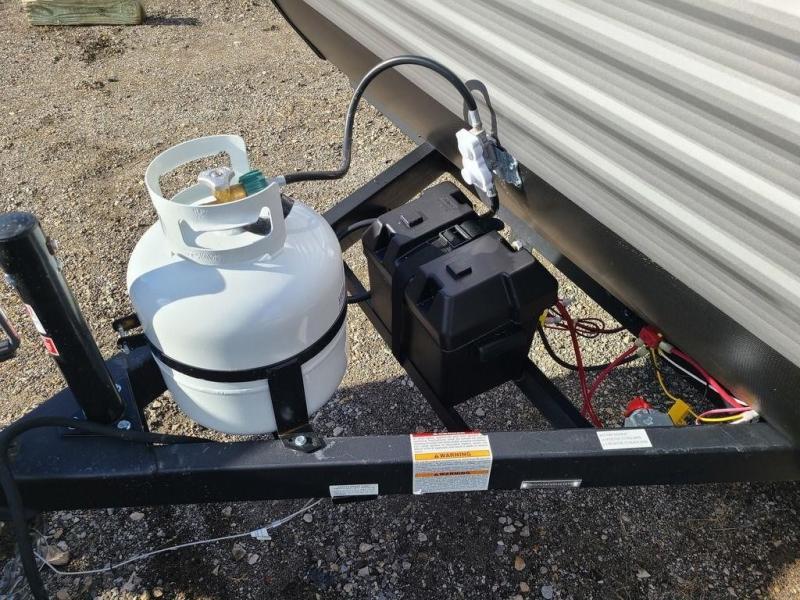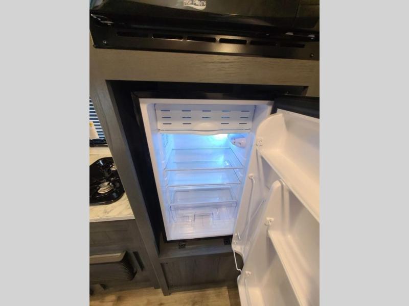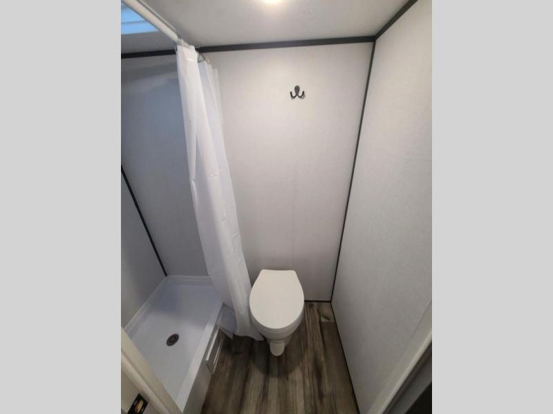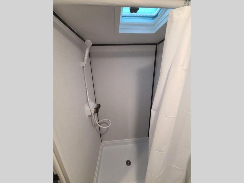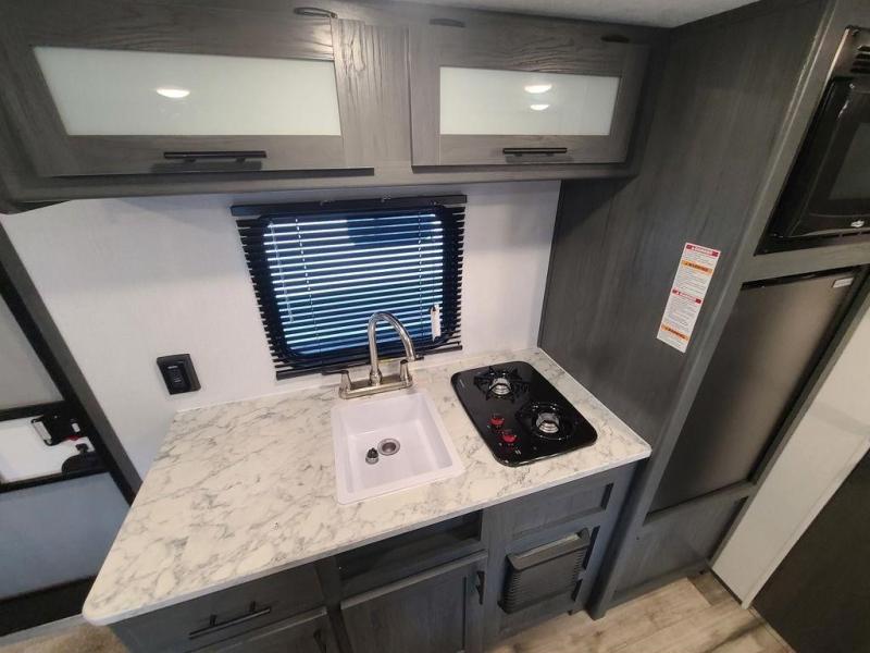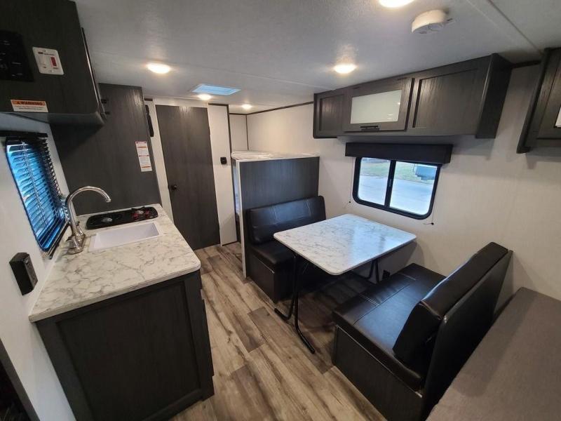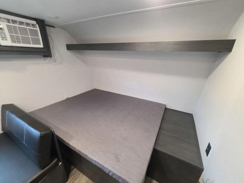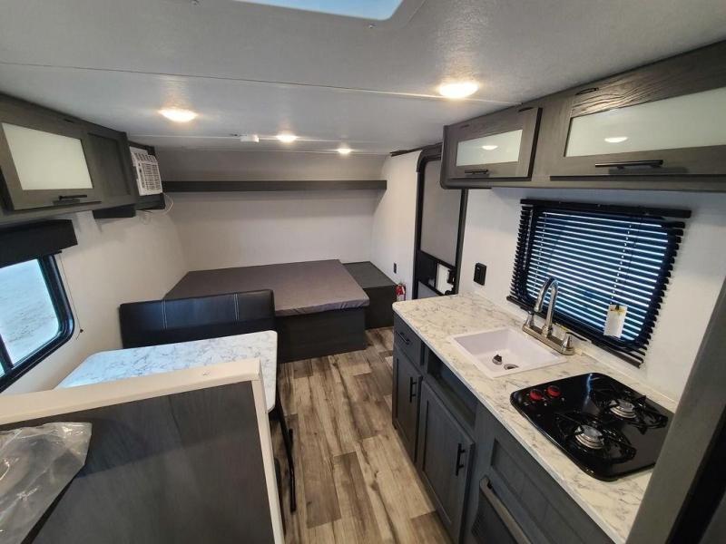 A perfect trailer for your family of three to five featuring a set of bunk beds for the kids, a queen bed up front for you, and the booth dinette that can be converted to sleep one or two more depending on size. For meals, there is a two burner cooktop and sink, plus a 3.3 cu. ft. refrigerator for your perishables. Overhead cabinetry can be found along both sides for your dishes and things. You will all appreciate the convenience of having your own private shower and toilet so that you don't need to use the campground facilities at night. If you enjoy spending time outside, an awning is available to provide even more living space outdoors!
