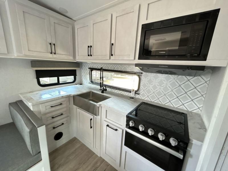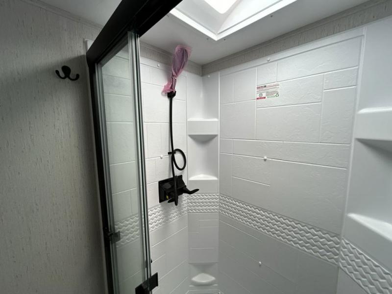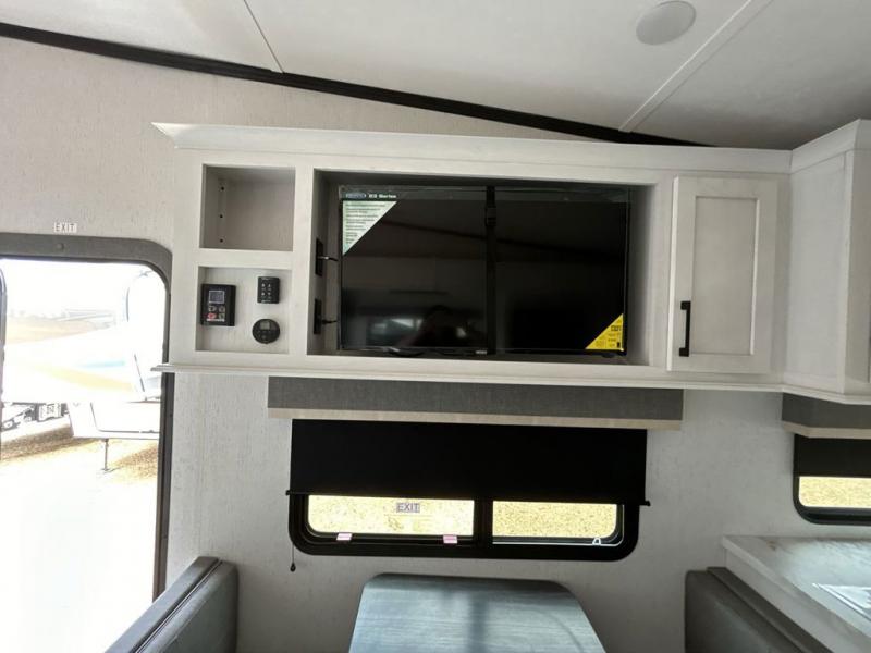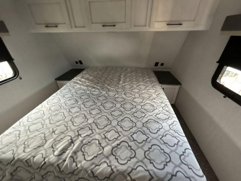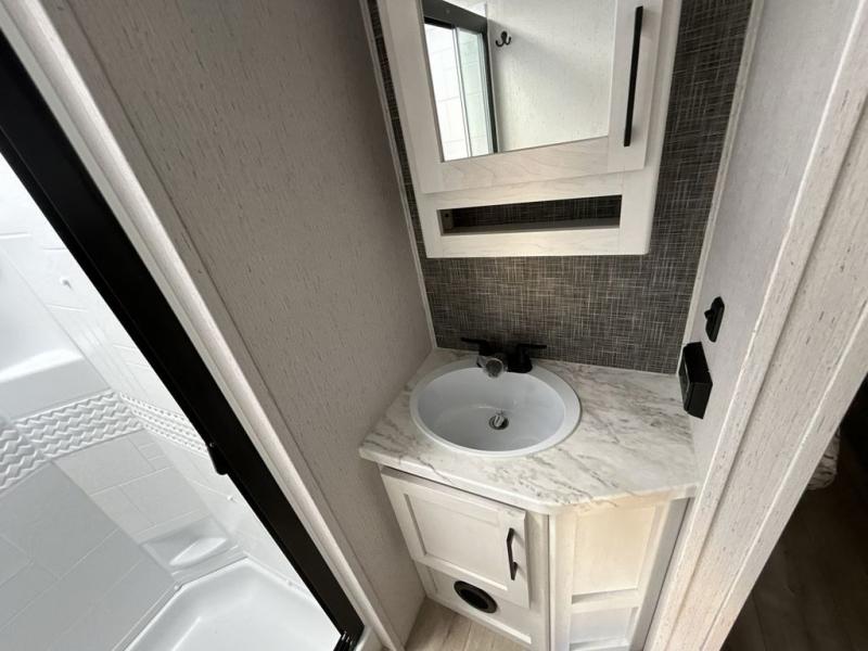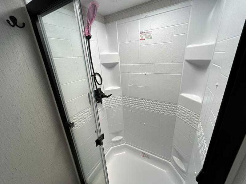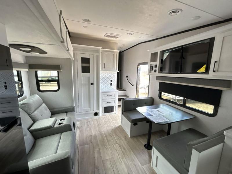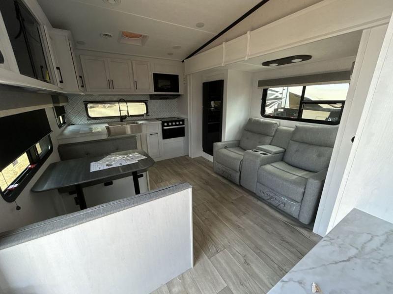 The chef will have an easy time preparing delicious meals in the rear kitchen of this fifth wheel! Enjoy your meals at the booth dinette, and after you have washed the dishes in the farm style sink, you can store them in the hutch. The sofa slide offers a comfortable place to relax at night and is conveniently next to the 10 cu. ft. refrigerator so you don't have to go far for a refreshing beverage. After a fun day at the beach head to the full bathroom to rinse the sand out of your hair in the walk-in shower with skylight for added natural lighting. The front private bedroom has a queen bed with closets on either side for your clothes, and there is even a closet with washer and dryer prep!