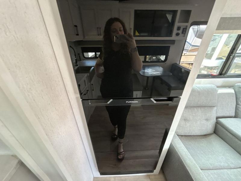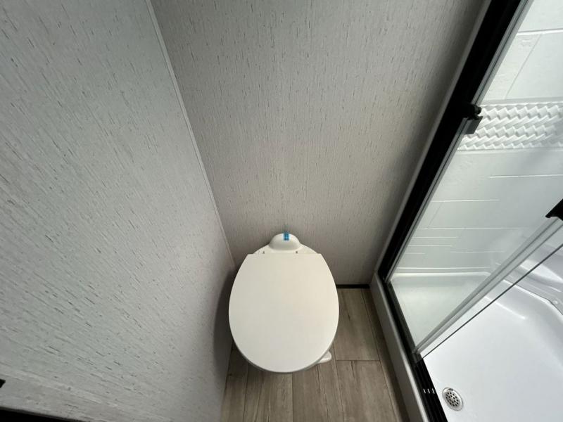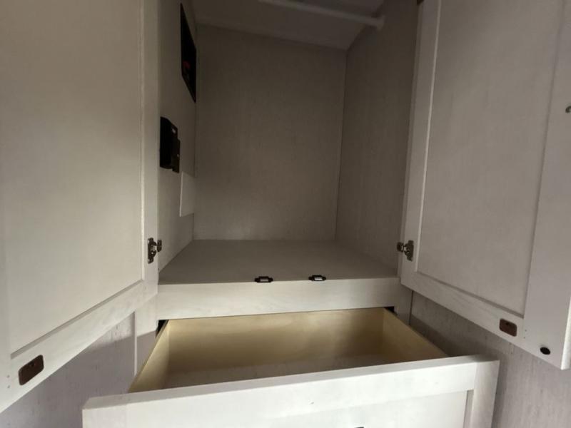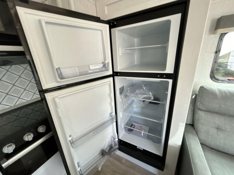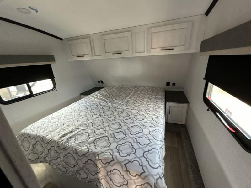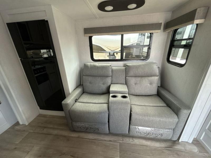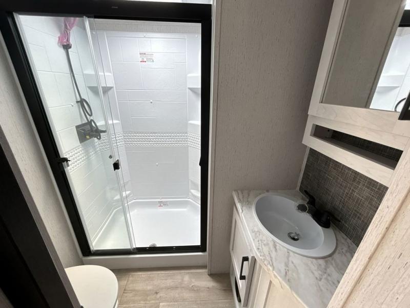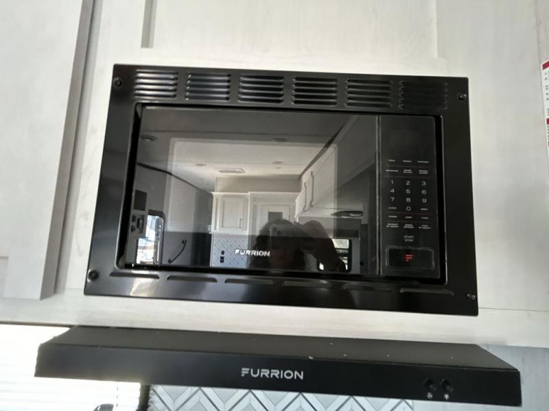 The chef will have an easy time preparing delicious meals in the rear kitchen of this fifth wheel! Enjoy your meals at the booth dinette, and after you have washed the dishes in the farm style sink, you can store them in the hutch. The sofa slide offers a comfortable place to relax at night and is conveniently next to the 10 cu. ft. refrigerator so you don't have to go far for a refreshing beverage. After a fun day at the beach head to the full bathroom to rinse the sand out of your hair in the walk-in shower with skylight for added natural lighting. The front private bedroom has a queen bed with closets on either side for your clothes, and there is even a closet with washer and dryer prep!
