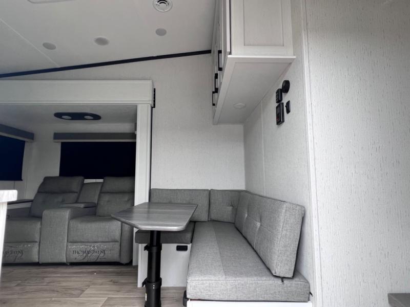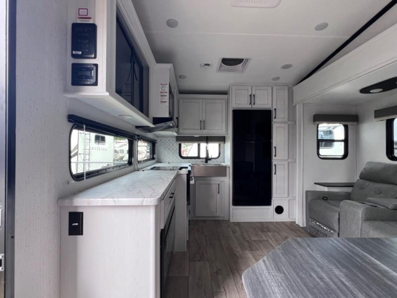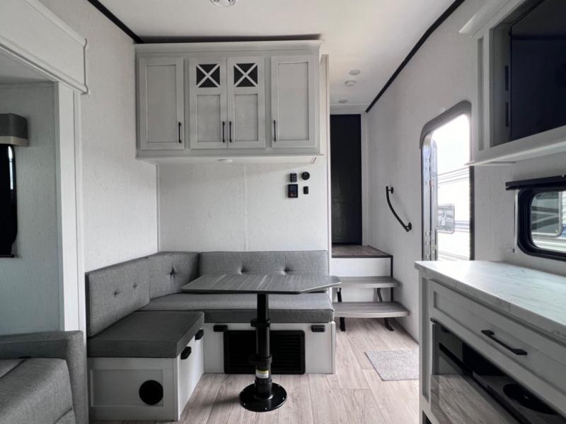 Plan to say awhile in this rear kitchen fifth wheel! You will fall in love with the front bedroom with a king bed slide out, large front closet, a dresser, plus a mounted TV for movies in bed. The rear kitchen includes plenty of space to prep meals, a farm style sink, plus a 10 cu. ft. 12V refrigerator and a pantry for food storage! You can get cozy on the theater seating slide out or at the cafe dinette, and the LED TV will ensure you'll never go bored on rainy days!