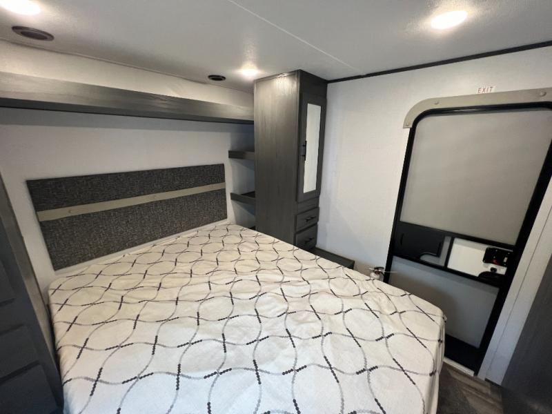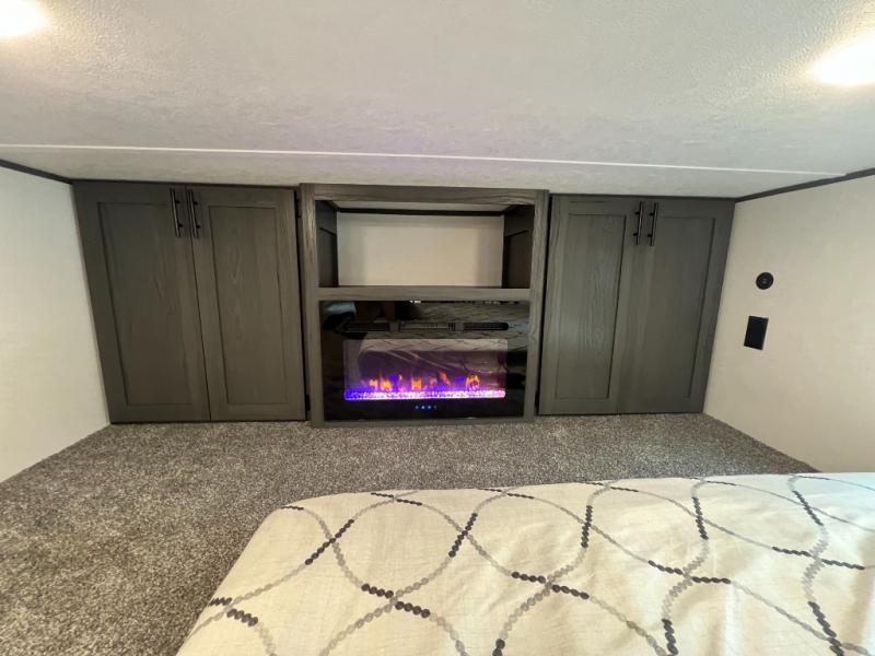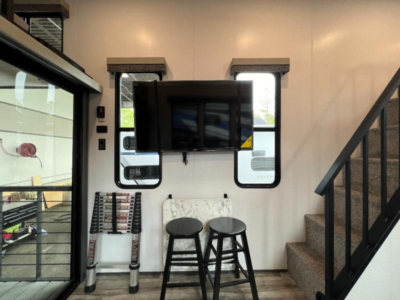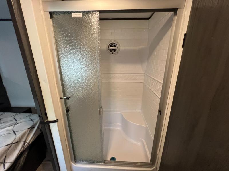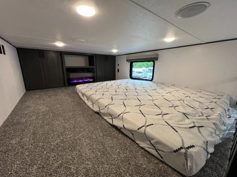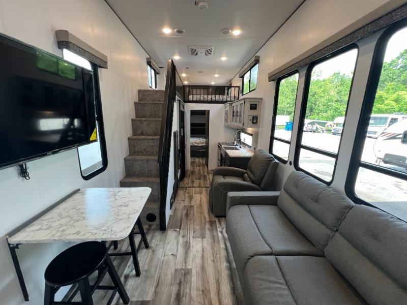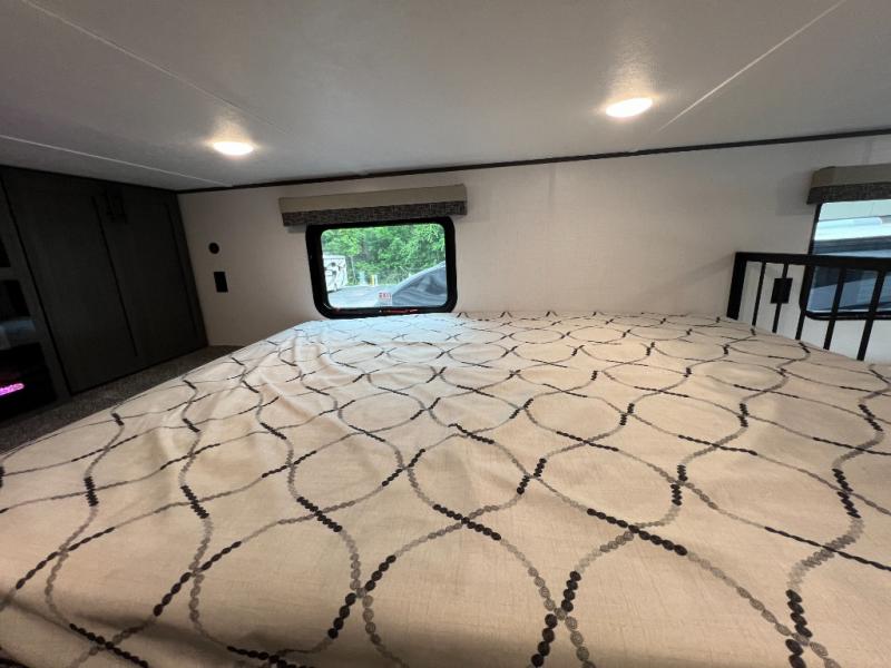You'll love extended stays in this loft model! Not only is there a loft above the front bedroom, but there is a second loft above the rear covered porch. This is also where you'll find one of the dual entry doors for convenience. The main living area includes a sofa, lounge chair, plus a table with two chairs so you can relax, dine, and play a board game in the evenings. A fully-equipped kitchen will let you make meals each day, and the walk-thru bath onboard means you won't have to use the camp's facilities!