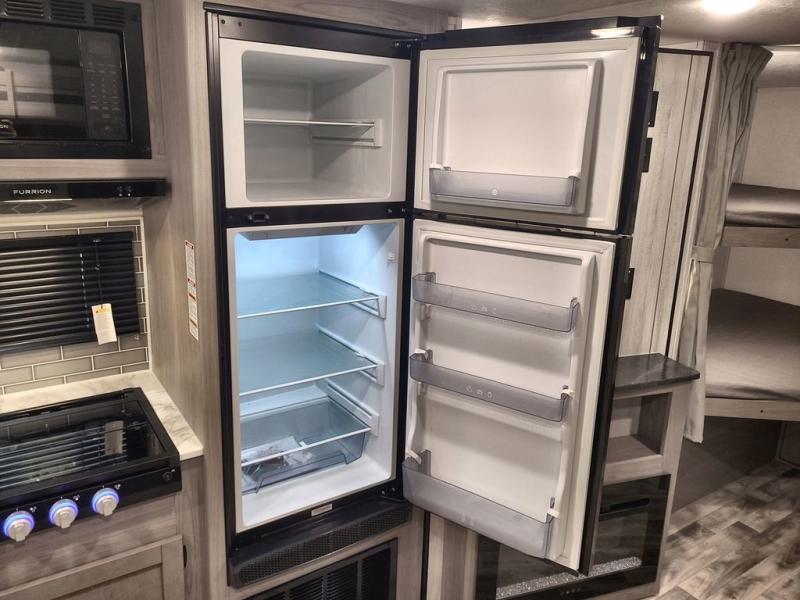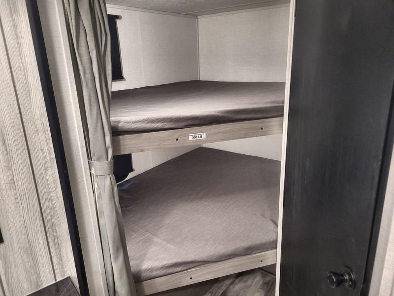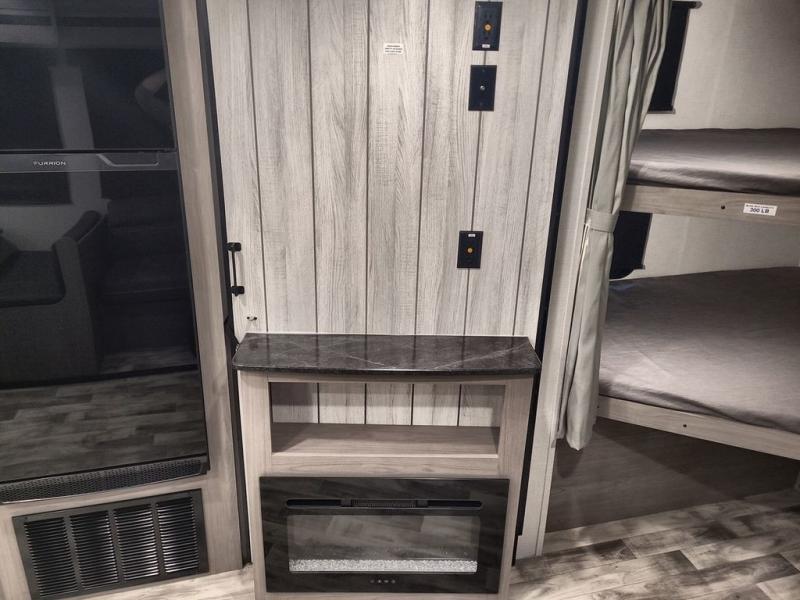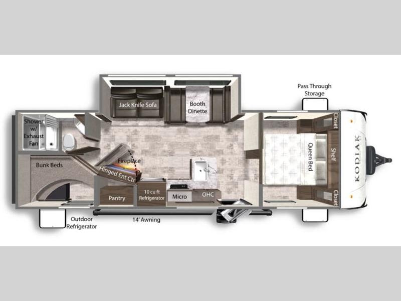 Are you looking for sleeping space for eight or nine campers? Well, you have found it with this Kodiak SE travel trailer. You can sleep in your own private bedroom with a comfortable queen bed and dual closets while the other campers sleep on the double-size bunks next to the rear corner full bathroom, or on the jack knife sofa or booth dinette within the large slide offer more sleeping space if needed. The cook will love the L-shaped counter in the kitchen, the refrigerator, and the pantry nearby to keep everyone fed. The fireplace and hinged entertainment center provide a cozy living area when you aren't outside, and when you want some fresh air, the 14' power awning with LED light gives you an outdoor living space to enjoy as well. Just grab your camp chairs from the pass-through storage. There is even an outdoor refrigerator to keep refreshments easily accessible.