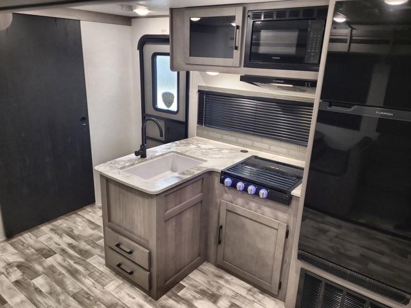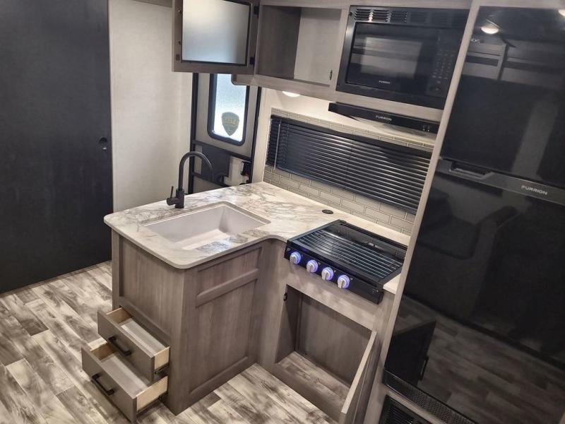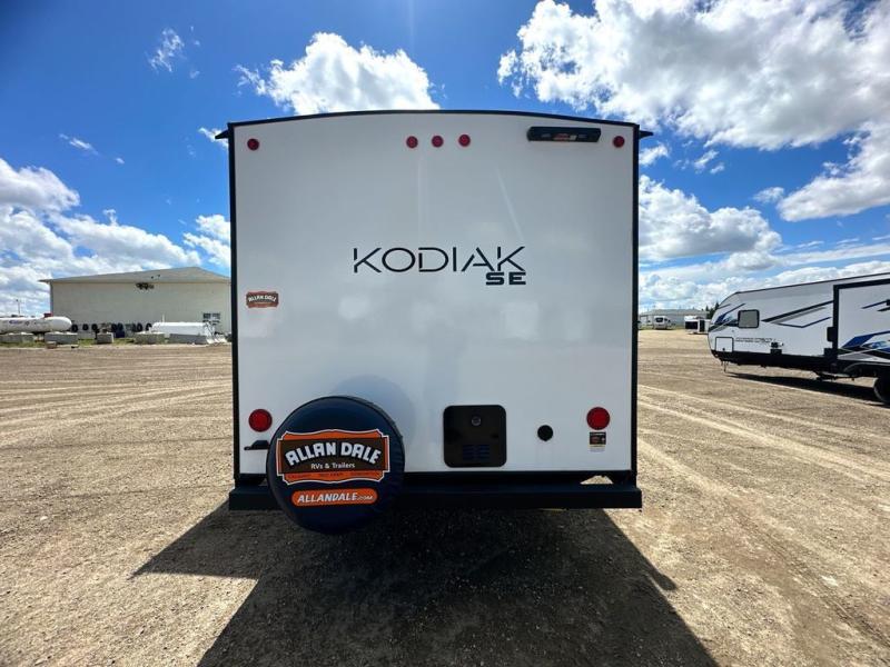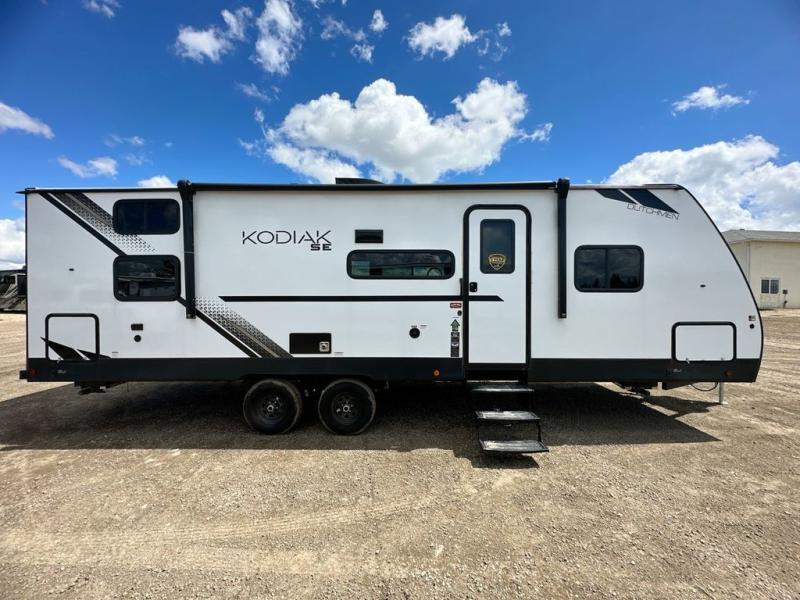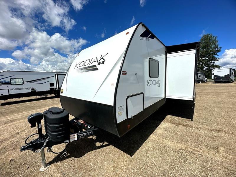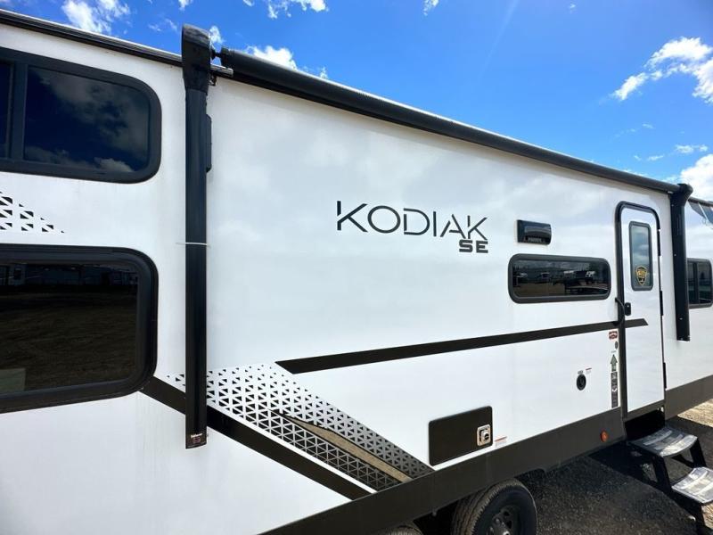 With any Kodiak SE travel trailer by Dutchmen RV, you can experience comfort while camping at a moment's notice. Each trailer includes features such as power front and rear stabilizer jacks and a power tongue jack which makes set-up easy, and a power awning with LED light for convenient outdoor living. Each model features HyperDeck flooring, and carpet free slides making them easy to clean. From the floor structure which includes a fully enclosed underbelly to the laminated walls with aluminum frame with block foam insulation, any Kodiak SE is built lightweight and ready for adventure!