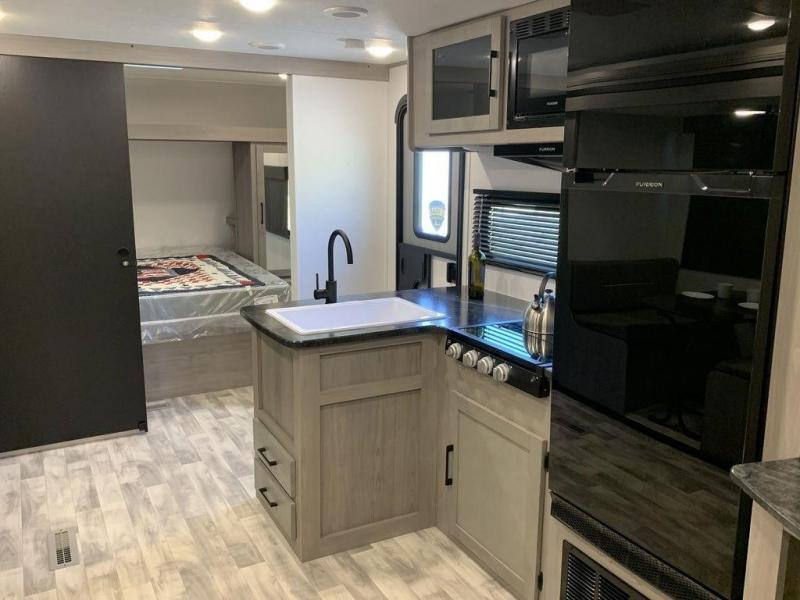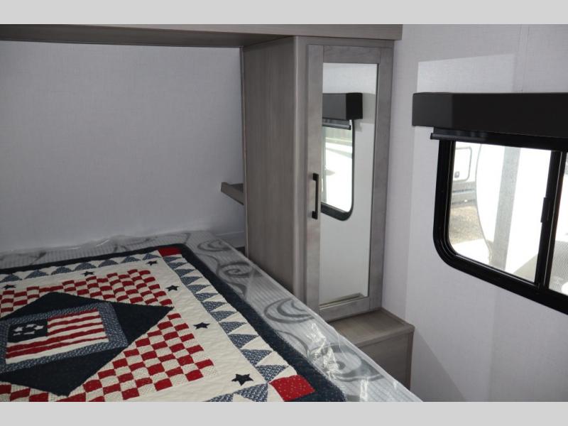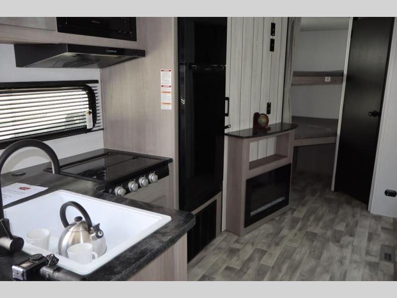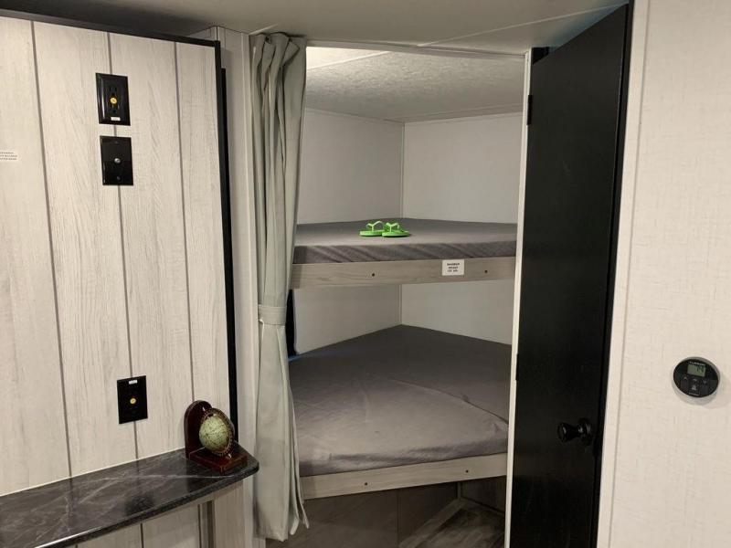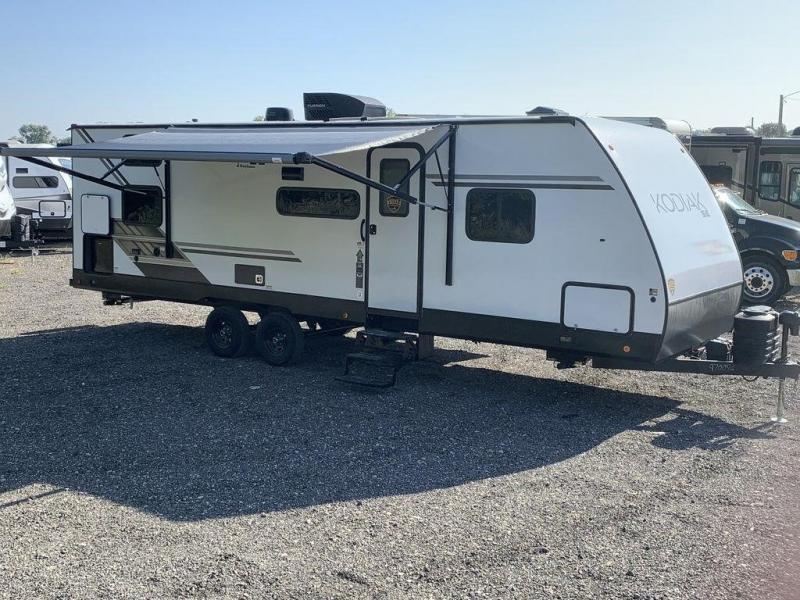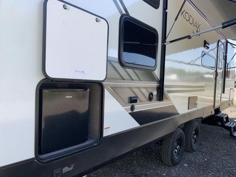 Are you looking for sleeping space for eight or nine campers? Well, you have found it with this Kodiak SE travel trailer. You can sleep in your own private bedroom with a comfortable queen bed and dual closets while the other campers sleep on the double-size bunks next to the rear corner full bathroom, or on the jack knife sofa or booth dinette within the large slide offer more sleeping space if needed. The cook will love the L-shaped counter in the kitchen, the refrigerator, and the pantry nearby to keep everyone fed. The fireplace and hinged entertainment center provide a cozy living area when you aren't outside, and when you want some fresh air, the 14' power awning with LED light gives you an outdoor living space to enjoy as well. Just grab your camp chairs from the pass-through storage. There is even an outdoor refrigerator to keep refreshments easily accessible.