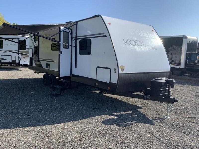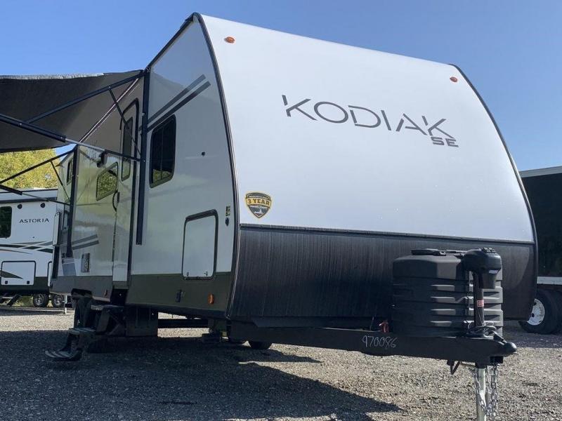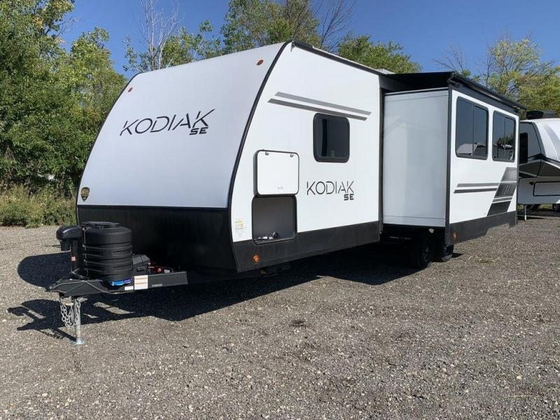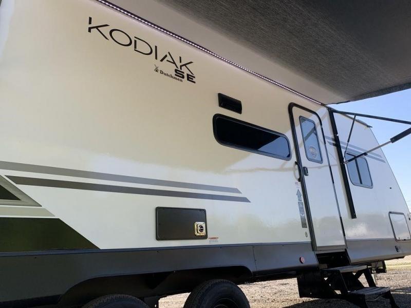With any Kodiak SE travel trailer by Dutchmen RV, you can experience comfort while camping at a moment's notice. Each trailer includes features such as power front and rear stabilizer jacks and a power tongue jack which makes set-up easy, and a power awning with LED light for convenient outdoor living. Each model features HyperDeck flooring, and carpet free slides making them easy to clean. From the floor structure which includes a fully enclosed underbelly to the laminated walls with aluminum frame with block foam insulation, any Kodiak SE is built lightweight and ready for adventure!