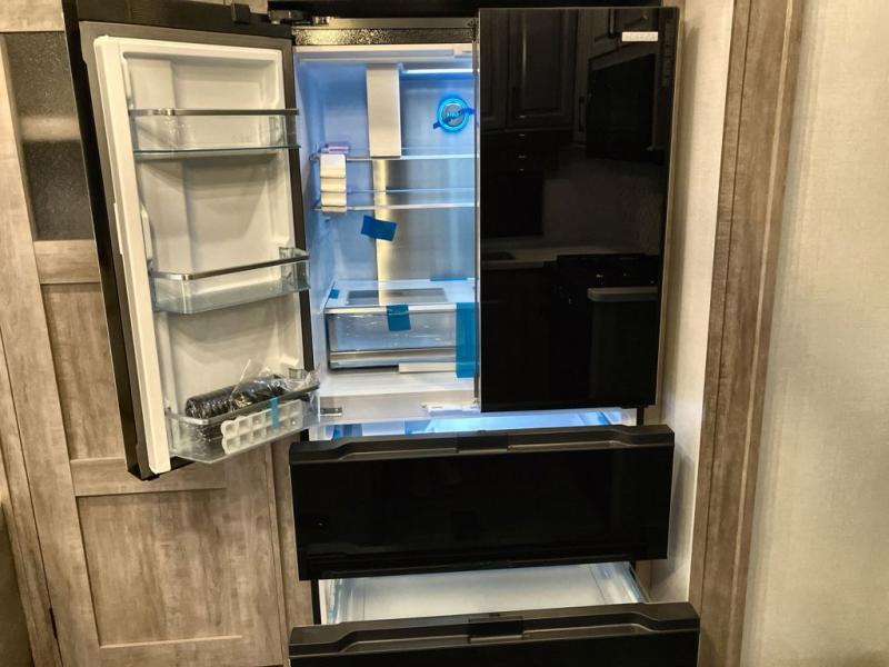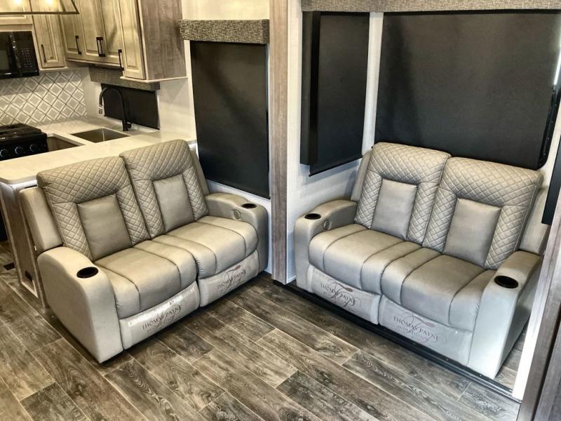 This Voltage toy hauler is going to get you pumped to start traveling! You will have your own master suite in the front which has private access to the dual-entry bathroom, and you can offer a guest suite with half bathroom, power bunk, sofas, TV, and exterior entry to your friends or family. A loft bed adds even more sleeping space, and you'll have a great relaxation area with the three sofas in the main living room. A pantry sits next to the 18-cubic foot refrigerator for food storage, and the rest of the kitchen appliances will help you prepare dinner in a flash.