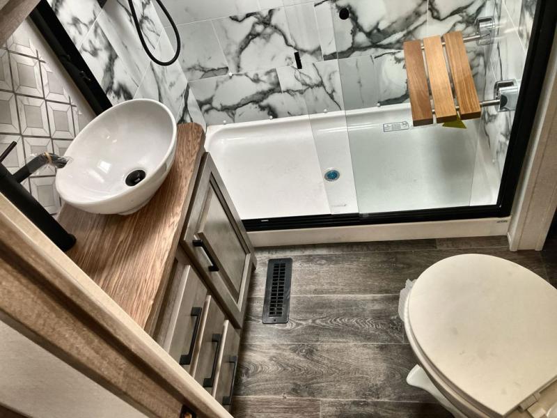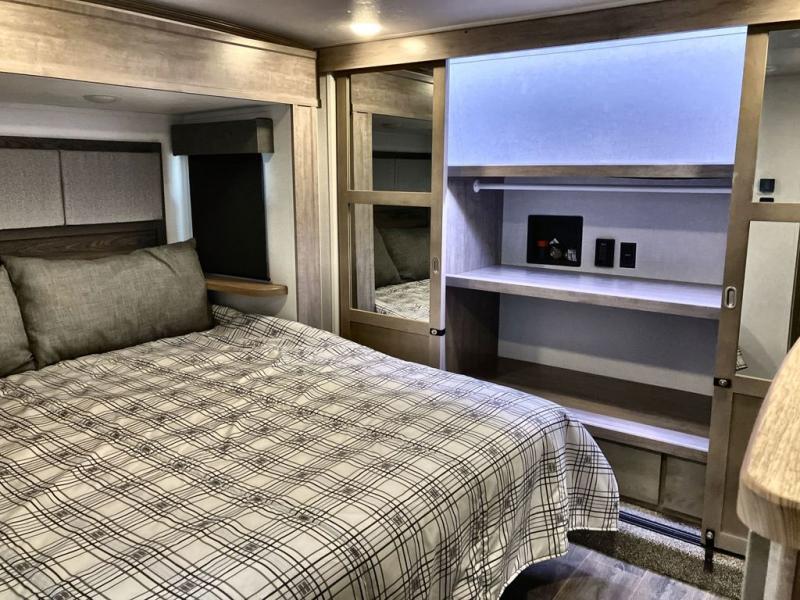 The Dutchmen Voltage toy hauler is an amazing RV that won't disappoint! These elegant units have more durability and luxury than you ever thought possible. They include an All Weather Package, 16" custom wheels, MorRyde CRE 3000 suspension, and a second fuel tank for a total of 60 gallons. There is a second power awning over the garage entry door, and you will even find a third awning above the ramp patio. The tinted frameless windows will protect you from outside prying eyes and harsh sunlight, and the interior solid-surface countertops in the kitchen will withstand many years of chopping and dicing. You'll also have a 12" diamond plate in the garage for protection, and there is an on-demand tankless water heater for hot showers after trail riding!