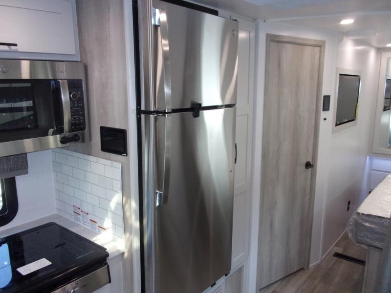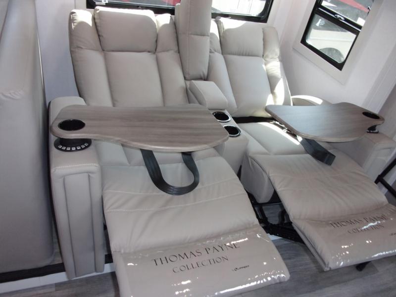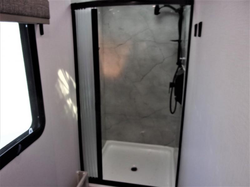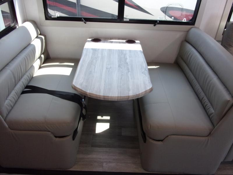 You will have plenty of space to walk about this motorhome with the dual slides! The booth dinette and sofa slide create an open concept living area and the sofa can be replaced for the optional theater seating if you prefer that instead. Freshen up after a long day of traveling in the rear corner bathroom with the designer shower that has a skylight above for more natural lighting and an Oxygenics body spa RV shower head for a more relaxing shower. Put on your comfy clothes stored in the wardrobe in the rear corner private bedroom then either lay on the 60" x 75" gel-infused memory foam mattress while you watch a movie on the 32" LED smart TV or head to the kitchen and whip up a meal with the three burner gas range and countertop extension. You could even head outside and watch a movie on the exterior 32" TV underneath the 16' dual-pitch armless awning!