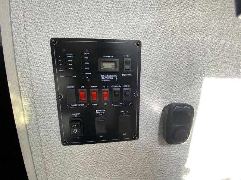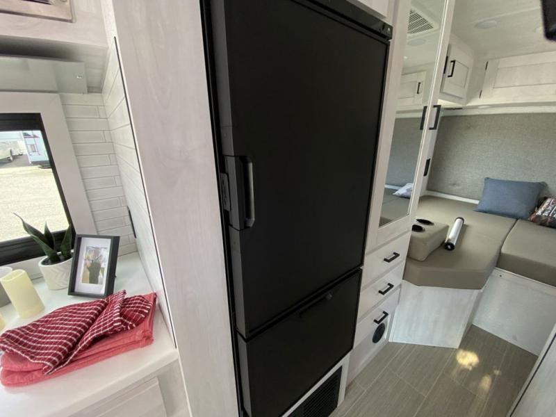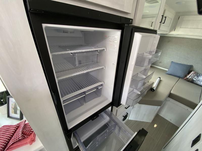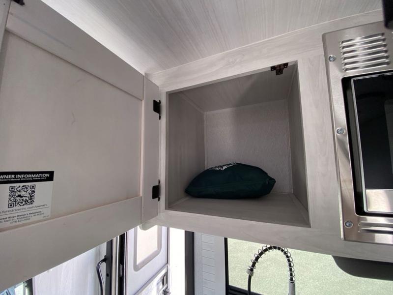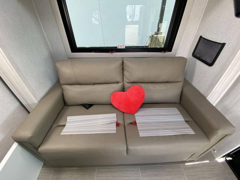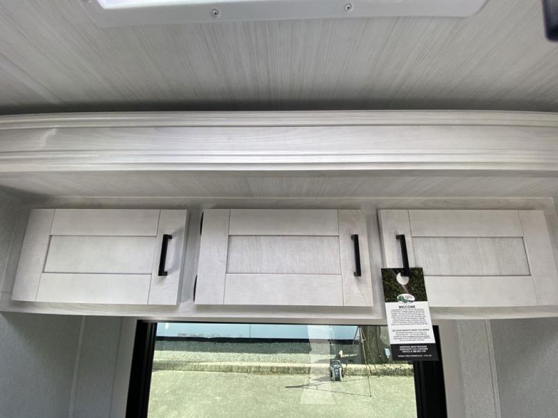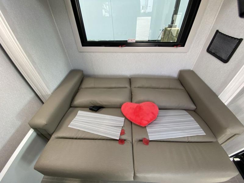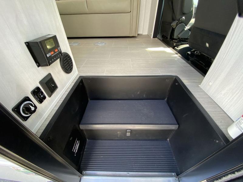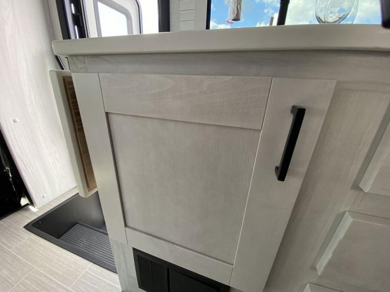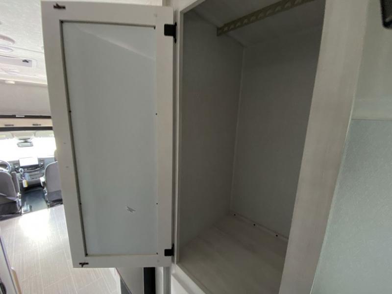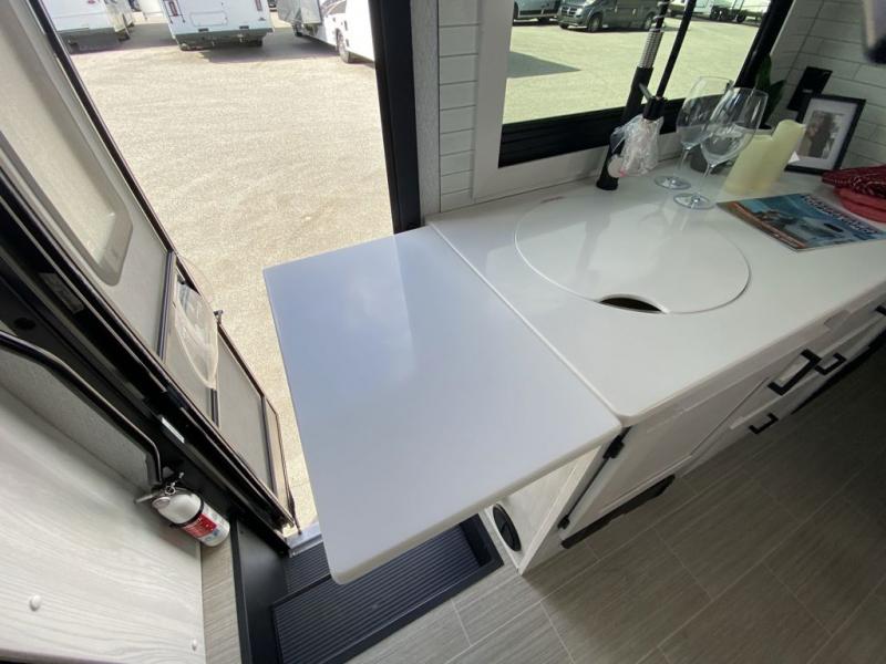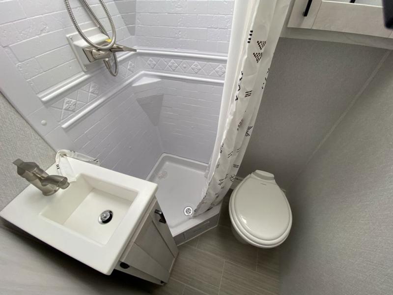 Whether you are traveling to your favorite campground or across the country, you are going to love this motorhome. You will have versatility in this coach to travel with a friend or your sweetheart with two twin beds that can easily convert to a king bed if you like. Each bed is 36" x 73" with a nightstand between and overhead storage along both sides and across the rear of the unit providing plenty of space for your things. There is also a wardrobe off the foot of the twin that is on the curbside. For relaxing and dining a slide out sofa with removeable table, and more overhead storage here. The kitchen is opposite the slide on the door side and features a round hidden sink with solid surface cover for added prep space, a 12-volt 6 cu. ft. refrigerator for your perishables, and a microwave oven and induction cooktop for easy meals as you travel. When you want to get cleaned up, a bath with an angled shower, toilet, and sink, plus medicine cabinet for your toothbrush and razor. The doors both open out so you can actually create a more open space when in the bathroom making it the width of the unit.