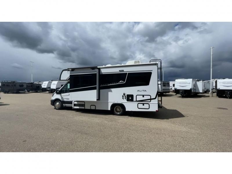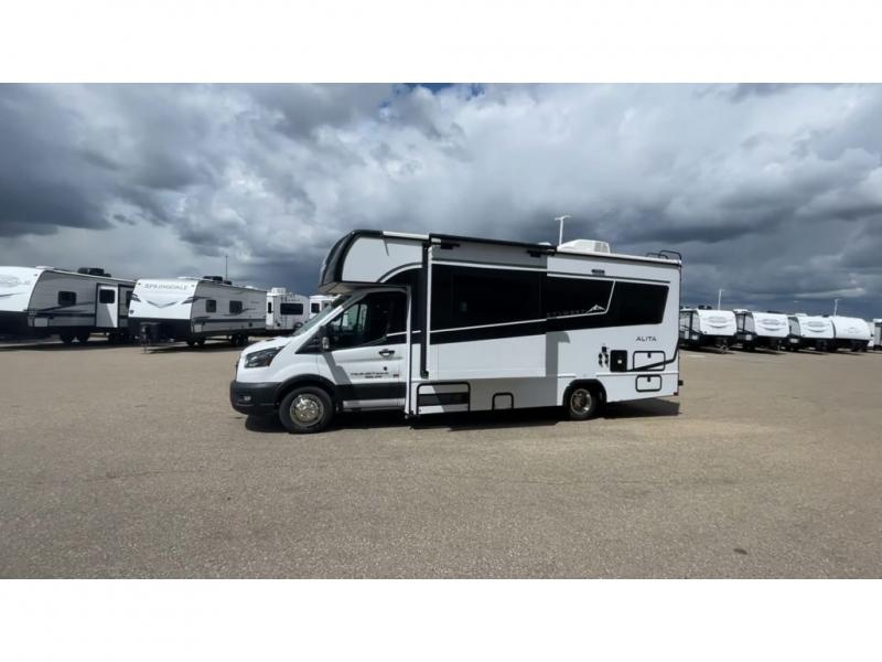 The Alita Class C gas motorhome is fueled by a 3.5L EcoBoost V6 engine which sits on the all-new Ford AWD 350 Transit chassis with 10-speed automatic Selectshift transmission. The Alita features Azdel composite sidewall and slidebox construction along with a one-piece automotive painted fiberglass front cap, Dicor Diflex II TPO roof membrane, and side port solar panel hook-up, plus more. On the inside, a cabover bunk for added sleeping or storage, a portable induction cooktop, a premium subway tile backsplash, and the Alita value package also features a luxury legless Girard awning with LED light strip, panoramic windows with integrated night shades for great views during the day and privacy when you want it at night. You will also appreciate the solar charge package option and so much more!