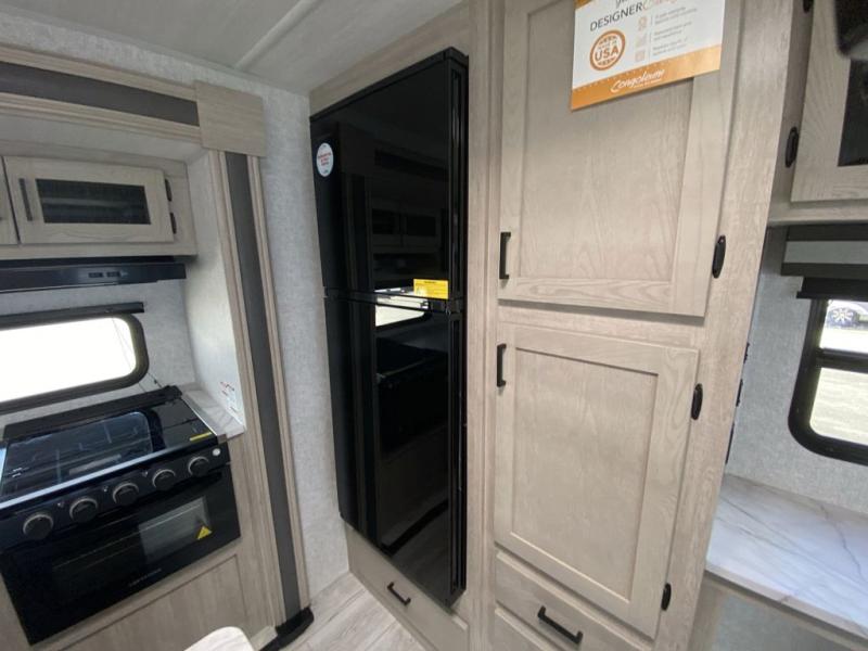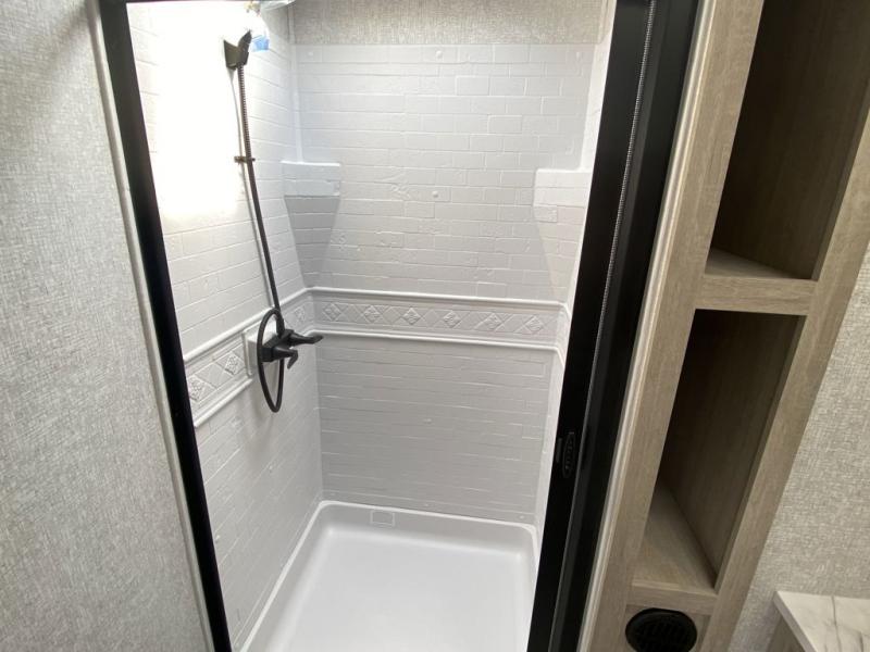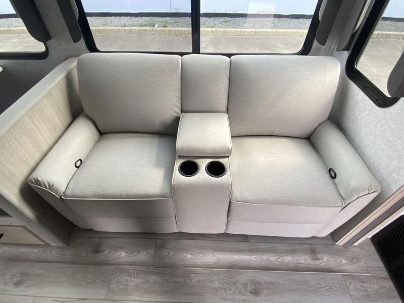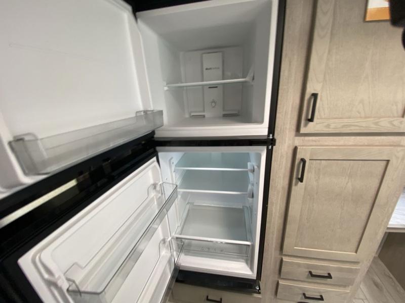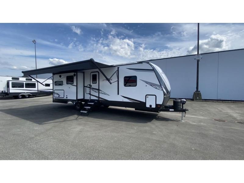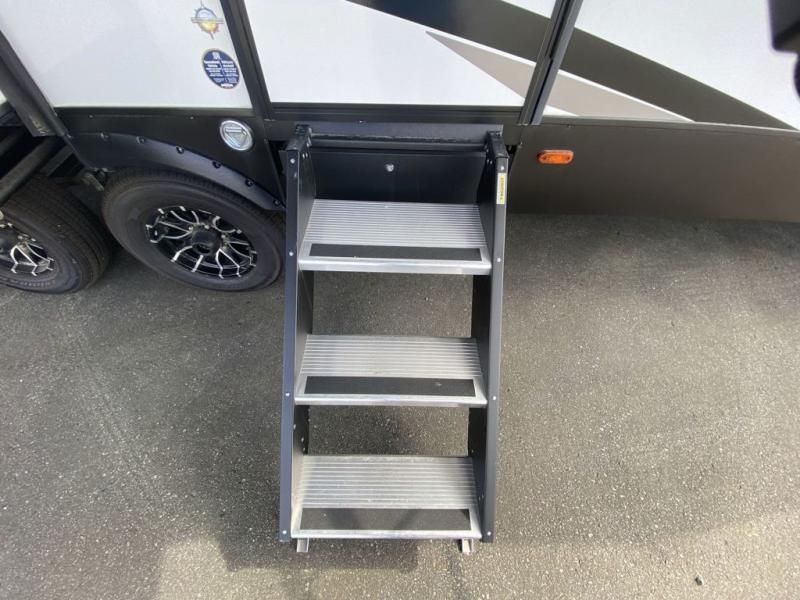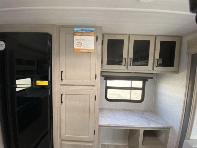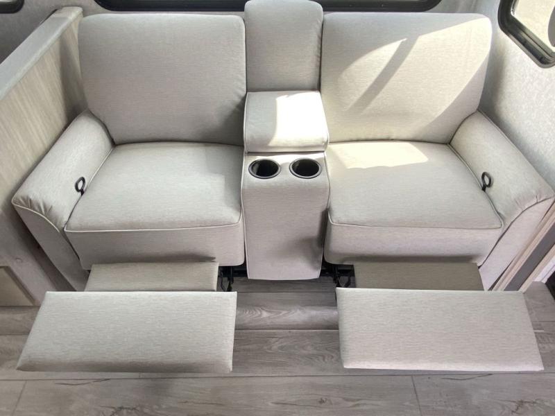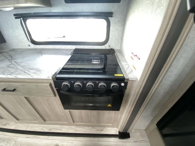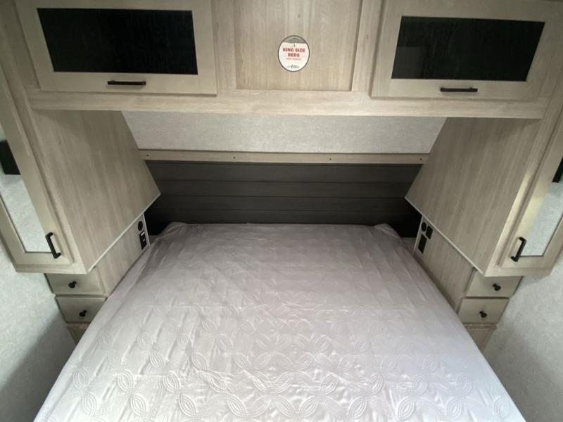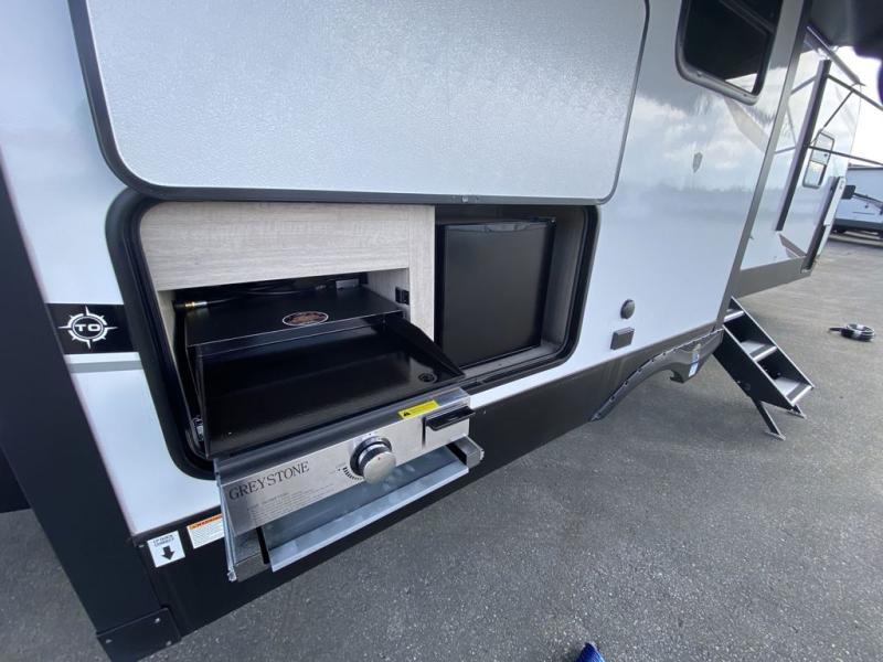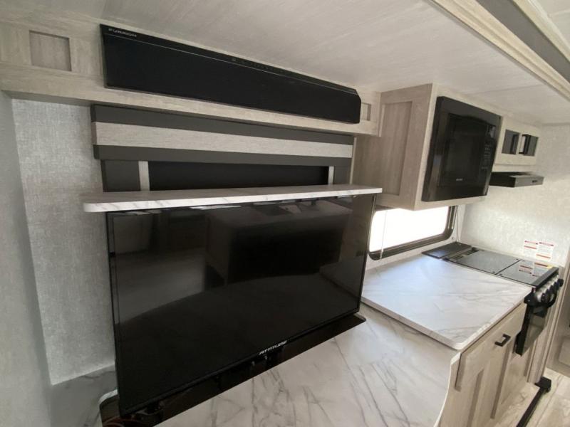 How does a king bed, a kitchen island, and an outdoor kitchen sound? You'll get all that and more in this spacious travel trailer. The dual opposing slides opens up the whole trailer, and the desk in the back will allow you to work while you're away from home. A three burner cooktop and microwave oven comes standard indoors, along with plenty of counter space and a pantry for snacks. Head outdoors to find the outside kitchen under the 21' power awning with LED lights, and when you're ready for bed the king bed will be waiting for you!