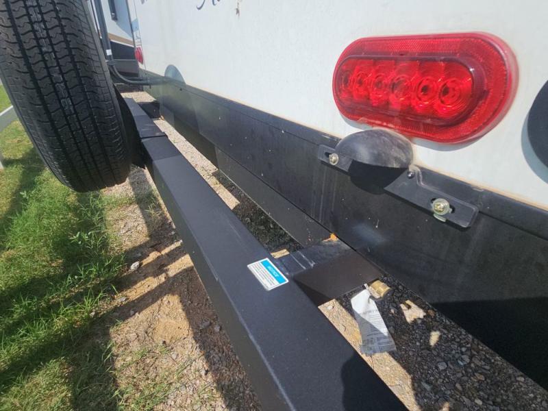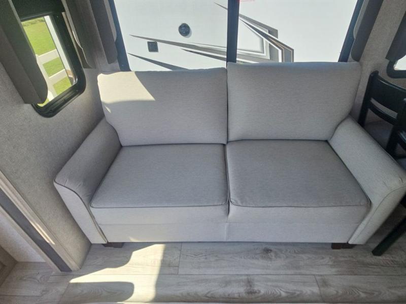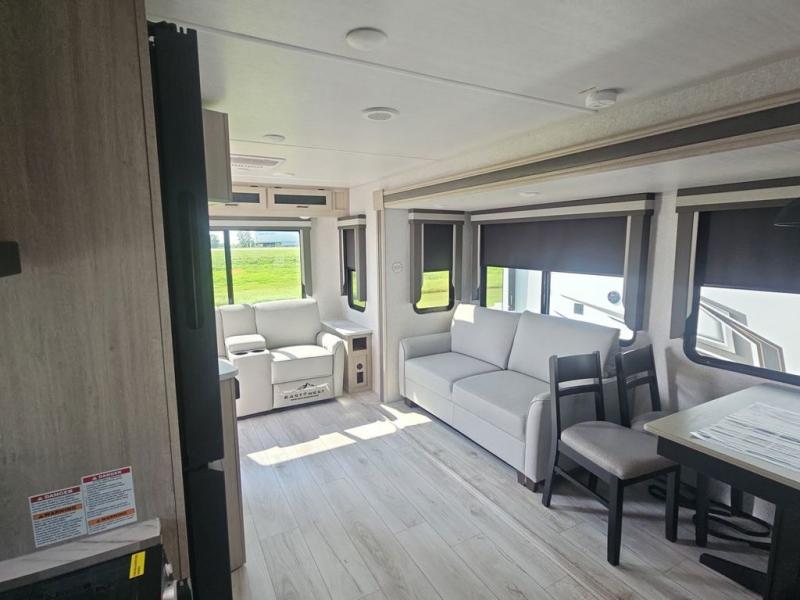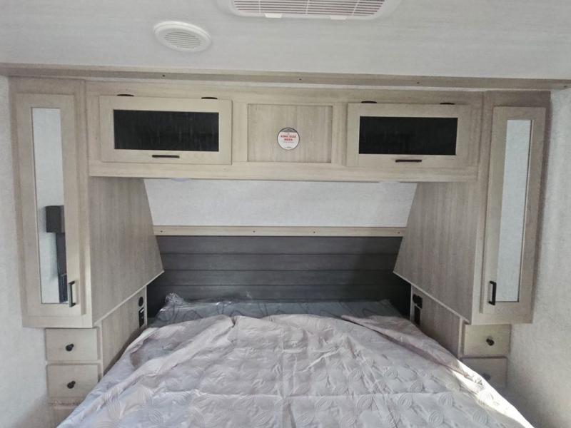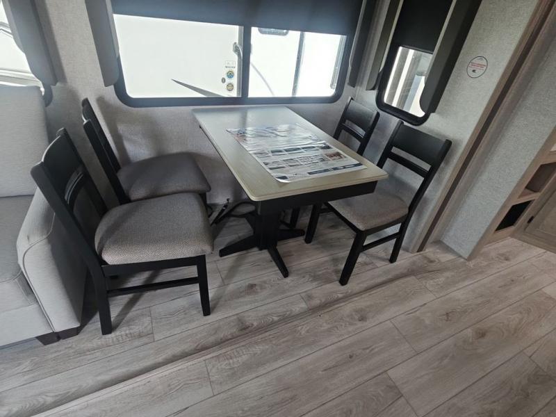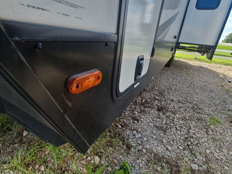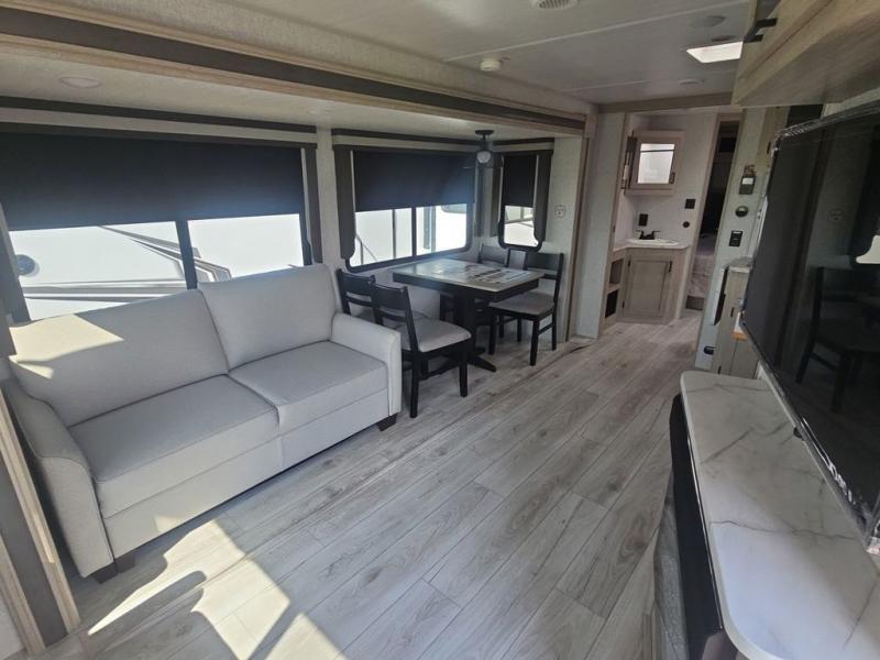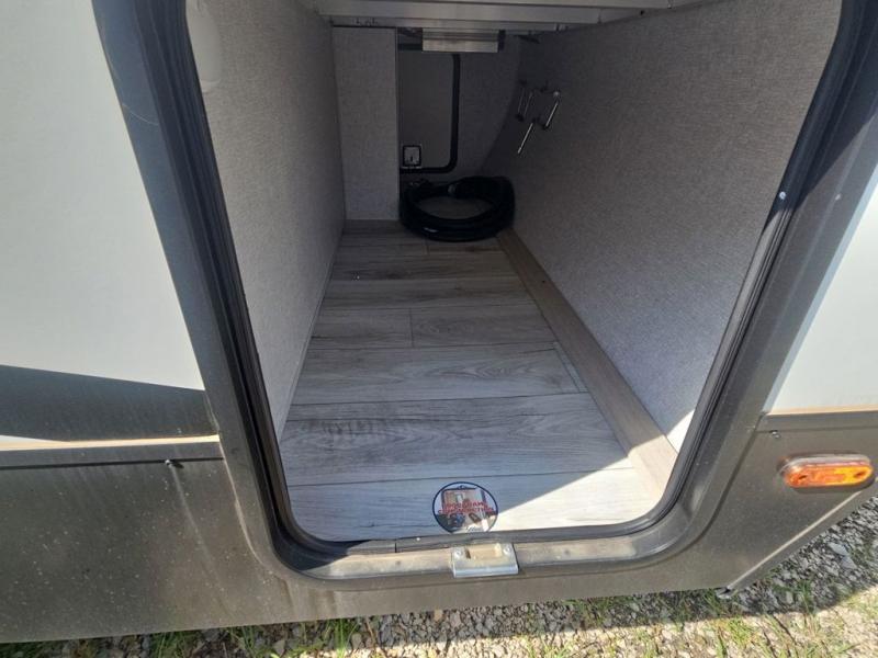 You'll feel right at home in this rear living travel trailer that includes theater seats and a front master bedroom with a king bed. The walk-through bath includes a medicine cabinet and a shower skylight to let natural light in, and the bedroom includes its own exterior entry door for convenience. When you're not relaxing outdoors under the 21' power awning with LED lights, you can play a game at the booth dinette or relax on the tri-fold sofa. This model also includes a pass-through storage for your larger camp gear and a universal docking station for easy access to your hookups.