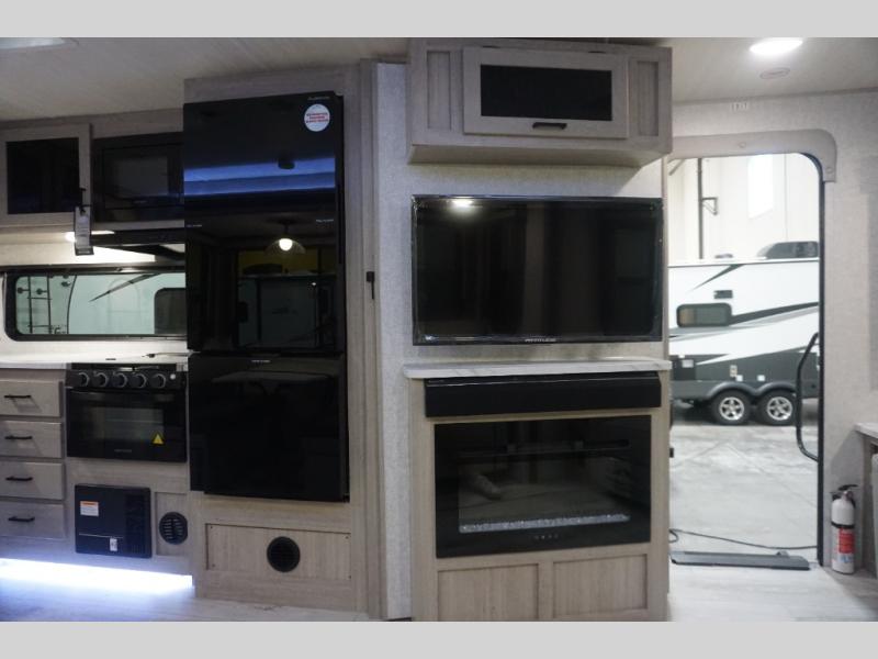 You'll feel right at home in this rear living travel trailer that includes theater seats and a front master bedroom with a king bed. The walk-through bath includes a medicine cabinet and a shower skylight to let natural light in, and the bedroom includes its own exterior entry door for convenience. When you're not relaxing outdoors under the 21' power awning with LED lights, you can play a game at the booth dinette or relax on the tri-fold sofa. This model also includes a pass-through storage for your larger camp gear and a universal docking station for easy access to your hookups.