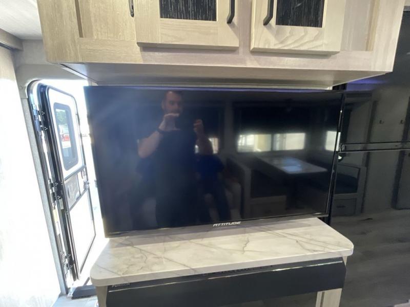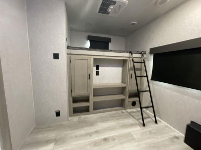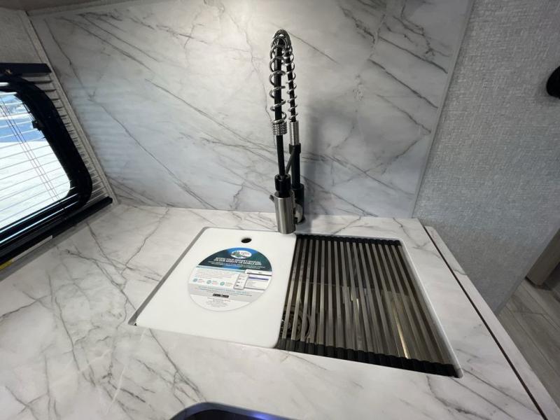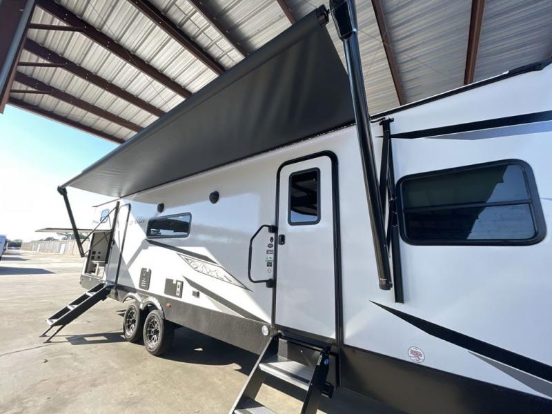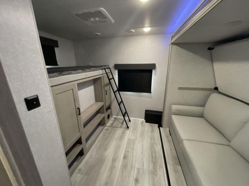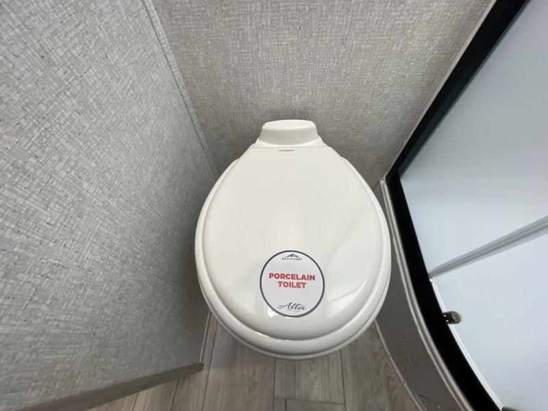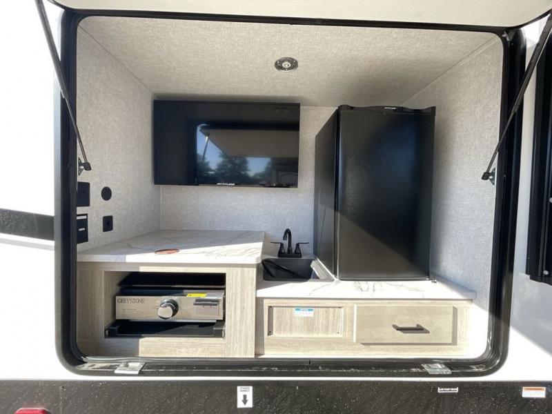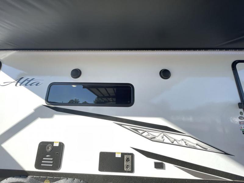 If you're looking for a travel trailer to take tailgating, this Alta model is the one! After you've unloaded the pass-through storage and set up the 21' power awning, start lunch on the outside kitchen! Since there are dual entry doors you can enter in through the main living area, or the full bath for convenience. The little ones are sure to spend most of their time in the rear bunkhouse that includes a flip-up bunk under the sofa, plus a second bunk across the room. The adults can visit at the booth dinette or on the tri-fold sofa, and check out the front private bedroom with sliding doors and a king bed for all-around comfort!