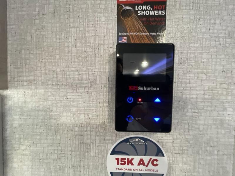Each Alta travel trailer by EAST TO WEST is constructed with a 5" vacuum bonded roof, flush floor slide outs (where applicable), and diamond plate front rock guard for added protection. Outside, you'll find marine-grade exterior speakers, a universal docking station, and back-up camera prep that can be added to make maneuvering in and out of campgrounds easier than ever. There are USB charging stations for your tablet or phone and designer solid surface countertops you are sure to love. The furnace and 15,000 BTU ducted A/C with quick cool will keep you comfortable in any season, and the 81" interior ceiling height will provide ample space to move about without feeling confined. Start a new adventure in an Alta travel trailer today!