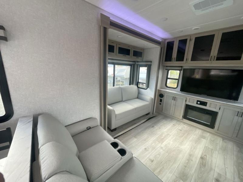 You will feel right at home in this travel trailer! After you've unloaded the pass-through storage and set up the 21' power awning, start preparing lunch will all of the countertop space next to the kitchen sink. You can get a good night's rest on the king bed slide in the front private bedroom and store your clothes in the large front wardrobe. There is even washer and dryer prep here if you want the option to add these appliances. The adjustable free standing table offers a comfortable place to enjoy your meals and play card games. Inside the rear living area, you will find opposing slides with a tri-fold sofa and theater seats, as well as a second set of theater seats directly across from the rear entertainment center and fireplace!