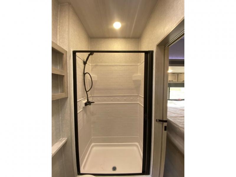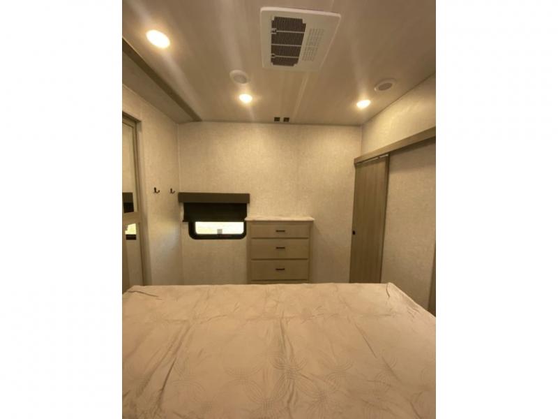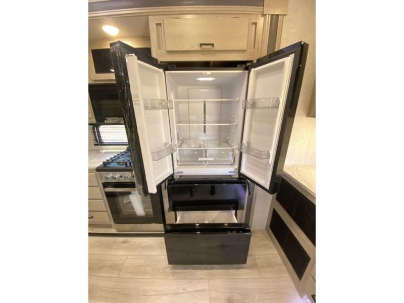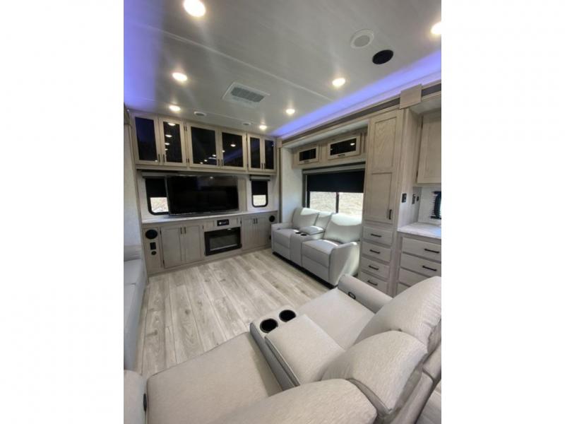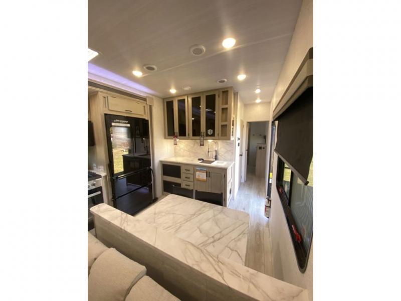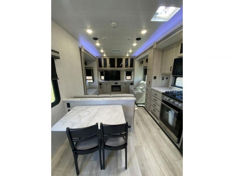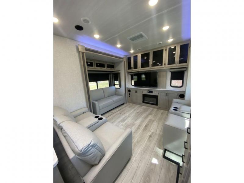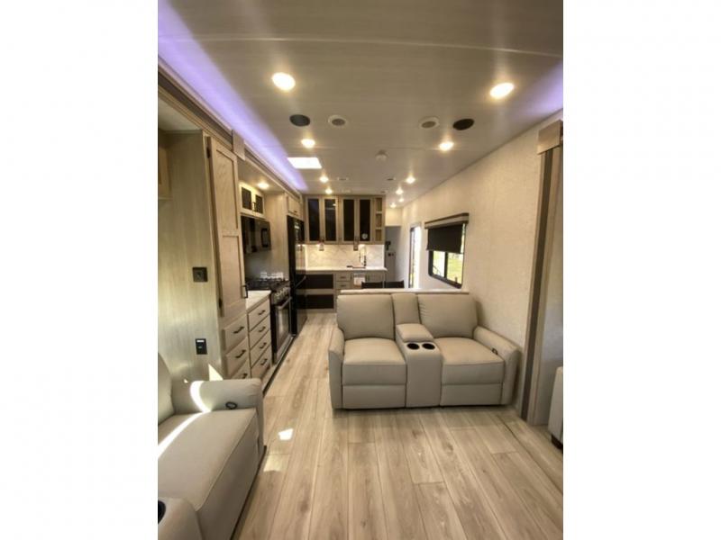 You will feel right at home in this travel trailer! After you've unloaded the pass-through storage and set up the 21' power awning, start preparing lunch will all of the countertop space next to the kitchen sink. You can get a good night's rest on the king bed slide in the front private bedroom and store your clothes in the large front wardrobe. There is even washer and dryer prep here if you want the option to add these appliances. The adjustable free standing table offers a comfortable place to enjoy your meals and play card games. Inside the rear living area, you will find opposing slides with a tri-fold sofa and theater seats, as well as a second set of theater seats directly across from the rear entertainment center and fireplace!