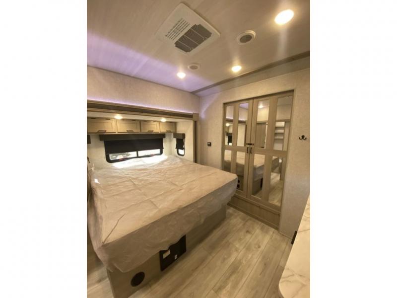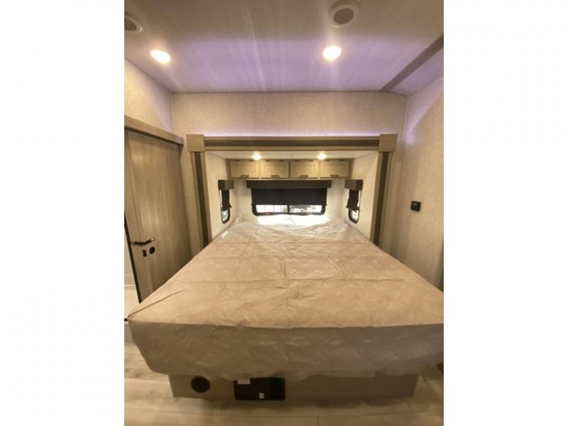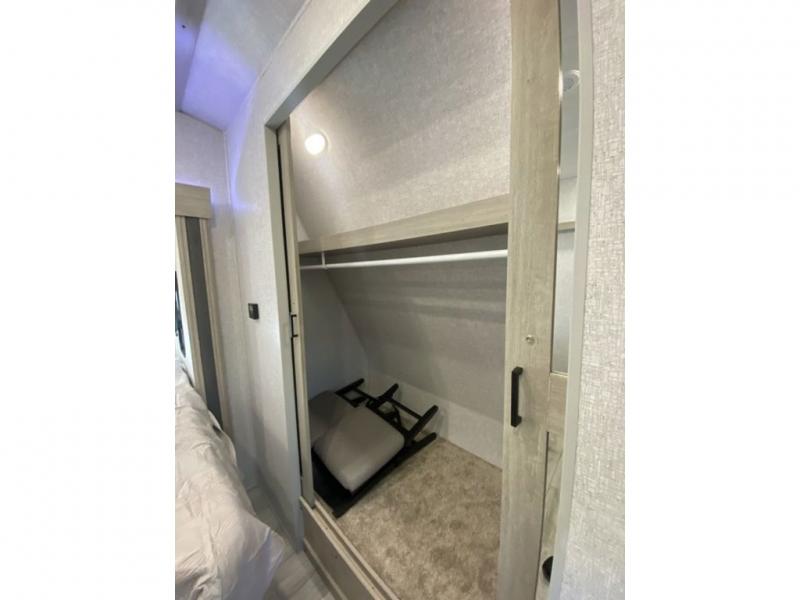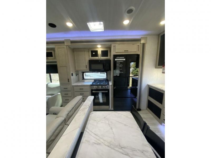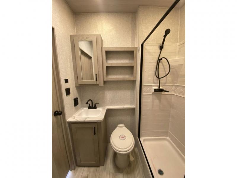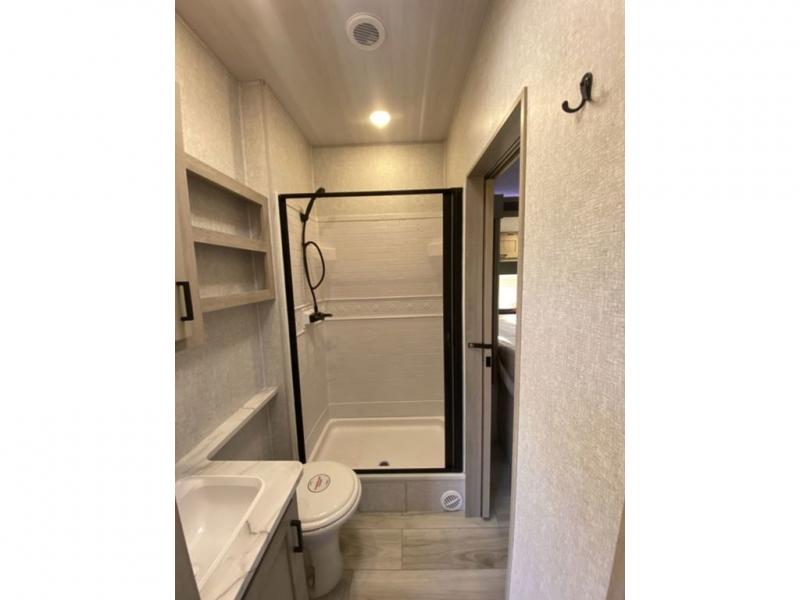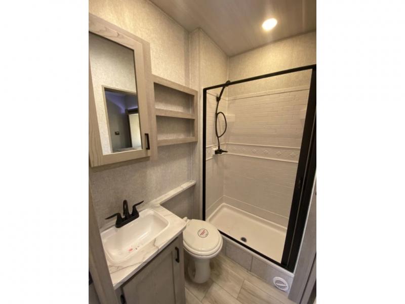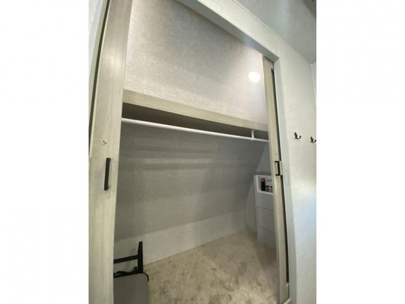 You will feel right at home in this travel trailer! After you've unloaded the pass-through storage and set up the 21' power awning, start preparing lunch will all of the countertop space next to the kitchen sink. You can get a good night's rest on the king bed slide in the front private bedroom and store your clothes in the large front wardrobe. There is even washer and dryer prep here if you want the option to add these appliances. The adjustable free standing table offers a comfortable place to enjoy your meals and play card games. Inside the rear living area, you will find opposing slides with a tri-fold sofa and theater seats, as well as a second set of theater seats directly across from the rear entertainment center and fireplace!
