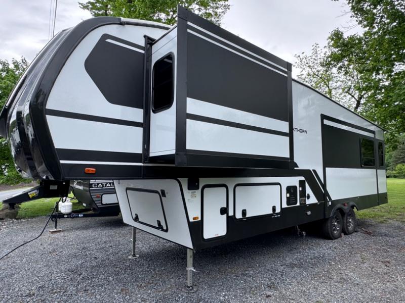 With any Blackthorn mid-profile fifth wheel by EAST TO WEST, you will find luxury amenities at every turn! There is Radiant Technology Composites insulation in the roof, front cap and underbelly, plus Azdel laminated sidewalls with block foam insulation for 4-seasons camping! You will love how easy it will be to tow your fifth wheel with Dexter axles and a MORryde CRE 3000 suspension, and the electric automatic leveling system means you can set up camp in no-time! The exterior also includes an adjustable power awning with LED lights, LED motion sensor lights in the pass-through storage, and a universal all-in-one docking station to easily manage your units tank levels and functions. Head inside to find vinyl flooring, solid wood shaker style cabinet doors with hidden hinges, a seamless fiberglass shower with the industry's first locking travel latch for glass shower doors, and many more elegant features!