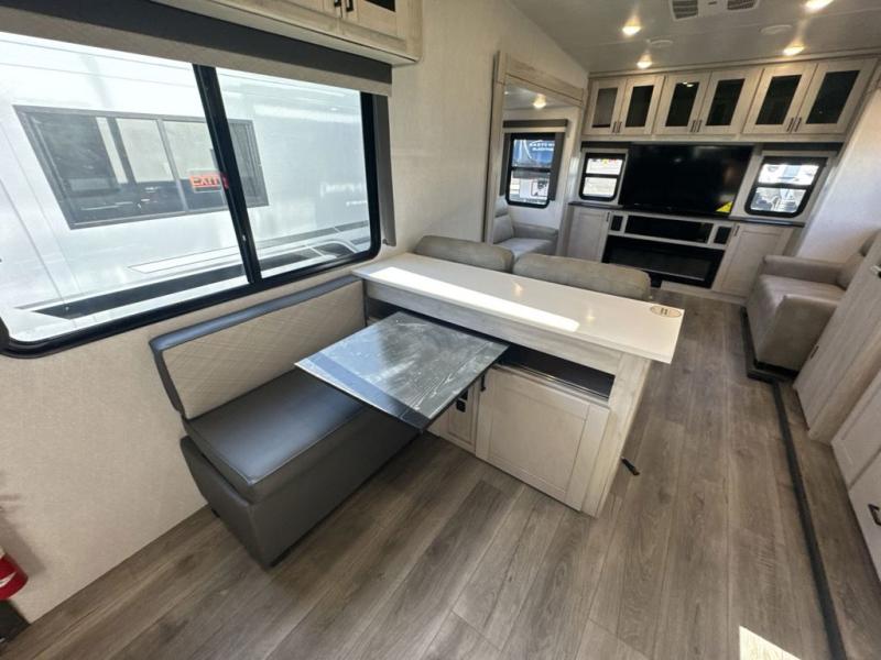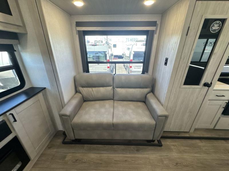 Roughing it in the woods will hardly feel like roughing it in this cozy fifth wheel for six! You'll have a full kitchen to cook in each day that includes a four burner range with a 30" over-the-range microwave, ample counter space to prep meals, and a 16 cu. ft. 12V refrigerator that will hold food for the whole week. There is also a free-standing adjustable dinette here with a storage ottoman and a counter that overlooks the rear living area. Here, you'll enjoy two hide-a-bed sofas and theater seating across from the fireplace and 50" TV. And this room can double as your guests' bedroom at night! You'll be able to claim the front private bedroom with a king bed slide out, a full-length wardrobe with washer and dryer prep, plus a dresser with TV prep if you want to add a TV.