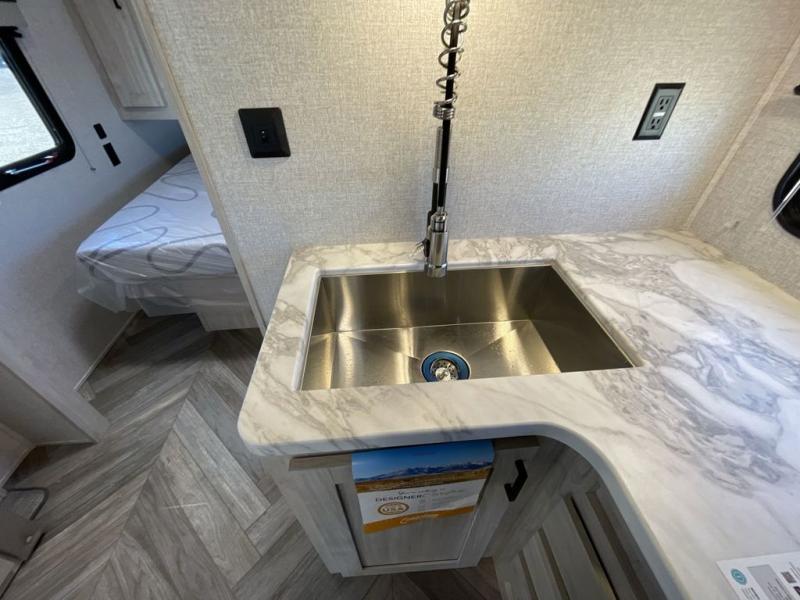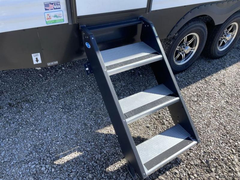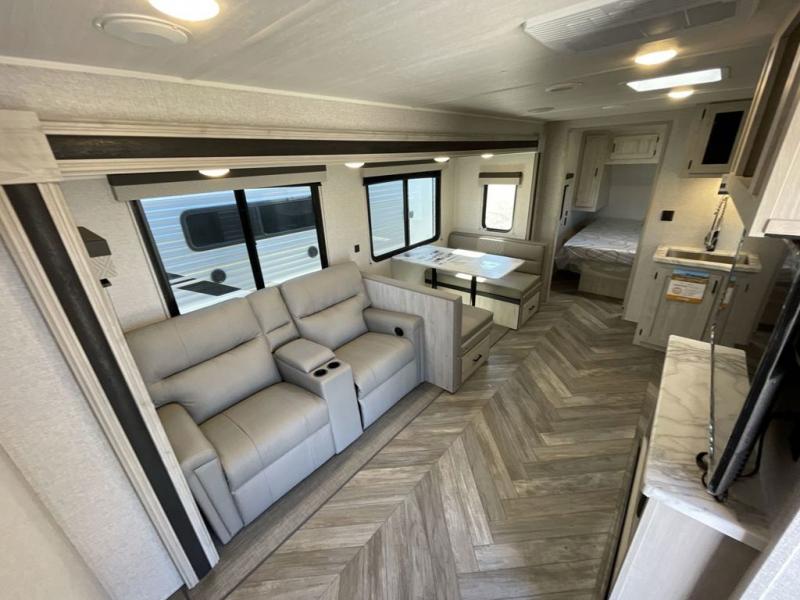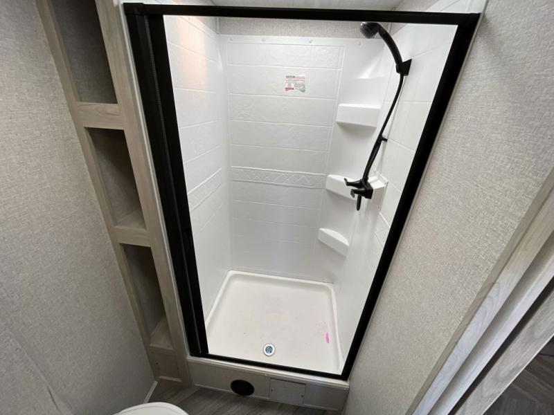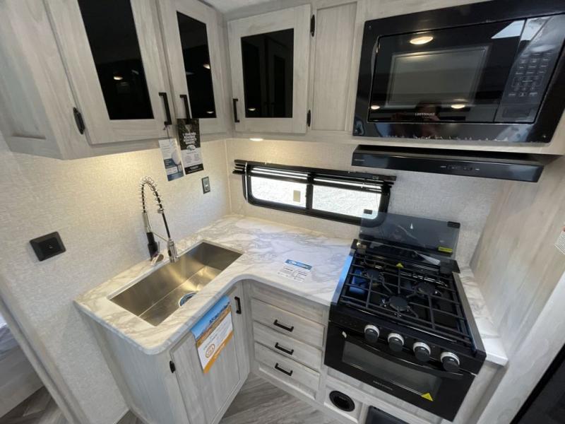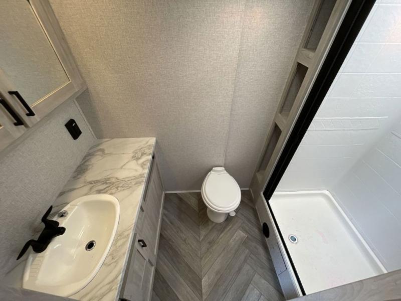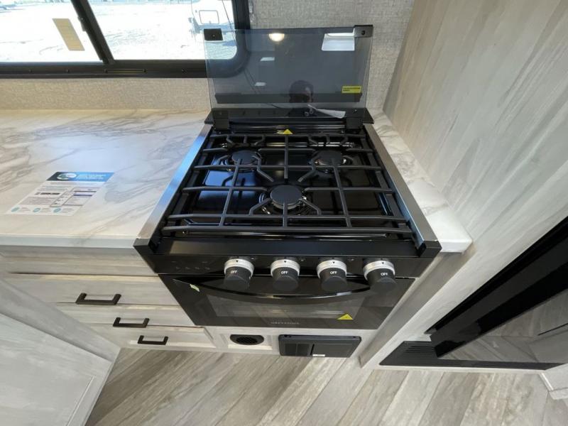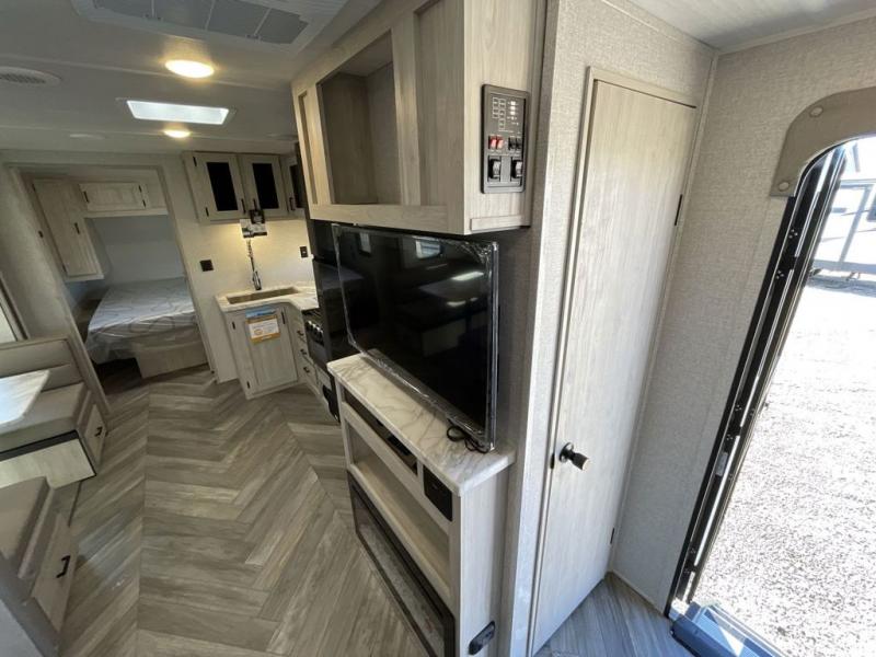 When you are wanting a little more interior space in your next travel trailer, take a look inside! This large slide out widens the center so you can easily make meals using full amenities without having to move for someone walking from the front private bedroom to the rear spacious bathroom. There is a king-size bed with storage on both sides, underneath and above, plus a space saving sliding door. The oversized booth dinette and jack knife sofa offer comfortable seating as well as extra sleeping space for overnight guests. And the fireplace is just a nice feature to enjoy. And the large pantry is a convenient feature you will surely appreciate. There is so much more!