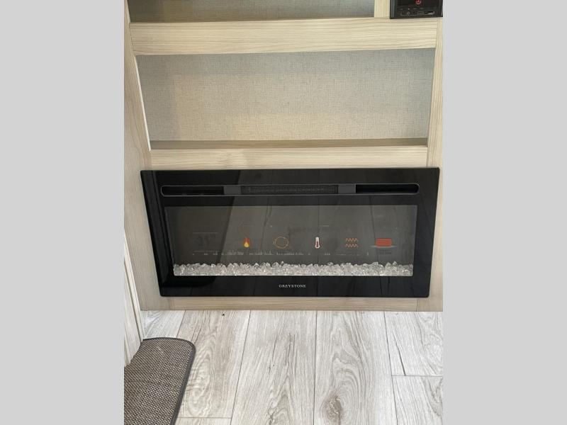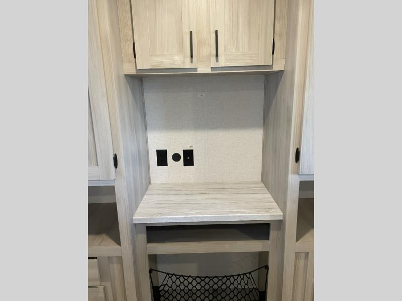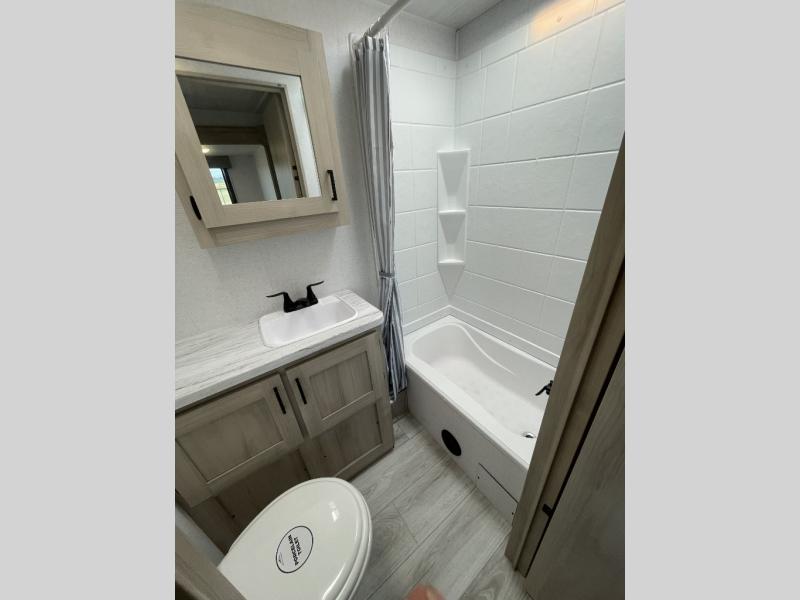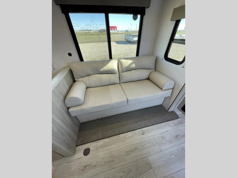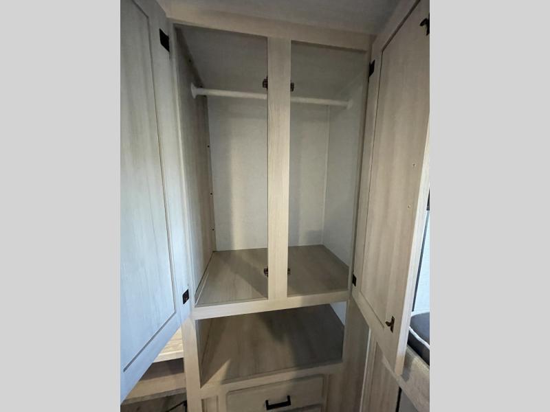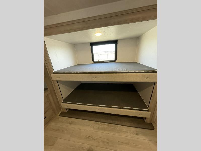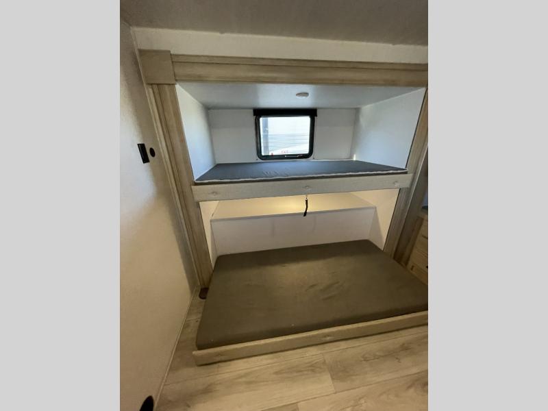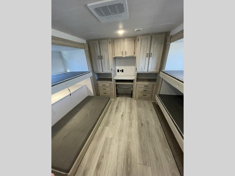 This bunkhouse trailer will wow you every time you take it out of storage. With dual slides in the private bunkhouse that offers four bunks, a desk, an entertainment center and dual wardrobes, your kids or guests may never come out. No worries, you will sleep on your own king-size bed on the opposite side of the trailer. The main living and kitchen combined room has the third slide giving this area more floor space as well, and the furniture provides extra sleeping space. There is a full bathroom to stay refreshed including a walk-in shower, and full kitchen amenities including a stainless steel refrigerator, and there is an optional outdoor kitchen if you would like that feature added.