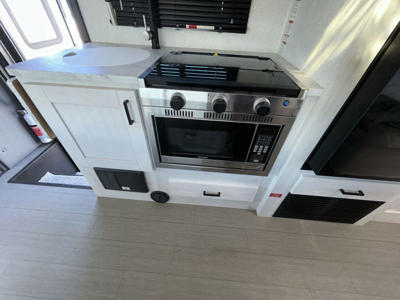 The journey will be oh-so enjoyable when you use this Entrada Class C gas motorhome to explore! You will be able to create meals each day that you are on the road because the kitchen has everything you will need, like a convection microwave, a round sink, a cooktop, a flip-up countertop, and a 10.7-cubic foot refrigerator. There is even a pantry/wardrobe for you to use to store spices, chips, or canned goods. Across from the queen bed slide, you'll find a private shower and toilet room so that you can get cleaned up in the morning, and the vanity with medicine cabinet is located just outside the bathroom so that someone can brush their teeth while another is showering.