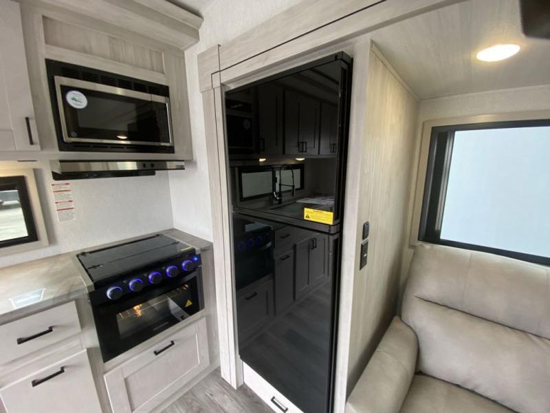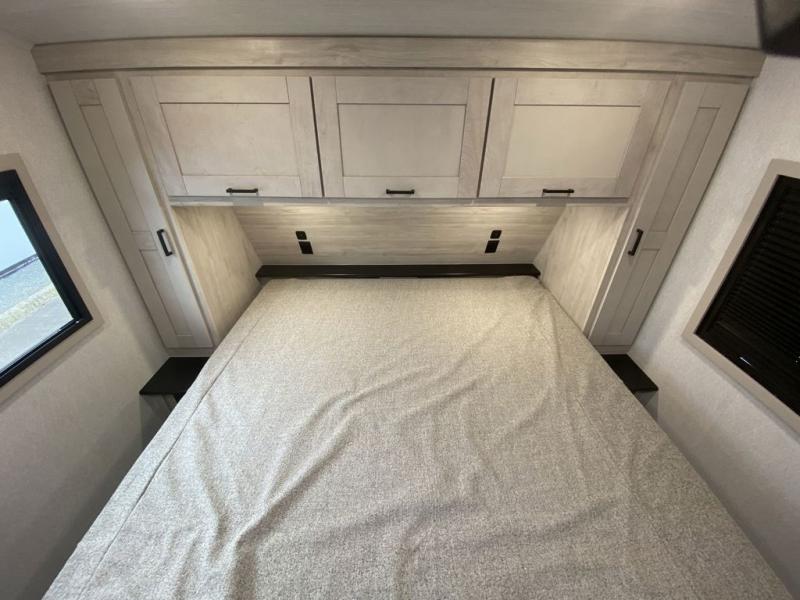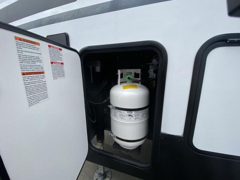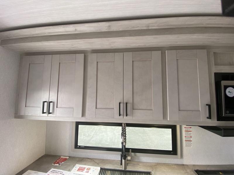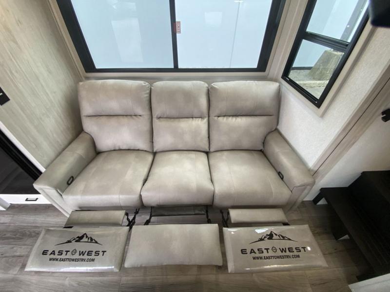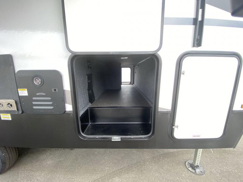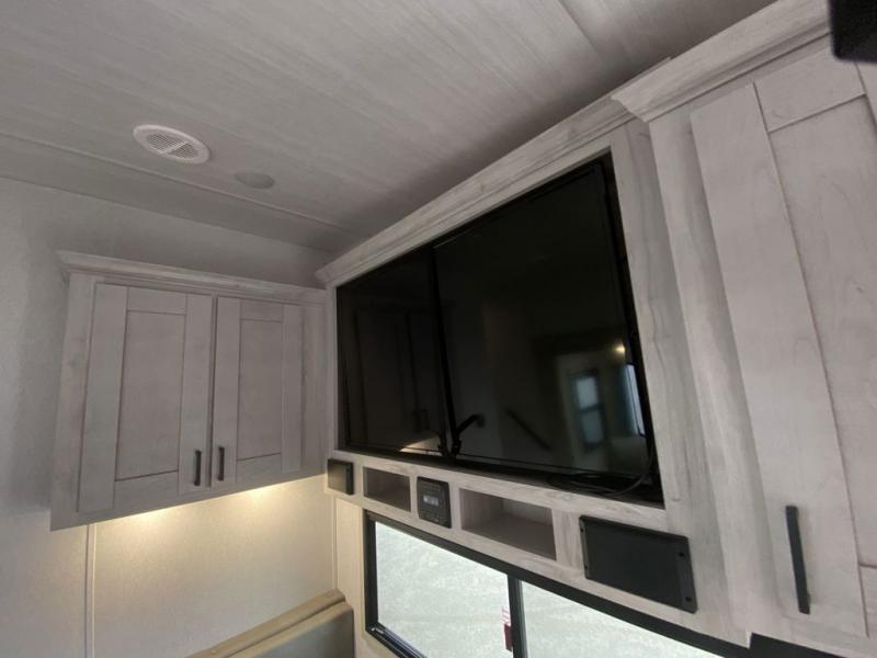 This fifth wheel is perfect for a couple who wishes to escape the hustle and bustle of everyday life! The front private bedroom has a king bed with storage underneath to store extra blankets and a TV prep area for extra entertainment. Freshen up each morning in the full bathroom with the 30" x 36" shower with a skylight for added natural lighting. The rear kitchen has everything you need to prepare your best home cooked meals and a 10 cu. ft. refrigerator to keep your perishables fresh. The booth dinette offers a comfortable place to enjoy your meals, play games, and even transform into an extra sleeping space. Across from the 78" theater seating is a 50" TV at the entertainment center above the dinette. You also have a shoe storage area and overhead cabinets throughout to keep your items out of the way!