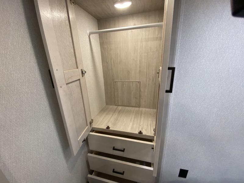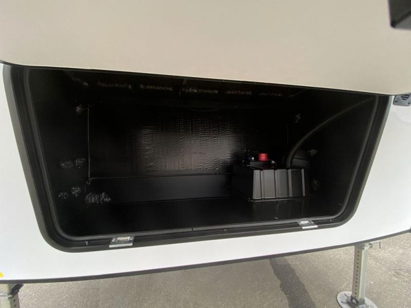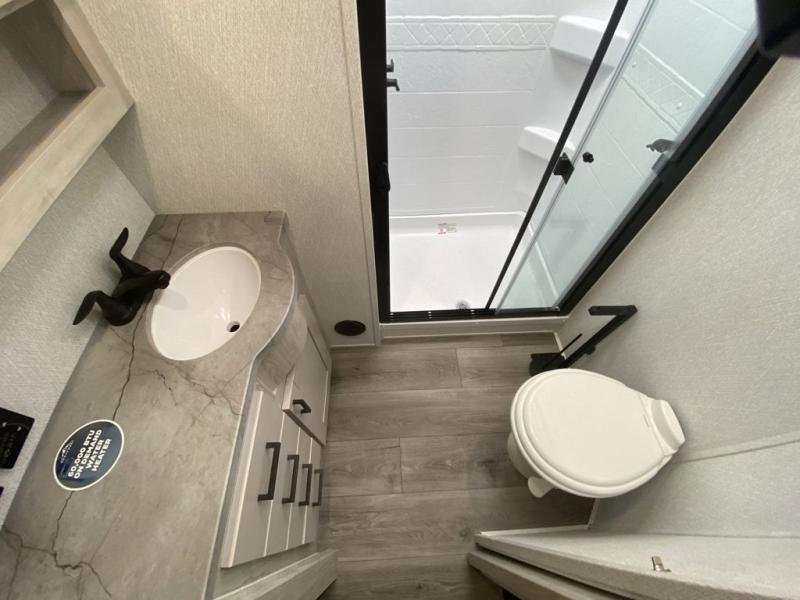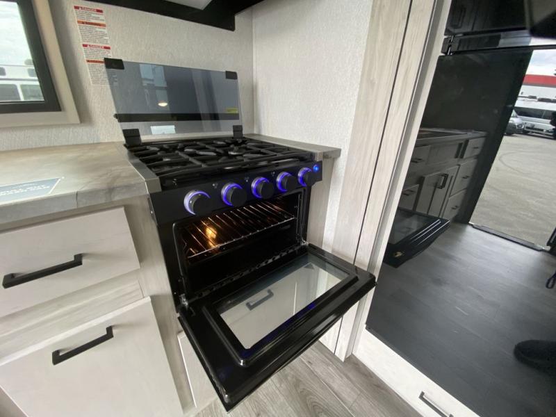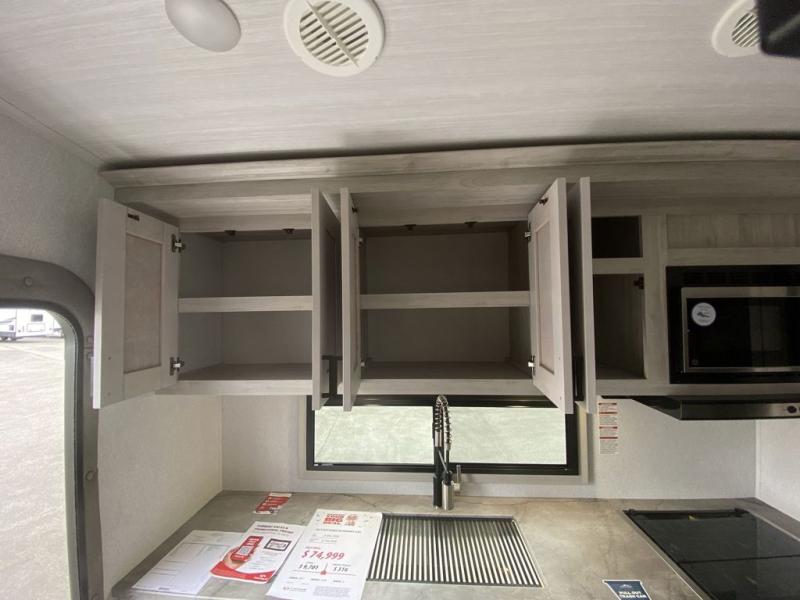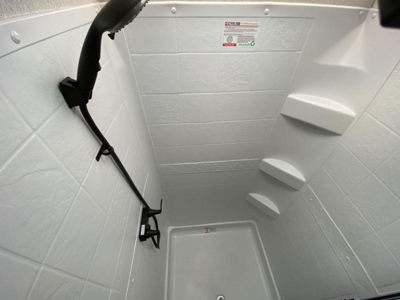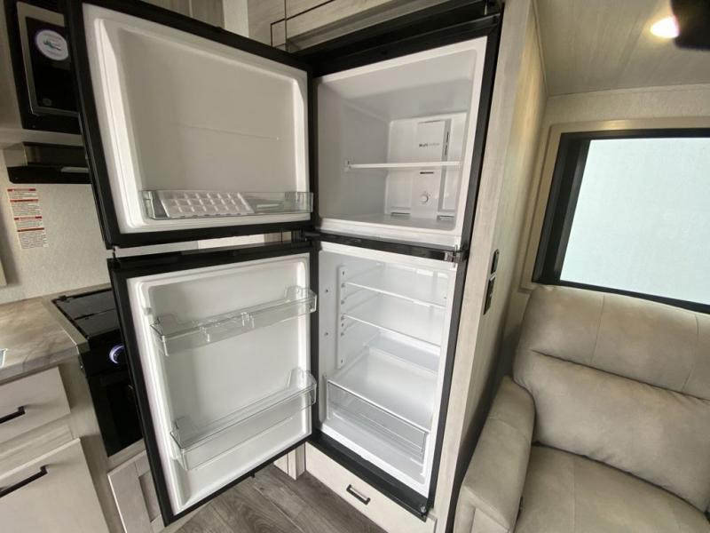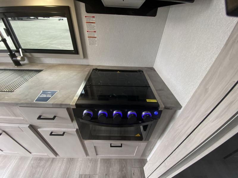 This fifth wheel is perfect for a couple who wishes to escape the hustle and bustle of everyday life! The front private bedroom has a king bed with storage underneath to store extra blankets and a TV prep area for extra entertainment. Freshen up each morning in the full bathroom with the 30" x 36" shower with a skylight for added natural lighting. The rear kitchen has everything you need to prepare your best home cooked meals and a 10 cu. ft. refrigerator to keep your perishables fresh. The booth dinette offers a comfortable place to enjoy your meals, play games, and even transform into an extra sleeping space. Across from the 78" theater seating is a 50" TV at the entertainment center above the dinette. You also have a shoe storage area and overhead cabinets throughout to keep your items out of the way!