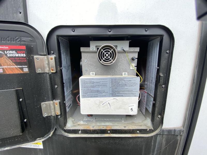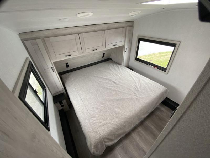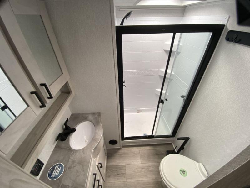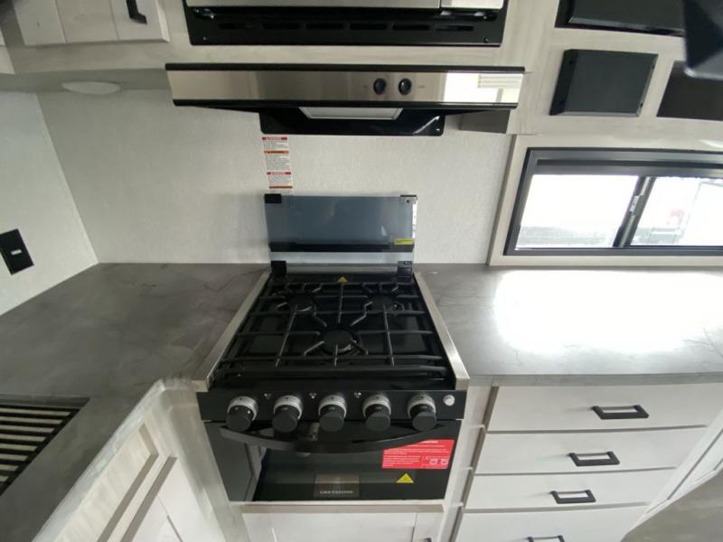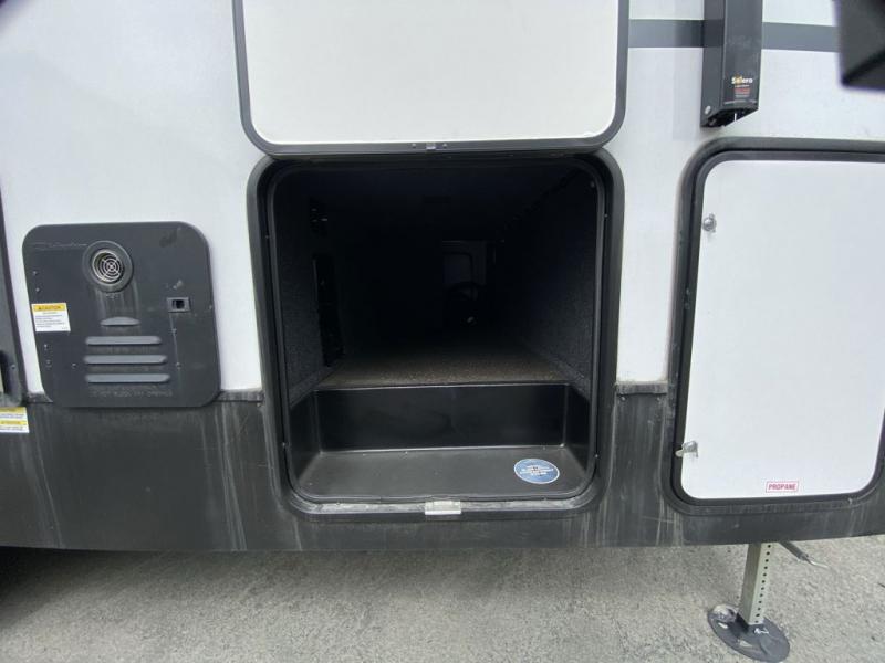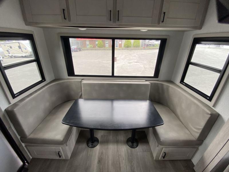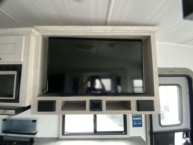 You and your spouse will have a comfortable time camping in this fifth wheel! The front private bedroom has a king bed with storage underneath to store extra blankets and a TV prep area for extra entertainment. Freshen up each morning in the full bathroom with the 30" x 36" shower with a skylight for added natural lighting. The kitchen has everything you need to prepare your best home cooked meals and a 10 cu. ft. refrigerator to keep your perishables fresh, plus a countertop extension for more prepping space. The U-shaped dinette offers a comfortable place to enjoy your meals, play games, and even transform into an extra sleeping space. Across from the 78" theater seating is a 50" TV at the entertainment center.