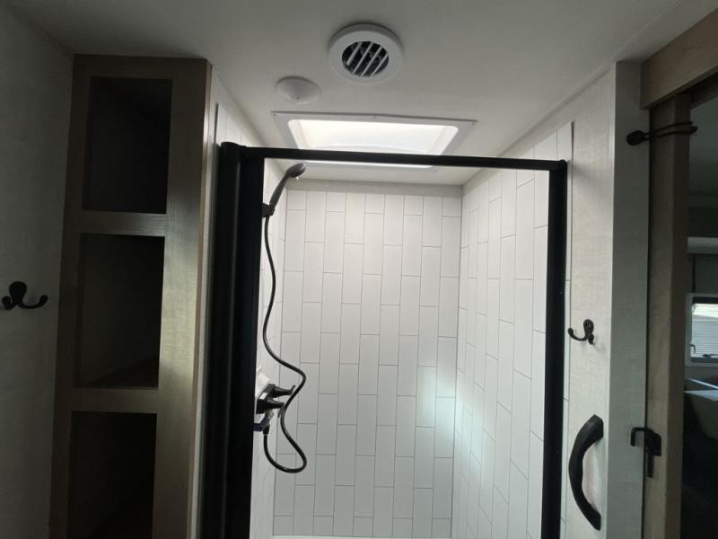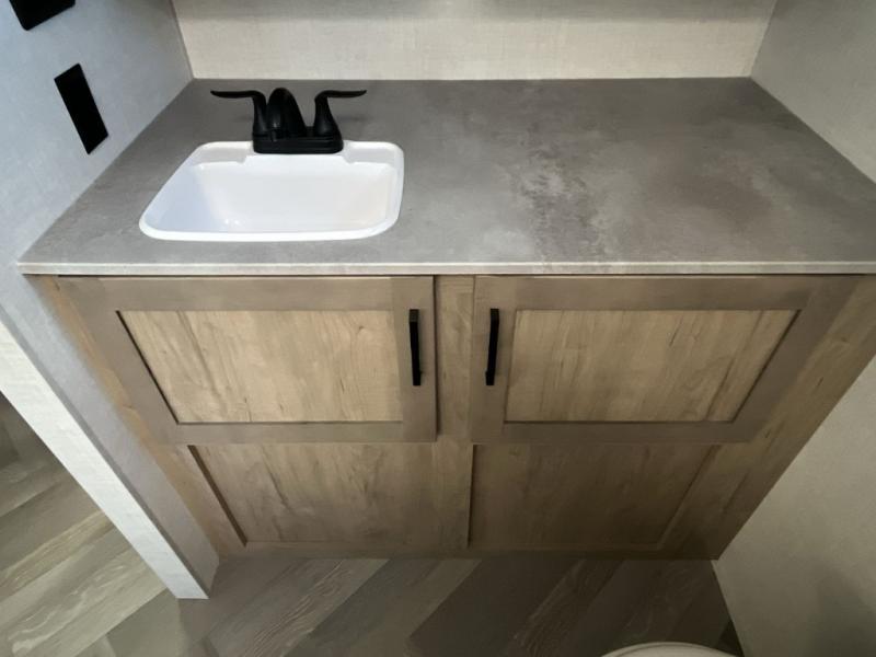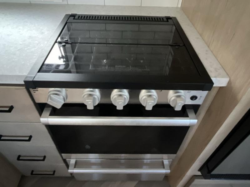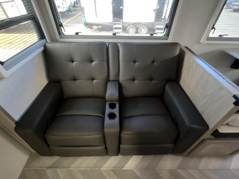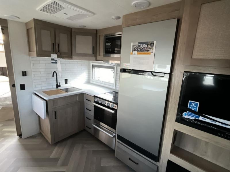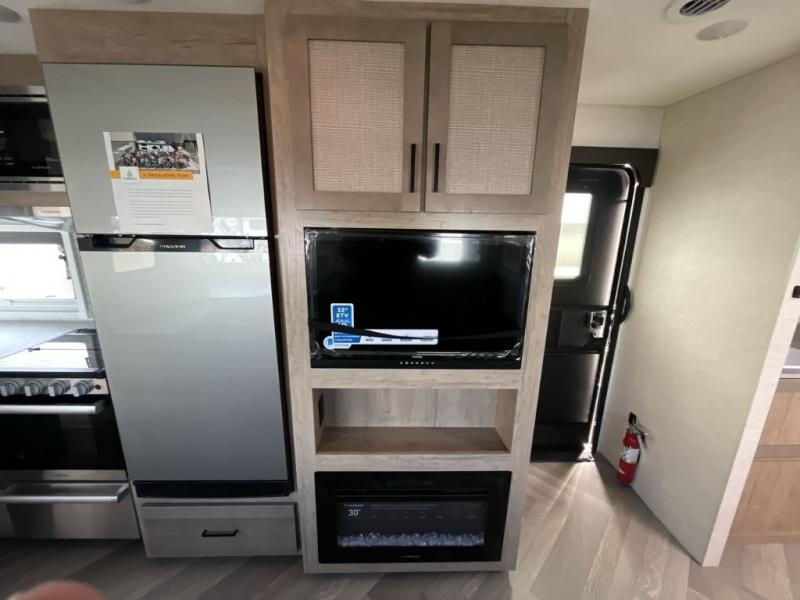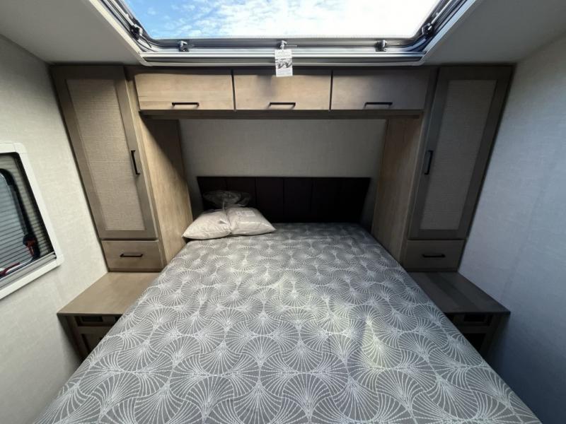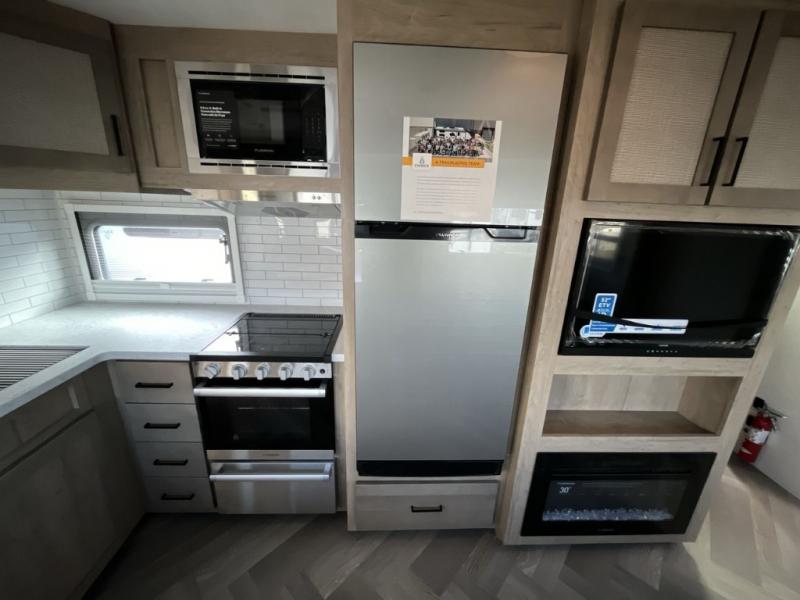 You won't want to camp any other way once you step inside this travel trailer! The front private bedroom will have you feeling right at home with the queen bed that has nightstands on either side and a "Stargazer" skylight above it, plus there is one of the dual entry doors to the unit so you can easily slip out for an early morning walk. After you get back, you can grab some eggs from the 12V refrigerator and fry them up on the three burner cooktop then eat them at the legless dinette or you can switch it out for an optional free standing table and chairs. There is also a flip-up countertop for more prep space and a convection microwave/air fryer the kids will love to use. The theater seating is directly across from the 12V LED HDTV and can also be switched out for an optional hide-a-bed sofa. Clean up in the full rear bathroom with the 30" x 36" shower after a fun filled day outdoors!