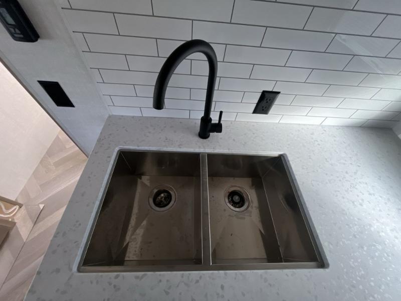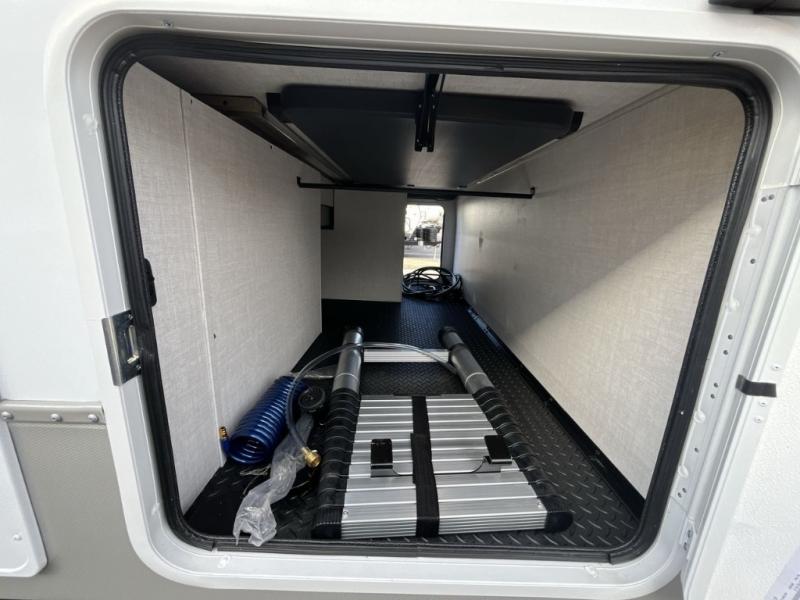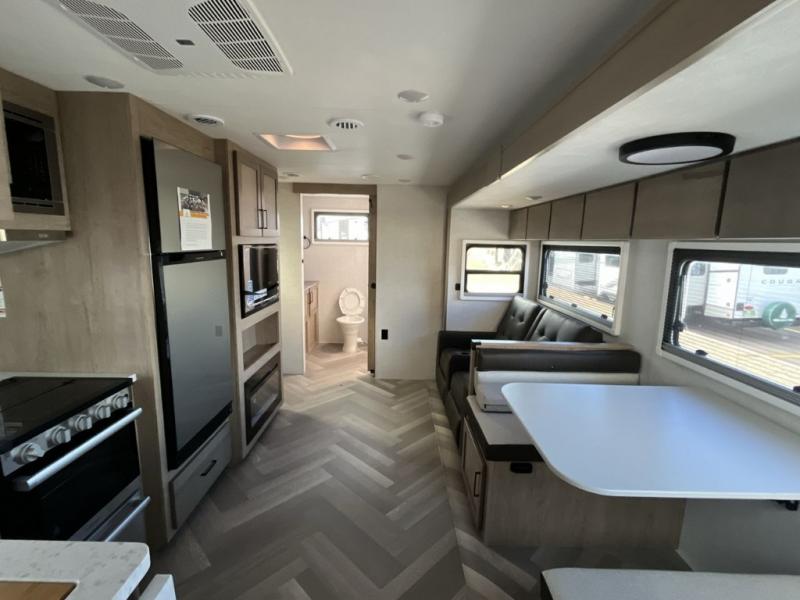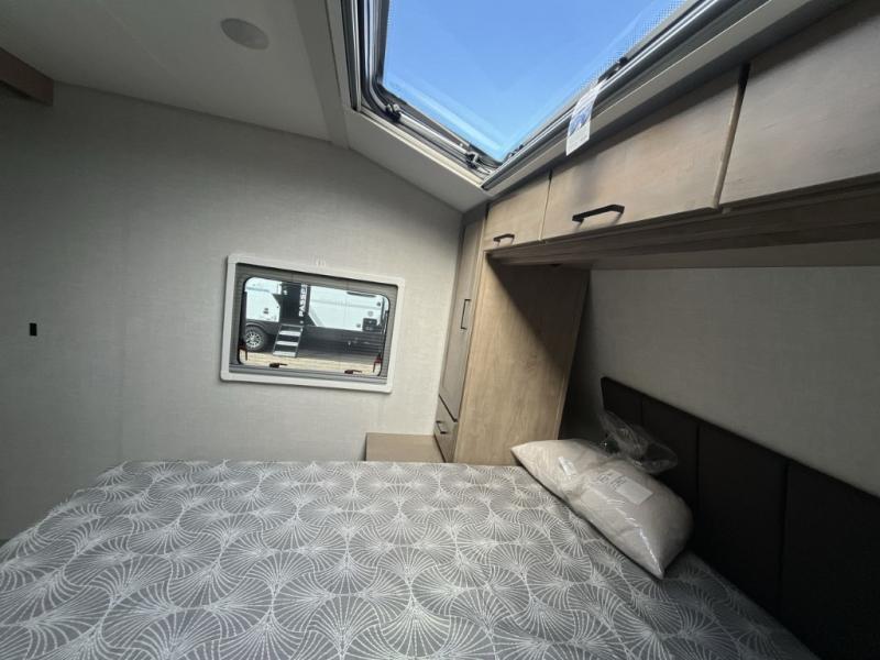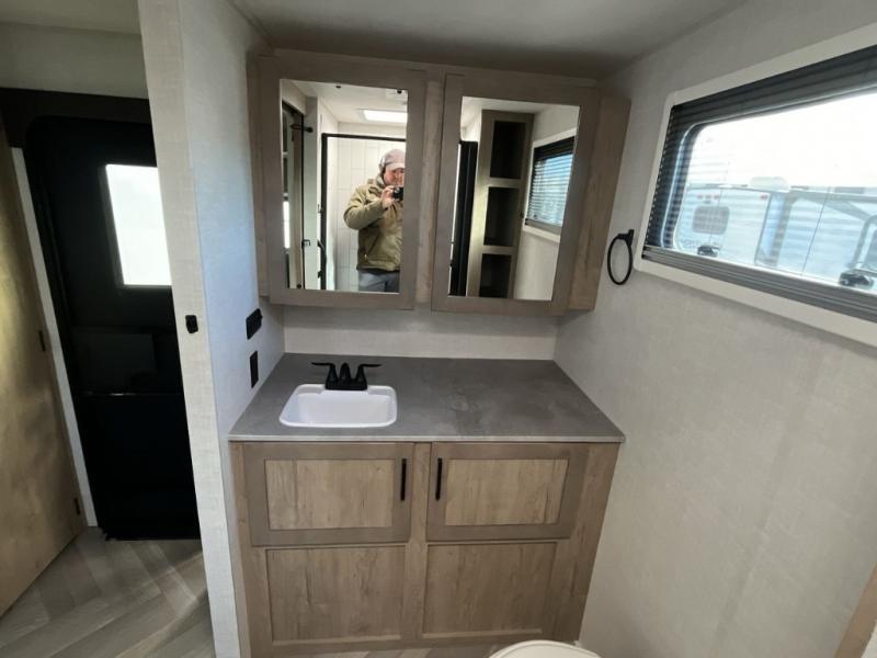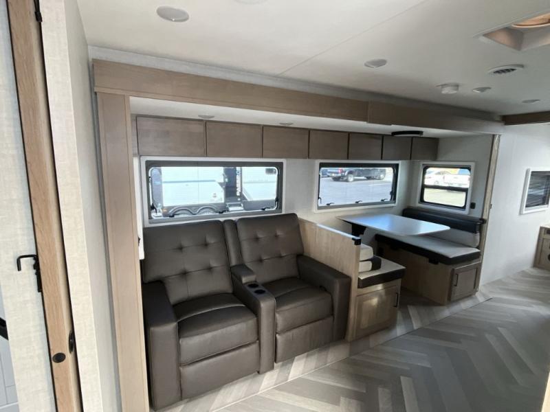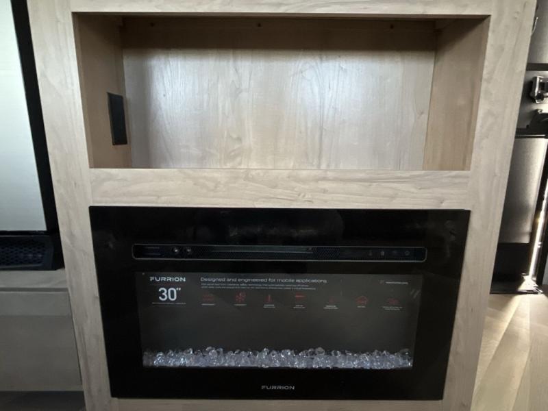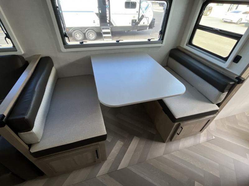 You won't want to camp any other way once you step inside this travel trailer! The front private bedroom will have you feeling right at home with the queen bed that has nightstands on either side and a "Stargazer" skylight above it, plus there is one of the dual entry doors to the unit so you can easily slip out for an early morning walk. After you get back, you can grab some eggs from the 12V refrigerator and fry them up on the three burner cooktop then eat them at the legless dinette or you can switch it out for an optional free standing table and chairs. There is also a flip-up countertop for more prep space and a convection microwave/air fryer the kids will love to use. The theater seating is directly across from the 12V LED HDTV and can also be switched out for an optional hide-a-bed sofa. Clean up in the full rear bathroom with the 30" x 36" shower after a fun filled day outdoors!