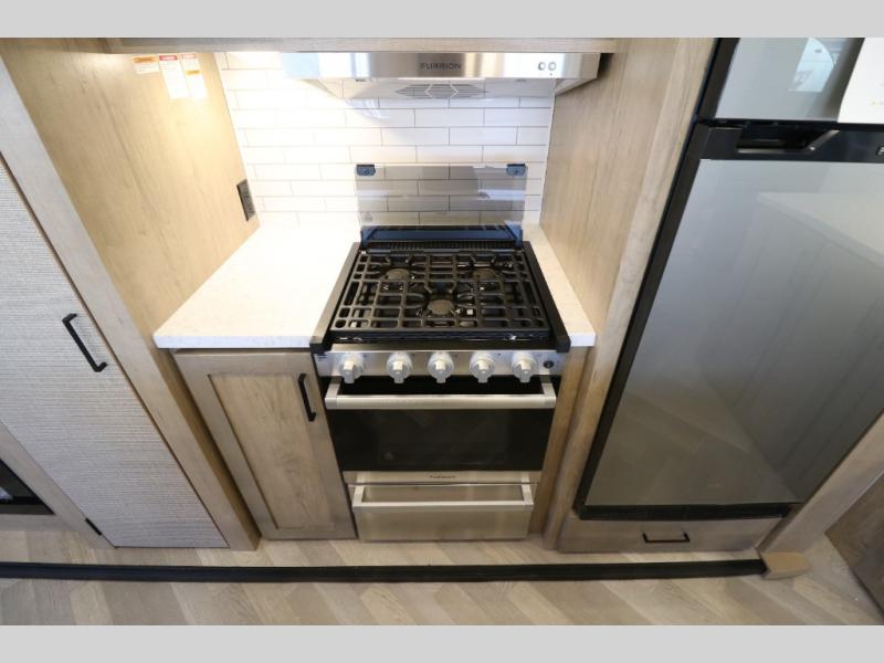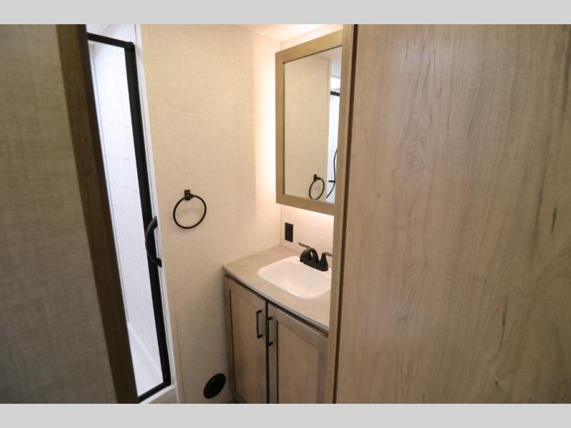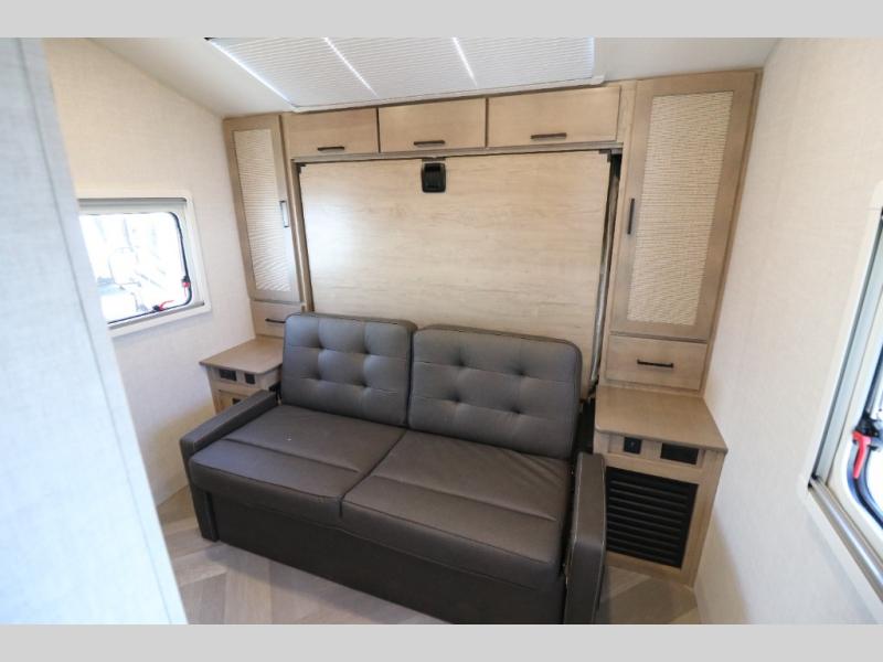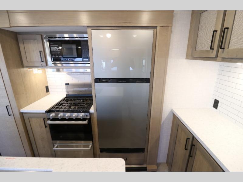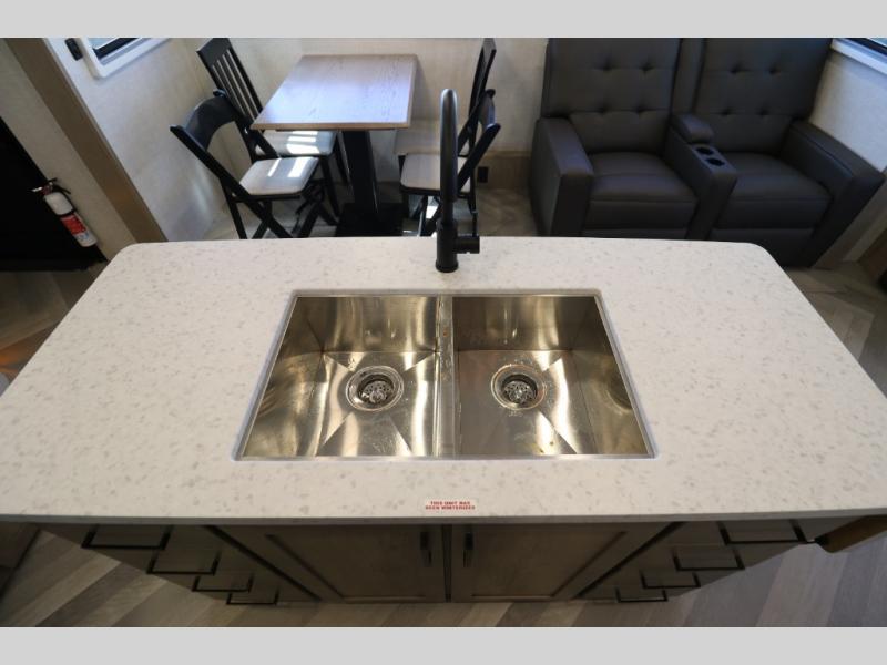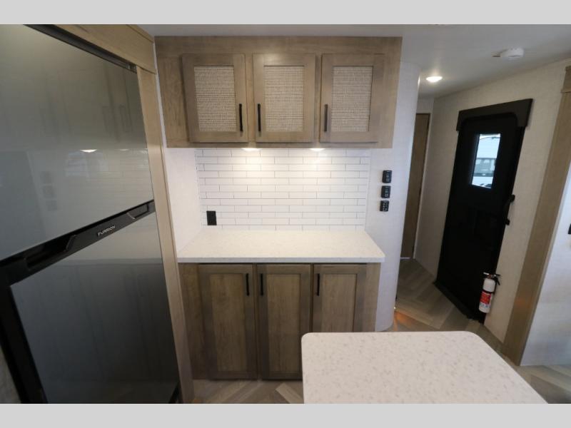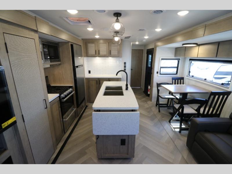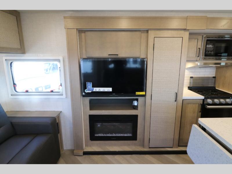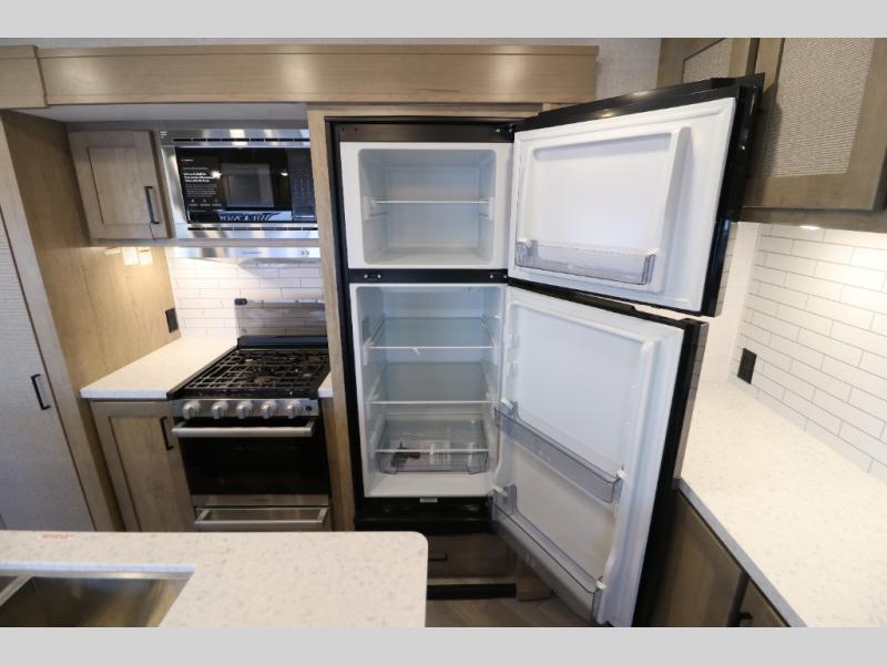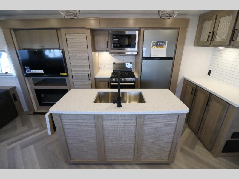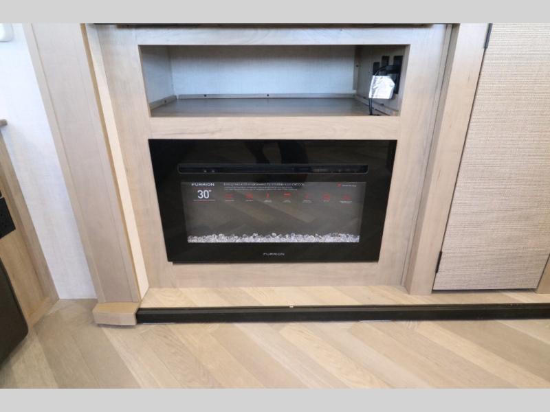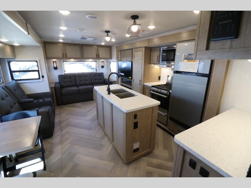 You're going to love the amount of space you have in this travel trailer with dual opposing slides in the main living area. You'll also find theater seating across from the 12V HDTV and fireplace, a free-standing table and chairs, and a hide-a-bed sofa where guests can sleep. The chef of your group will have a kitchen island with a flip-up countertop for ample space to prep food, plus a convection microwave/air fryer and coffee hutch that are sure to be a hit! You'll find plenty of counter space in the full bath, along with a medicine cabinet and a 30" x 36" shower with a Showermiser fresh water saver system. The front Ember Flex-Suite will provide you with your own space at night, and here you'll enjoy a queen Murphy bed at night and a jack-knife sofa during the day. There are also two removable tables in front of the sofa to make this area an office/den! This model also includes a wardrobe/linen closet with washer/dryer prep that will make full-time RV living easier than ever!