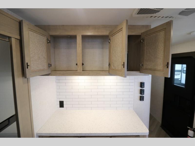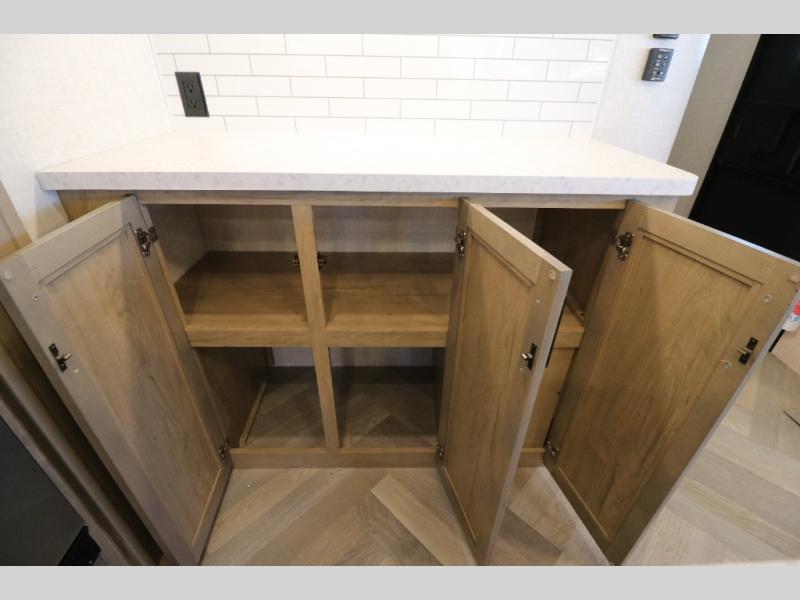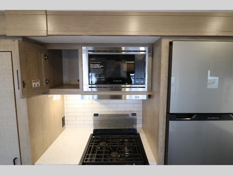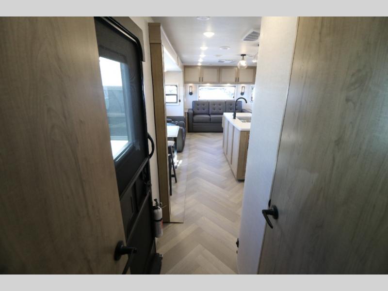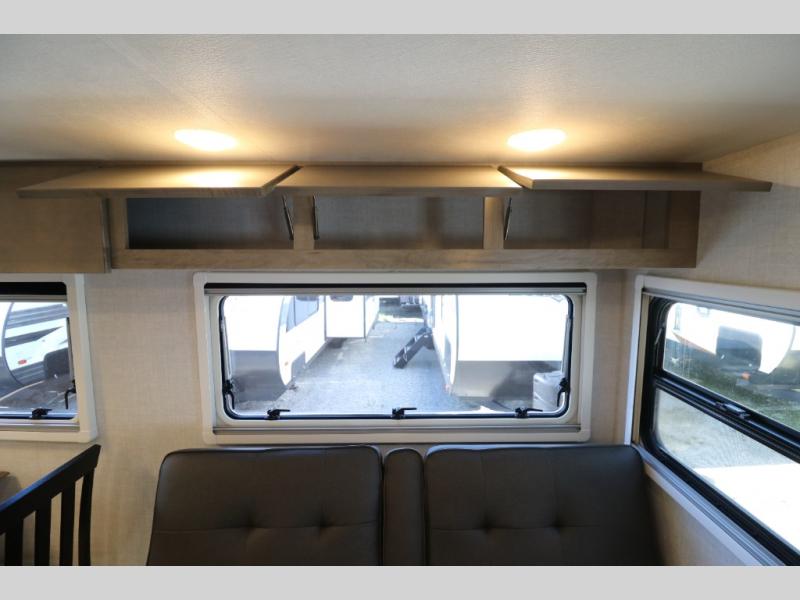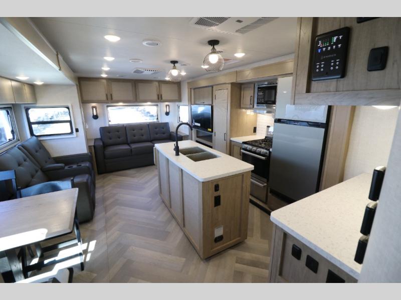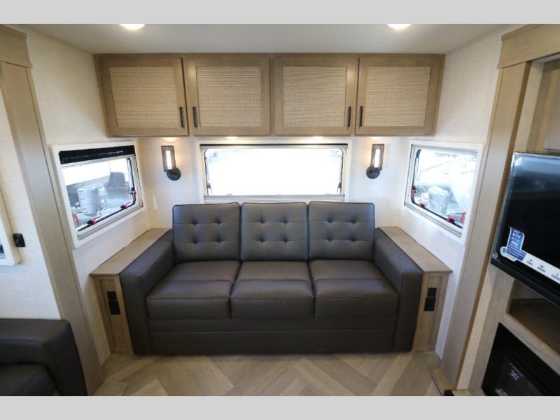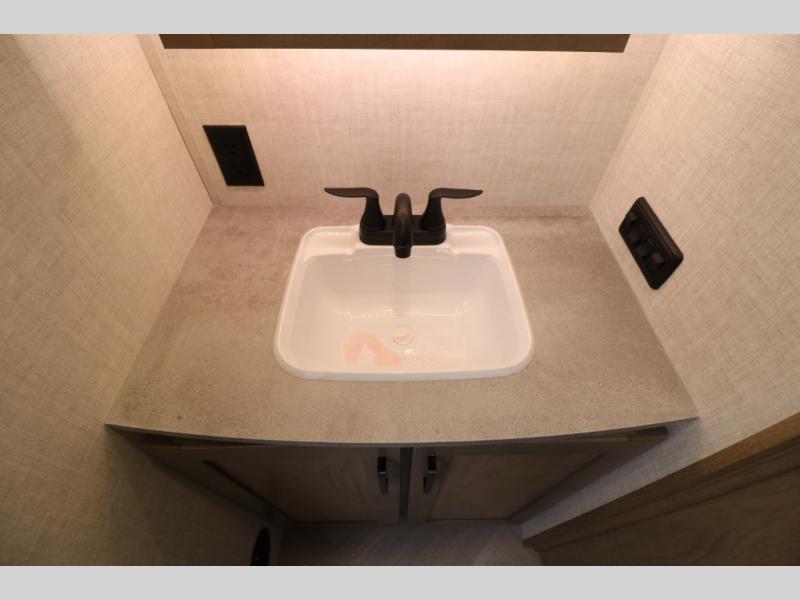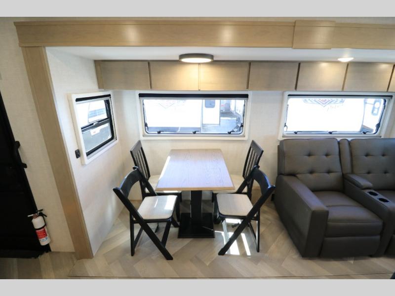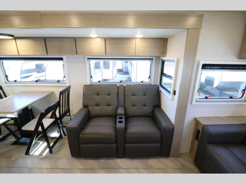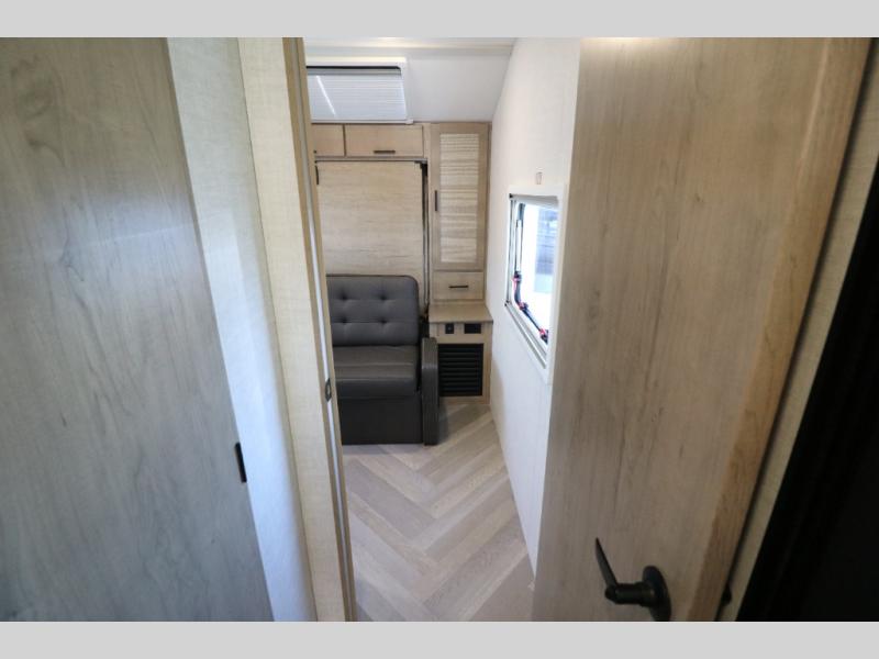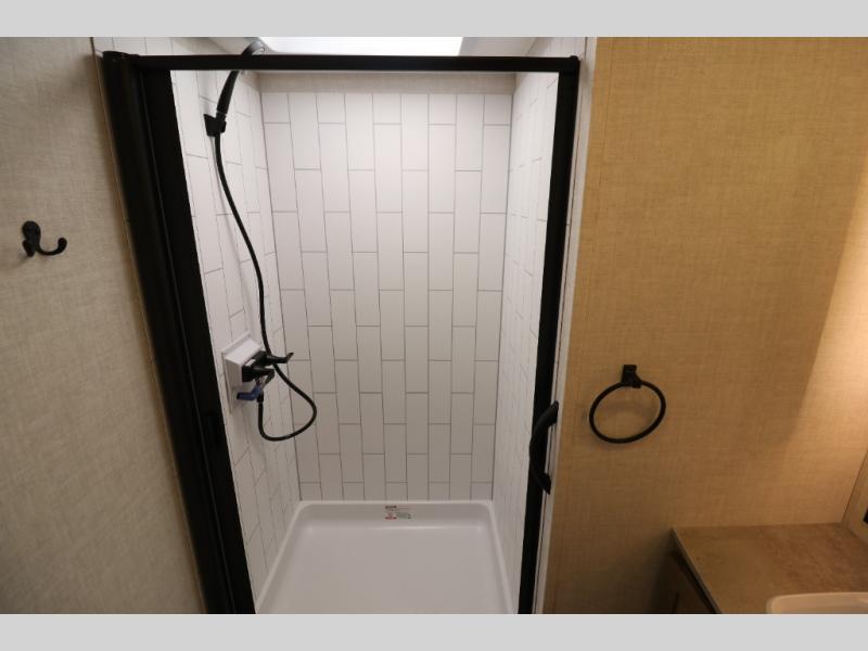You're going to love the amount of space you have in this travel trailer with dual opposing slides in the main living area. You'll also find theater seating across from the 12V HDTV and fireplace, a free-standing table and chairs, and a hide-a-bed sofa where guests can sleep. The chef of your group will have a kitchen island with a flip-up countertop for ample space to prep food, plus a convection microwave/air fryer and coffee hutch that are sure to be a hit! You'll find plenty of counter space in the full bath, along with a medicine cabinet and a 30" x 36" shower with a Showermiser fresh water saver system. The front Ember Flex-Suite will provide you with your own space at night, and here you'll enjoy a queen Murphy bed at night and a jack-knife sofa during the day. There are also two removable tables in front of the sofa to make this area an office/den! This model also includes a wardrobe/linen closet with washer/dryer prep that will make full-time RV living easier than ever!