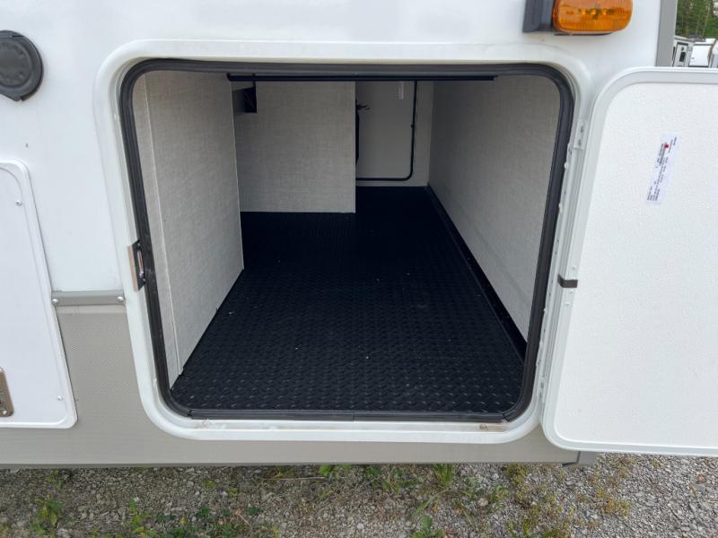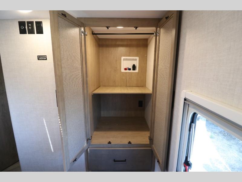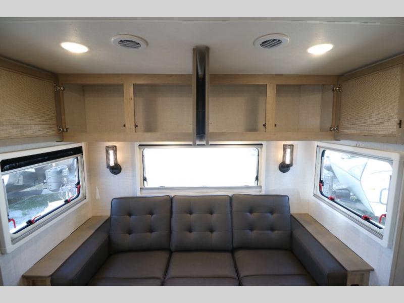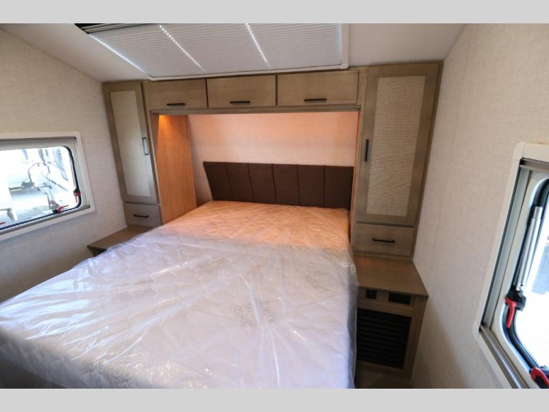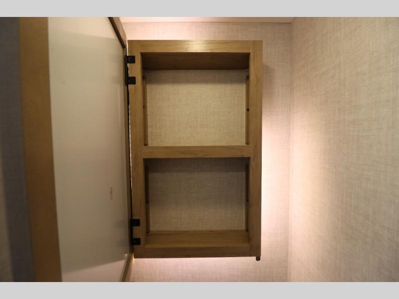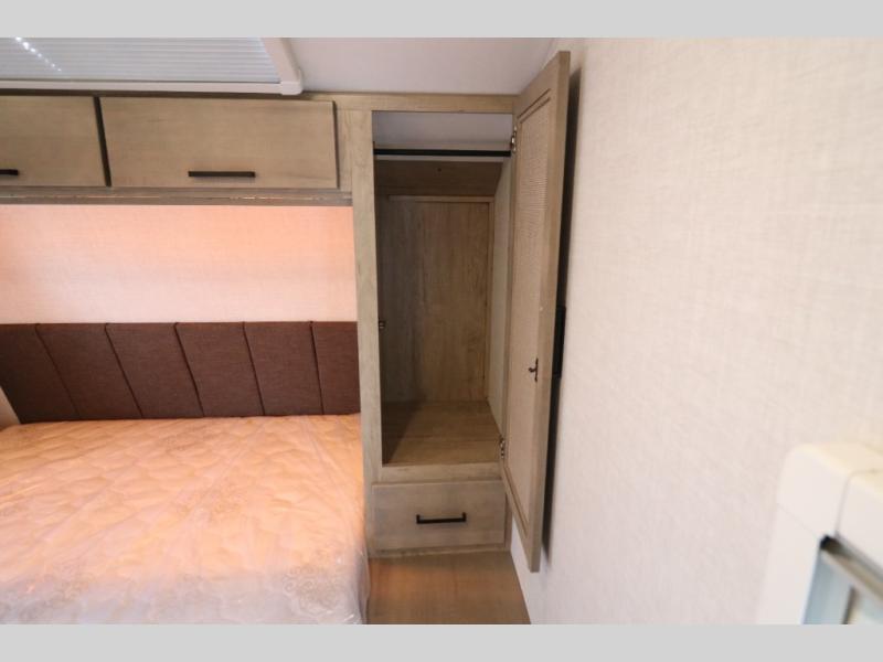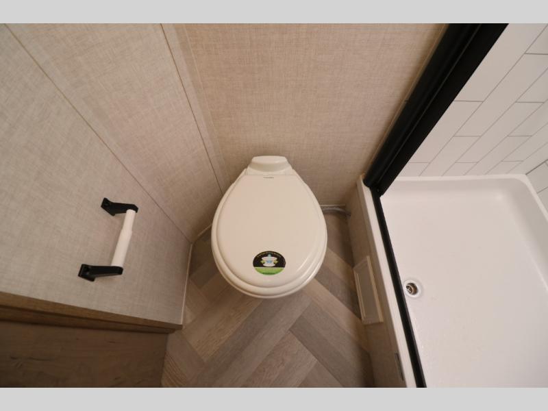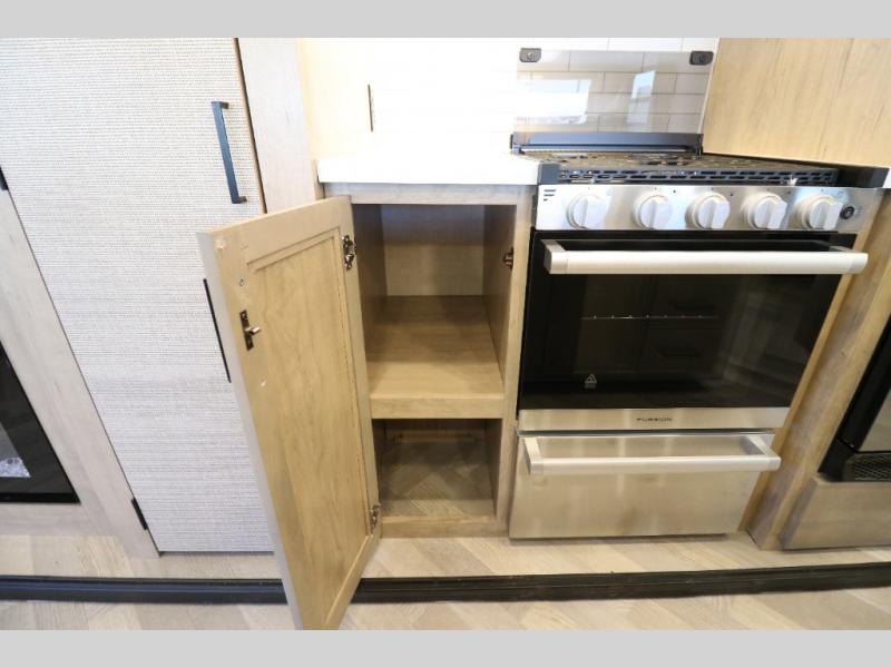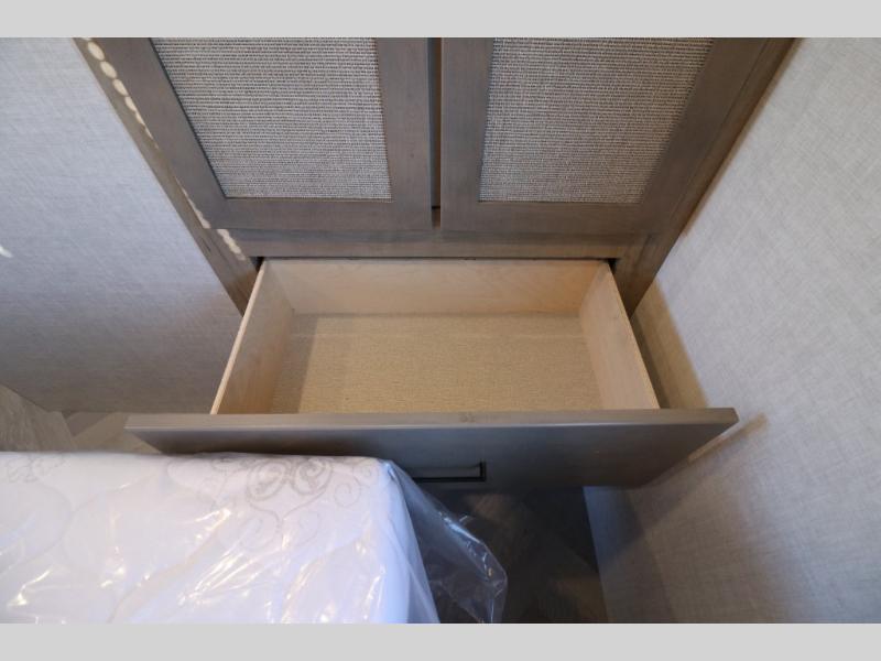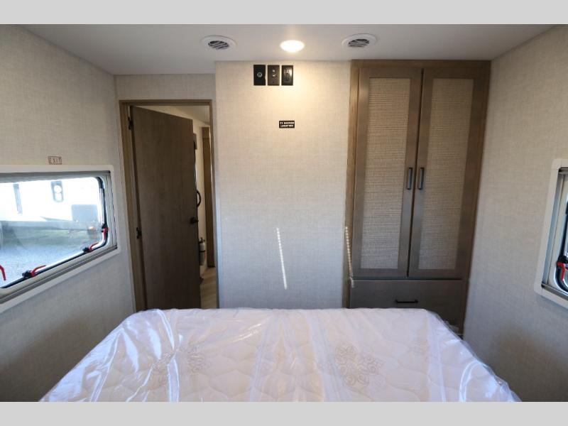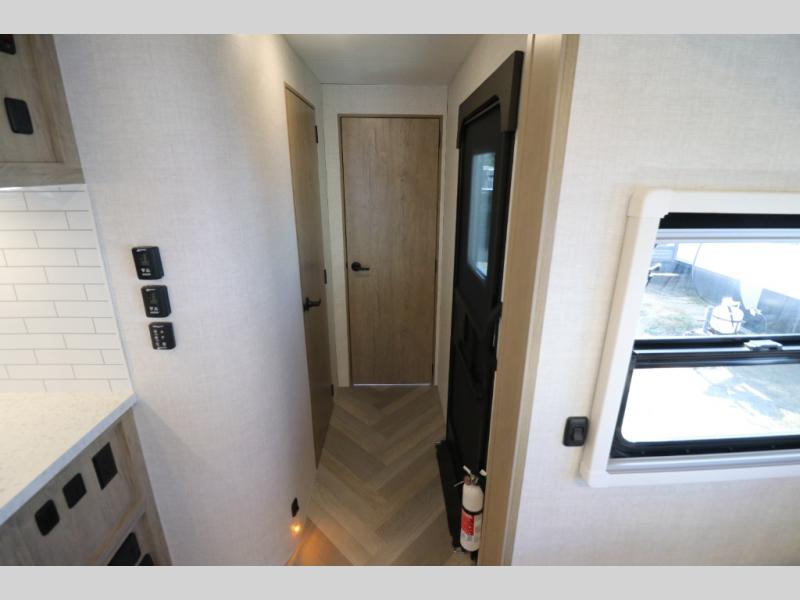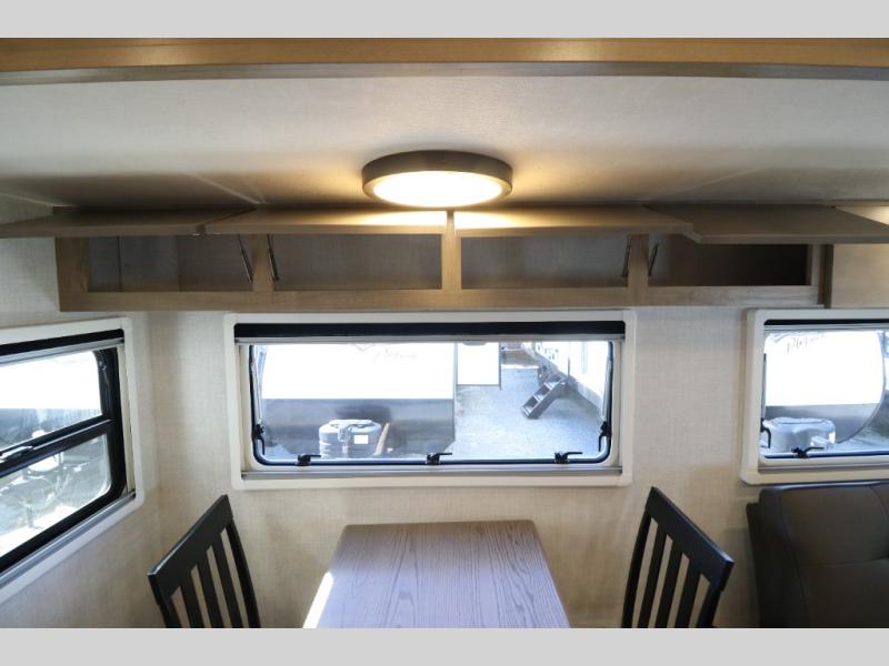 You're going to love the amount of space you have in this travel trailer with dual opposing slides in the main living area. You'll also find theater seating across from the 12V HDTV and fireplace, a free-standing table and chairs, and a hide-a-bed sofa where guests can sleep. The chef of your group will have a kitchen island with a flip-up countertop for ample space to prep food, plus a convection microwave/air fryer and coffee hutch that are sure to be a hit! You'll find plenty of counter space in the full bath, along with a medicine cabinet and a 30" x 36" shower with a Showermiser fresh water saver system. The front Ember Flex-Suite will provide you with your own space at night, and here you'll enjoy a queen Murphy bed at night and a jack-knife sofa during the day. There are also two removable tables in front of the sofa to make this area an office/den! This model also includes a wardrobe/linen closet with washer/dryer prep that will make full-time RV living easier than ever!