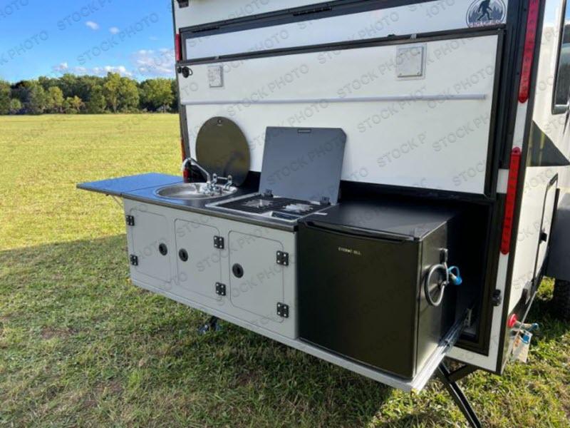 The largest model in the ROG lineup, the 16RB offers lots of space and convenience! A queen bed sleeps two people, and the 32" dinette table can be converted to an additional bed. The rear exterior kitchen is perfect for meal prep with a 1.7 cu. ft. refrigerator, sink, cooktop, and flip-up countertop extension, but if you'd like to grab a quick snack inside you can turn to the interior kitchenette with its larger 4.5 cu. ft. refrigerator, microwave oven, and beverage prep center. Storage throughout includes overhead cabinet as well as the EZ Breeze rear stowage door which has room for larger items like bicycles or kayaks. You can be sure everything stays in place by using the Stow & Secure bar and two tie-down rings. And if you need more cargo capacity, the optional roof rack system has five crossbars for a total capacity of 500 pounds.