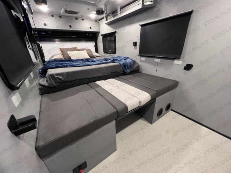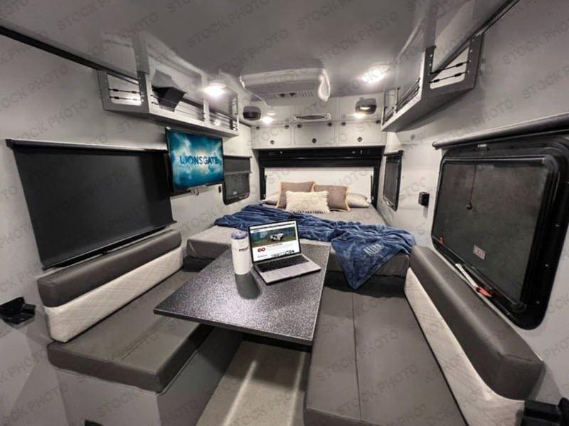 The Encore RV ROG travel trailer has a smaller size and a rugged design so that you can tow with ease and visit remote spots that other campers can't. While you go off-grid, you'll stay comfortable with the amenities provided by the ROG. The exterior is outfitted with aluminum wheels, four stabilizer jacks, an LP quick connect, under-frame amber glow lights, and multi-speed power roof vents. There are a couple of options that will entice you, like the optional roof rack system with 74" crossbars to help you transport some bikes or kayaks or the optional awning package that comes with side and rear awnings. Included as standard are USB charging ports that will help you keep your electronics full of power, and the vapor bond insulation will stop the cold or heat from disrupting your comfort level on the interior.
