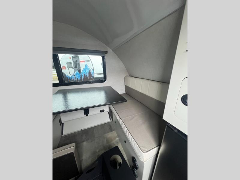 You and your spouse will enjoy the woods in this teardrop trailer! The convertible dinette transforms into an 80" x 48" bed so you can get a good night's rest after an adventurous day. The 12V power roof vent helps to circulate the air flow and the 21 gallon on-demand water system provides hot water quick. There are plenty of overhead aluminum cabinets throughout to keep your items out of the way. The entry door comes with a window and shade for added privacy or sunlight. Crank up the tunes with the Bluetooth stereo and stay connected with the TV/satellite/cable/HDMI prep. With 12V LED lighting, you will be able to see clearly day or night! Add the optional off-road package if you enjoy a little boondocking off the beaten path!