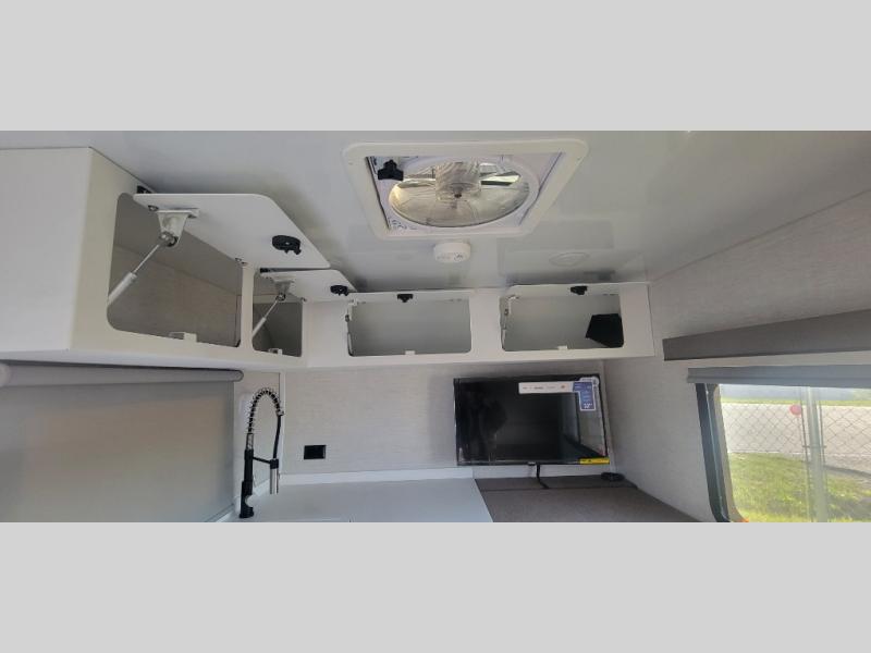 You and your spouse will enjoy the woods in this teardrop trailer! The convertible dinette transforms into an 80" x 48" bed so you can get a good night's rest after an adventurous day. The 12V power roof vent helps to circulate the air flow and the 21 gallon on-demand water system provides hot water quick. There are plenty of overhead aluminum cabinets throughout to keep your items out of the way. The entry door comes with a window and shade for added privacy or sunlight. Crank up the tunes with the Bluetooth stereo and stay connected with the TV/satellite/cable/HDMI prep. With 12V LED lighting, you will be able to see clearly day or night! Add the optional off-road package if you enjoy a little boondocking off the beaten path!