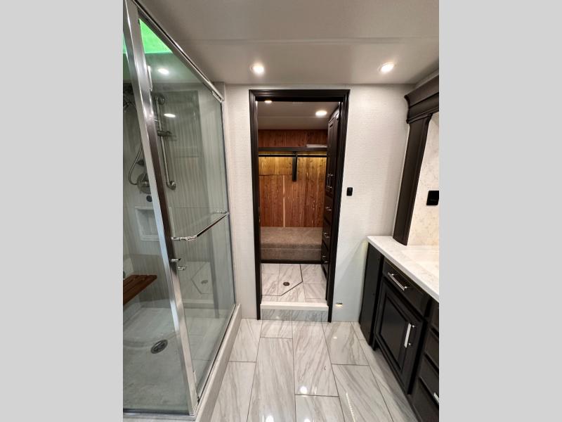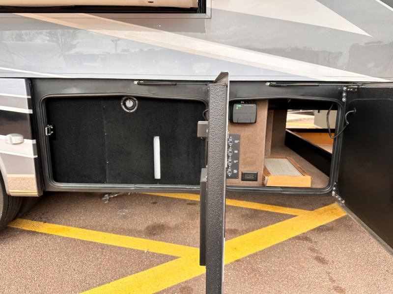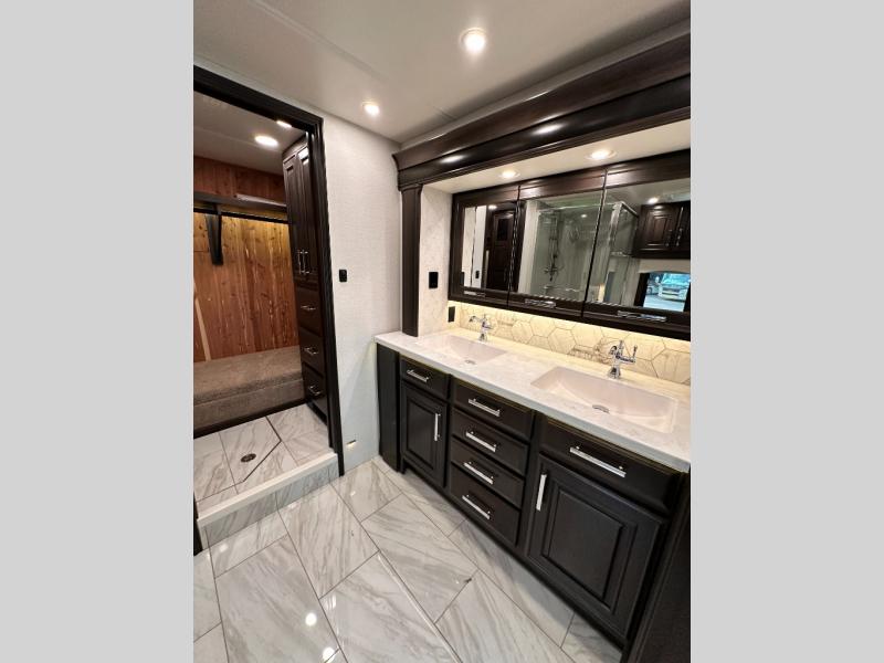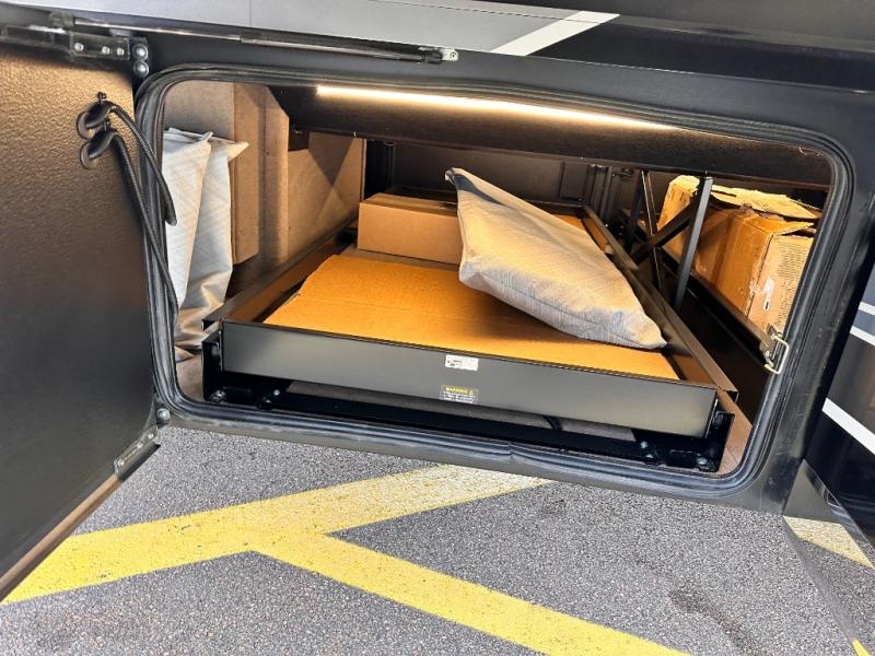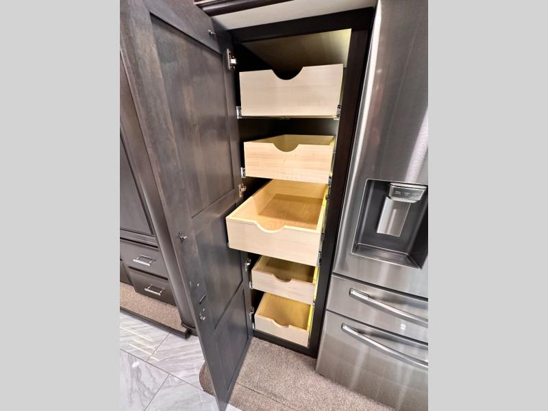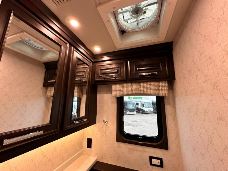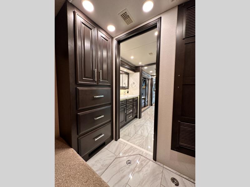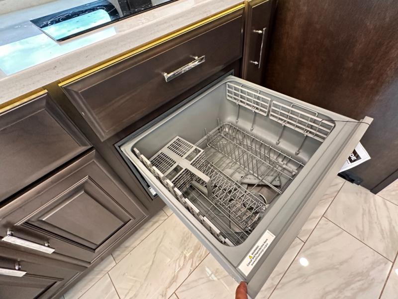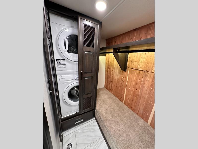 Comfortable traveling and living can be found in this coach with a master suite that includes a slide out king bed, dual wardrobes, drawers for storage and a 32" Smart TV, plus a full bathroom with a dual sink vanity like at home, and a huge walk-in wardrobe with more storage areas plus a washer and dryer to keep everything clean while away. There is a mid-coach half bath for convenience, and the combined living and kitchen area offers full kitchen amenities such as a convection microwave, a Fisher & Paykel dishwasher, slide-out storage tray(s) in the overhead cabinet, a buffet/table and two chairs to dine or work from, power theater seating to enjoy while watching one of two Smart TVs in this area, plus a hide-a-bed sofa. There are options to change out the furniture if you wish such as a booth dinette, a 74" sofa with ottomans, and/or another hide-a-bed sofa with the desk/fireplace entertainment center option.