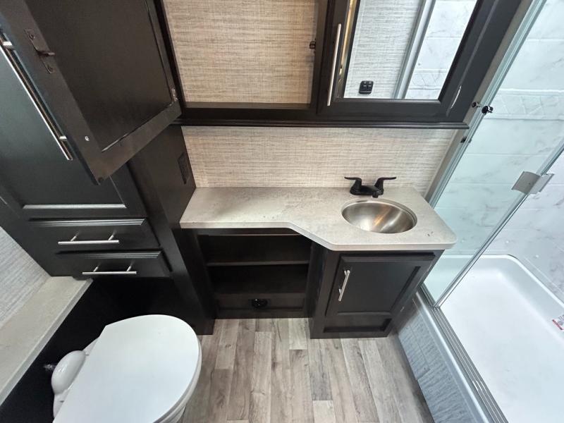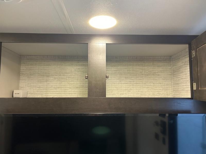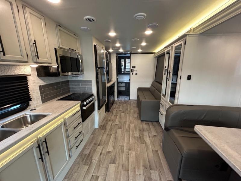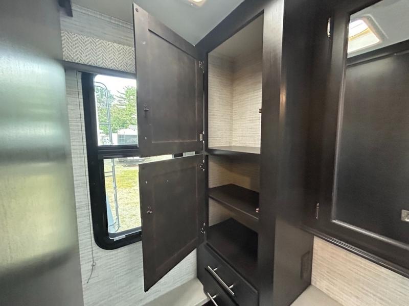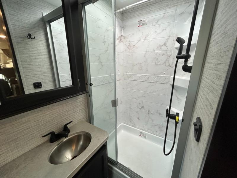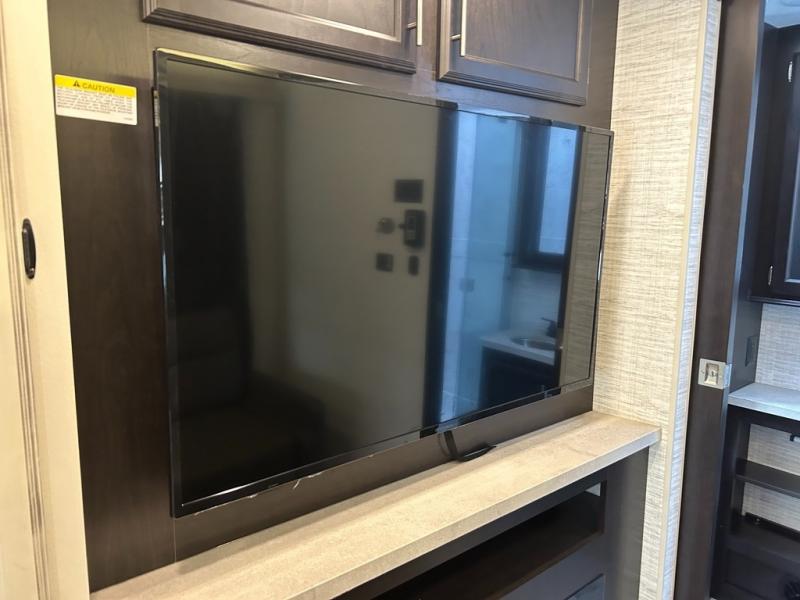 Enjoy a whole lot of comfort, fun and versatility in this coach! The queen Murphy bed and sofa combination allows you to convert between a living area and a bedroom, with a fireplace and an LED HD Smart TV. Outside, the exterior TV and 19' electric awning provide you an outdoor living space to enjoy nature and its beauty. The inside also provides a rear full bathroom including a space saving sliding door, linen storage, counter space for toiletries and a shower. You can dine at the U-shaped dinette or while sitting on the swivel captains chairs, and the cab-over bunk will be a perfect place to stay the night.