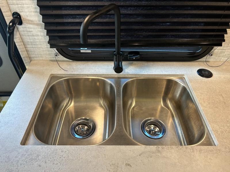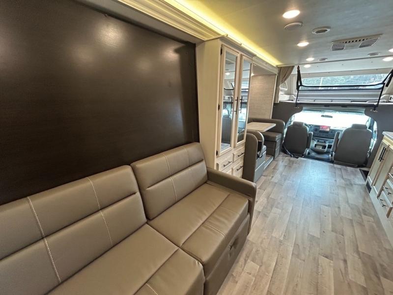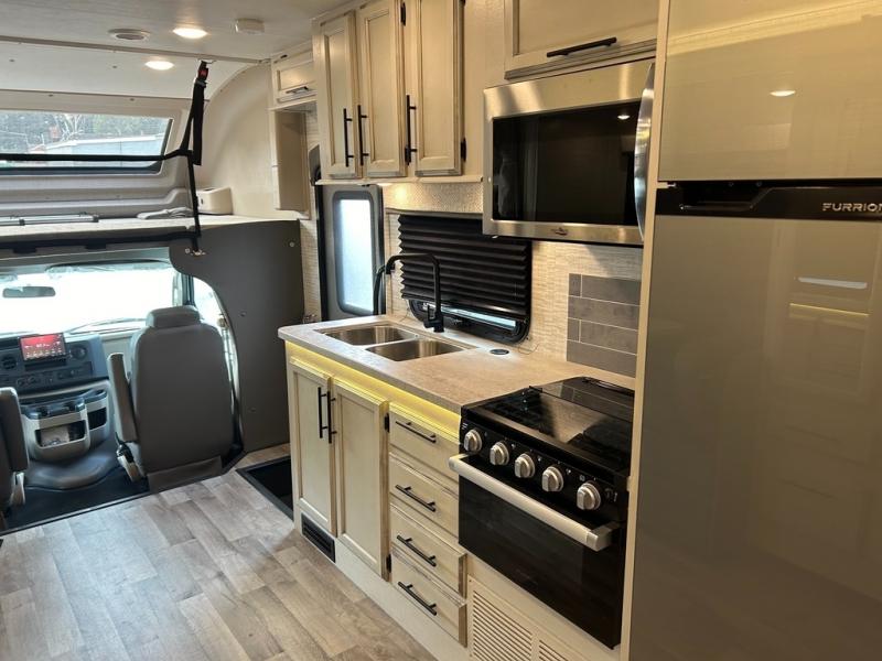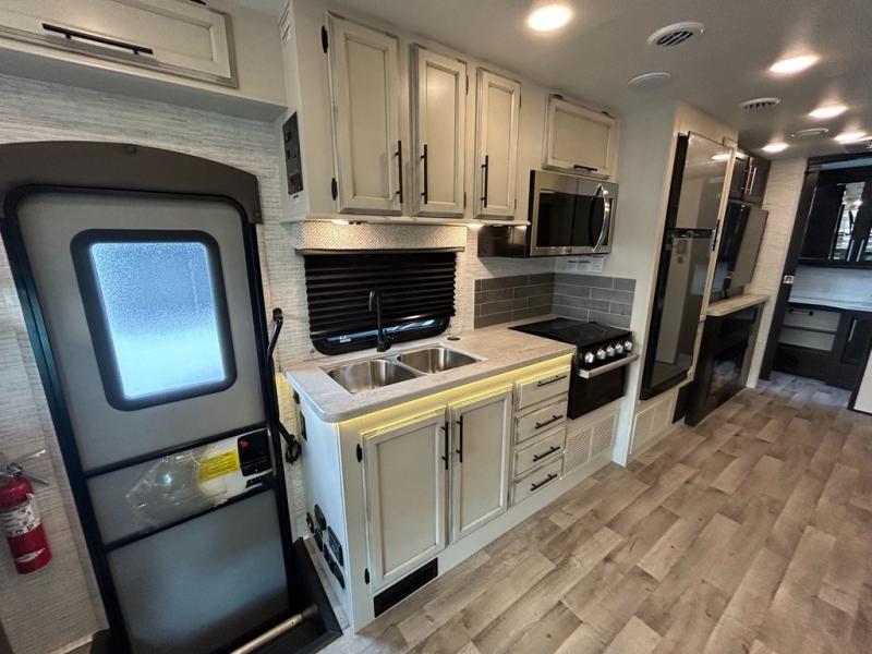 With any Odyssey Class C gas motorhome by Entegra Coach, the driver will appreciate the power from the 325 HP engine, the towing capacity from the 7,500 lb. hitch, the tire pressure monitoring system, the navigation from the Sony infotainment center with Apple CarPlay and Android Auto, plus the backup and side-view cameras when parking and driving down the highway. The kitchen offers full amenities including a recessed stainless steel sink with a cutting board sink cover, LED-lit pressed countertops, a decorative backsplash, and a pop-up charging station with 110 outlet and USB plugs to keep your smart phones charged. Get ready for luxury in a Class C, choose your favorite today!