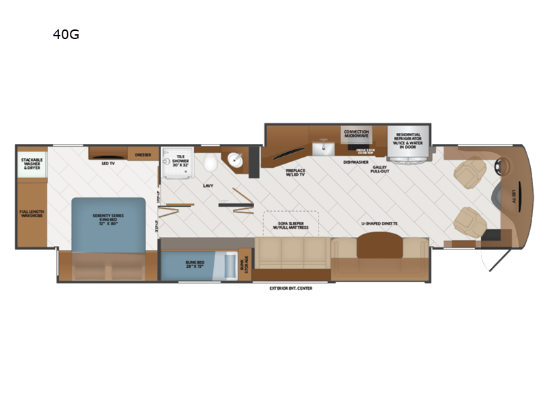 Wow! Check out this coach that can sleep eight for whole-family fun! The bunk beds are right across from the full bath for convenience, and there is even bunk storage for your guests' belongings and accordion doors so they can enjoy their own space. You can enter the full bath from the living area, the bunk area, or the rear master bedroom. Now, that's convenient! After a great night's rest on the king bed, choose your outfit from the full-length wardrobe, and start a load of laundry in the stackable washer and dryer. Head to the kitchen to prepare breakfast on the two burner induction cooktop, or use the convection microwave. There is also a dishwasher here for easy clean-up and a residential refrigerator with ice and water in the door. Your crew will love hanging out in the main living area that includes a theater sofa, a U-shaped dinette, and a fireplace with a LED TV!