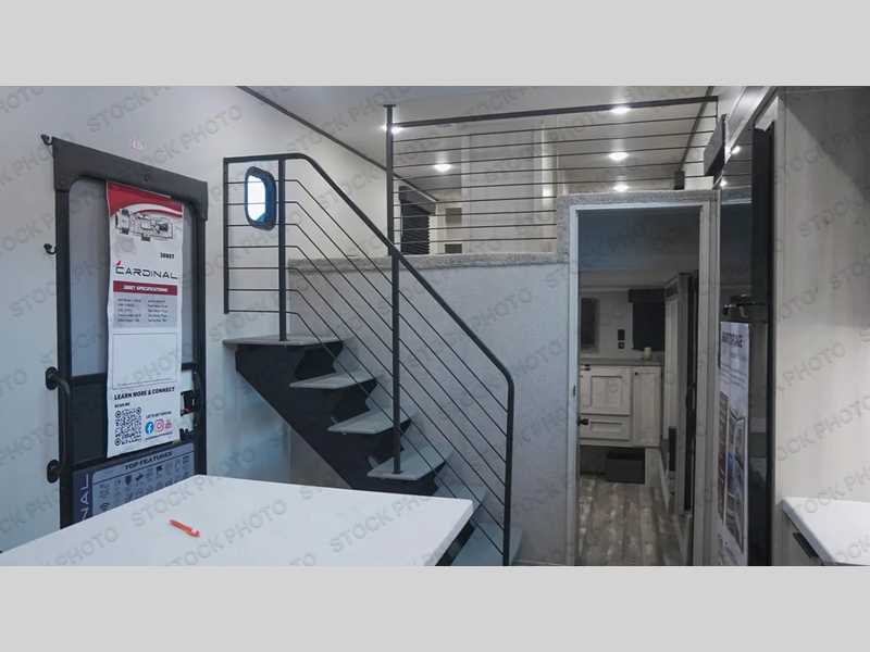 Your neighbors, family, and friends will be begging you to take them on camping trips in this Cardinal fifth wheel! They will have their own rear private bedroom/den in the back with two sofas and a hidden Murphy bed inside the entertainment center. One of the two full baths is within this room for added convenience, and the stairs leading up the loft will be the perfect place for little ones or storage. You'll find the front private bedroom to be accommodating with its king bed slide out, closet with sliding doors, plus washer and dryer prep. The middle kitchen includes an island peninsula with five stools, dual opposing slides for added space, plus all the appliances to cook and store food. There is also an L-shaped dinette for more dining space! One feature that is sure to stand out on this model is the dual entry doors on opposite sides of the unit for a smooth flow of traffic!