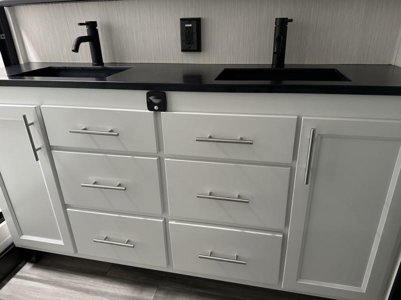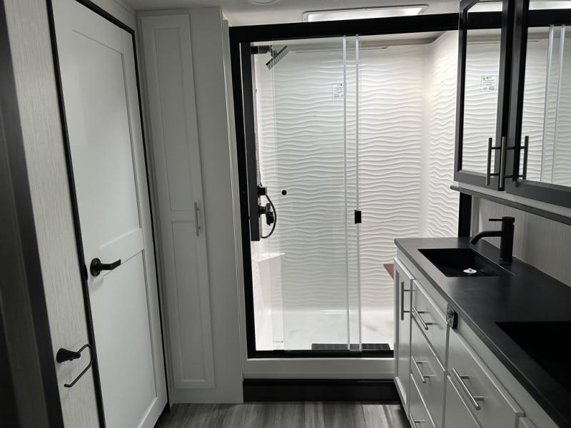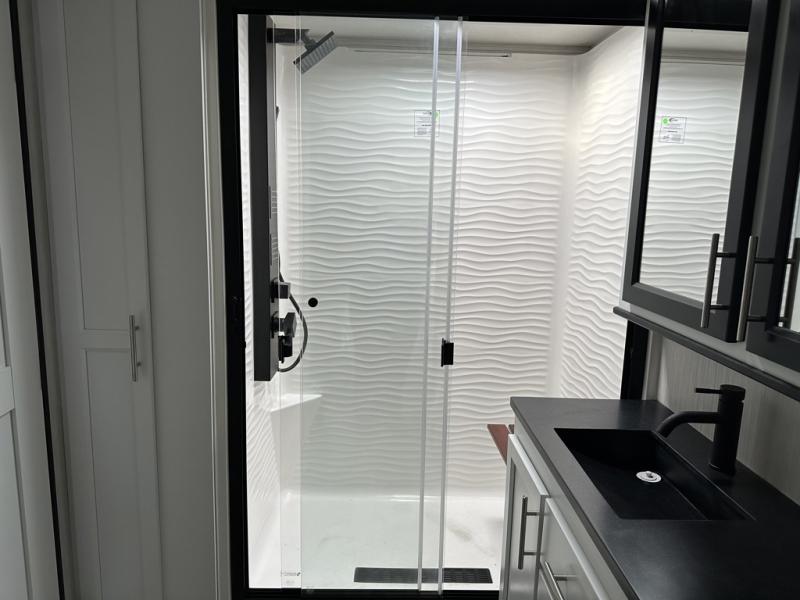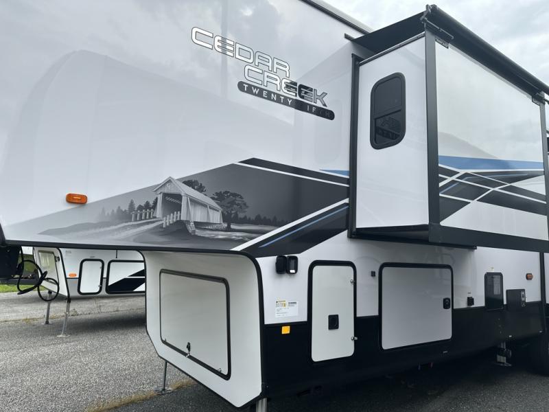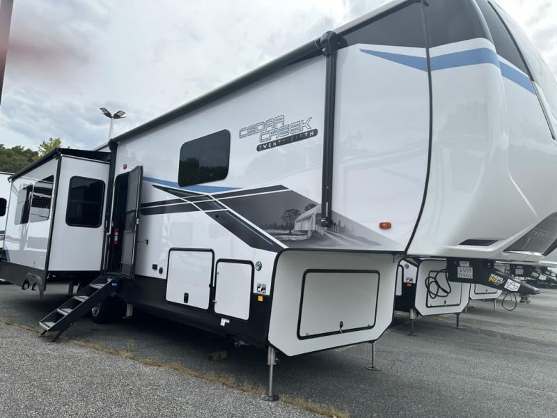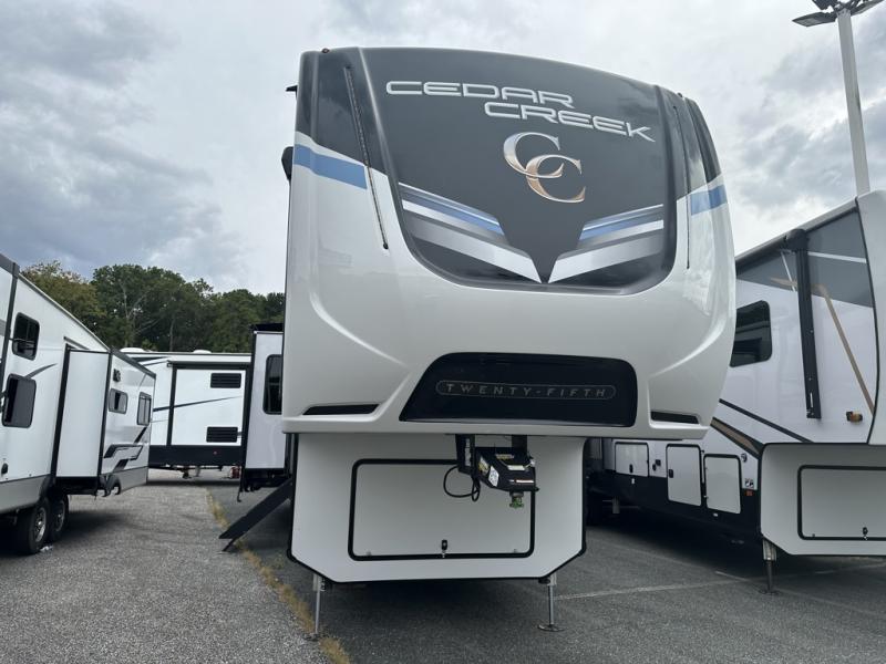 With any Cedar Creek fifth wheel by Forest River, you will find a quality-built RV with your comfort in mind! The all-aluminum super structure on 16" centers or less will provide a solid foundation to your fifth wheel, and the VIXENITE waterproof composite slide floors will hold up over years of use. Each model also includes black textured metal skirting, a TST tire pressure monitor system, and Cradlepoint Day 1 Wi-Fi connectivity so you can stay connected while you camp. A Lippert Gen 3 Leveling System makes setting up camp easier than ever, and the 200 watt solar panel means you can enjoy some off-grid capabilities. Head inside to find upgraded solid surface countertops, floating steps to the upper deck, USB ports, and updated backsplash that is modern and eye-catching. You will also enjoy new in-wall storage in the bedroom for books or personal belongings, a new V-Flo cordless vacuum for easy clean up, a redesigned shower with LED lighting and a fold-down bench, and many more luxuries!