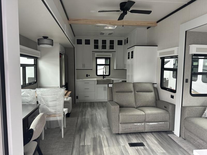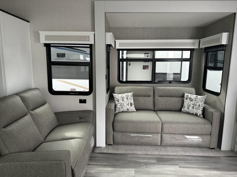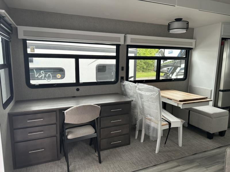 If you need to get some work done while you are camping in this fifth wheel then you will appreciate the desk with a chair! The rear kitchen has plenty of countertop space and a three burner cooktop to cook your best meals, a 20 cu. ft. 12V refrigerator with an ice maker to store any leftovers, and a wall mounted dining table with an extension and an ottoman. The hide-a-bed sofa slide opens up the living area which also has power theater seating across from an entertainment center with a fireplace and TV. The half bathroom has a closet with washer/dryer prep so you can have clean clothes throughout your entire trip. Inside the master suite is a king bed slide and access to the front full bathroom which has a walk-in closet, a shower with a seat, and a dual sink vanity for two to get ready at once.