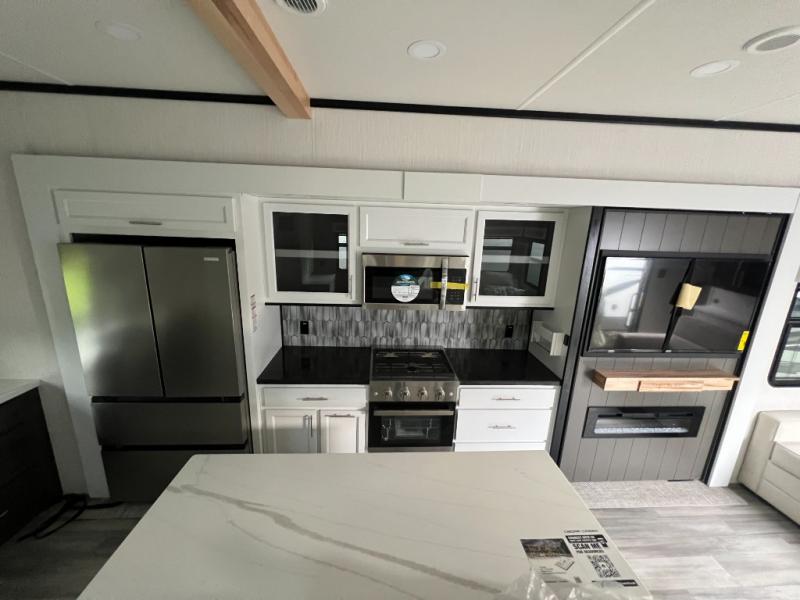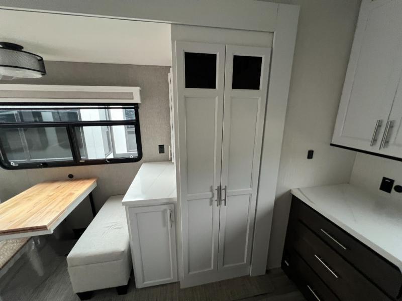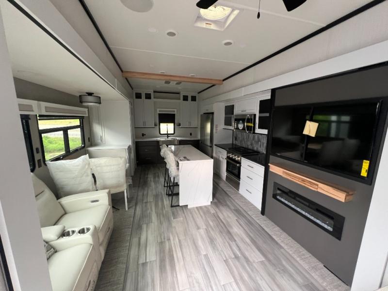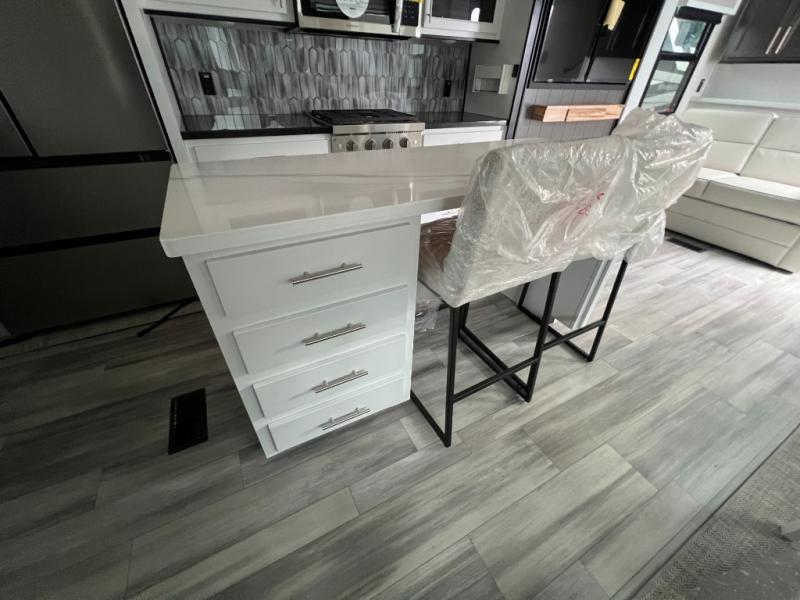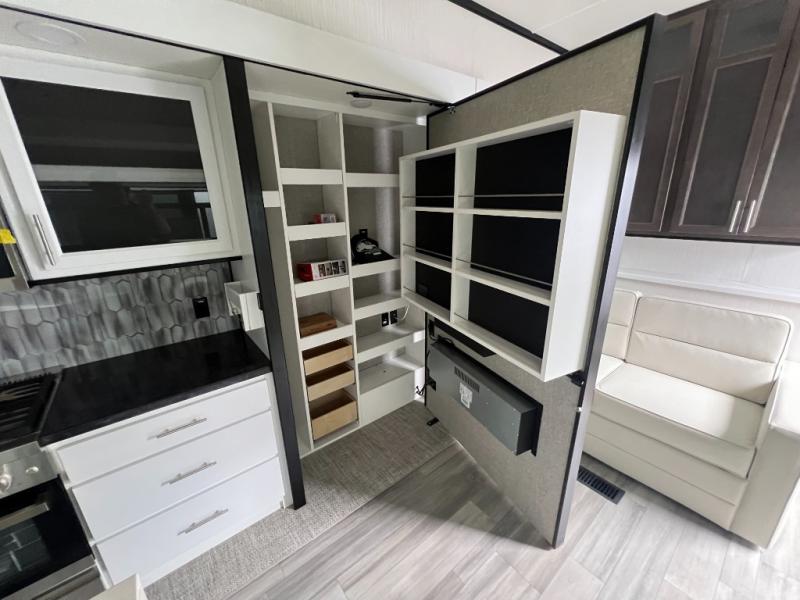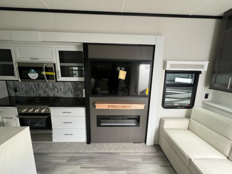 It will feel like coming home each time you take this fifth wheel out! The dual opposing slides in the main living area make your space open, and the waterfall island with two stools will be the perfect place to prep meals, dine together, or set out snacks for movie night! You will also love the rear counter space with a large sink to clean up each day and there is a dishwasher option if you want the option to make the process even easier. A tri-fold sofa in the main living area will provide a place for a guest or two to sleep, and the Murphy pantry hidden behind the entertainment center and fireplace will keep snacks stocked up. The full bath includes a shower with a seat, dual bath sinks, plus a linen closet to keep towels tidy. What could make this fifth wheel better than a king bed slide out in the front bedroom?! How about a large wardrobe with washer/dryer prep, a dresser with a TV above, and overhead storage for belongings!